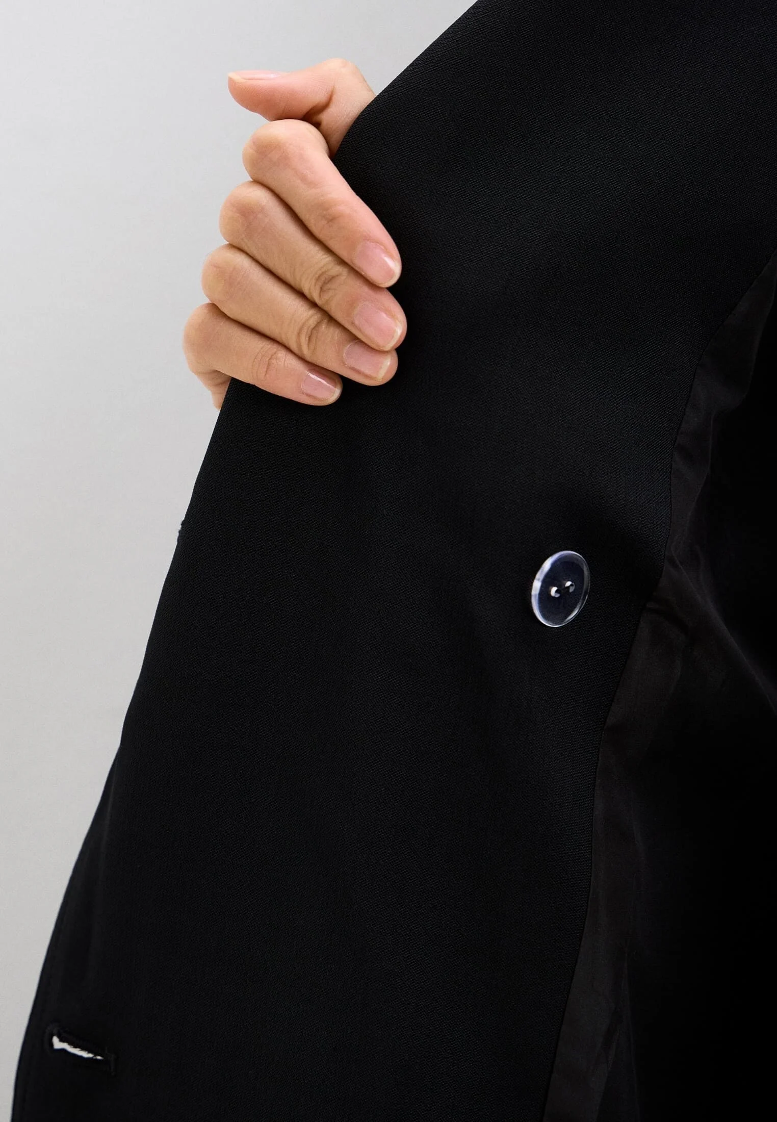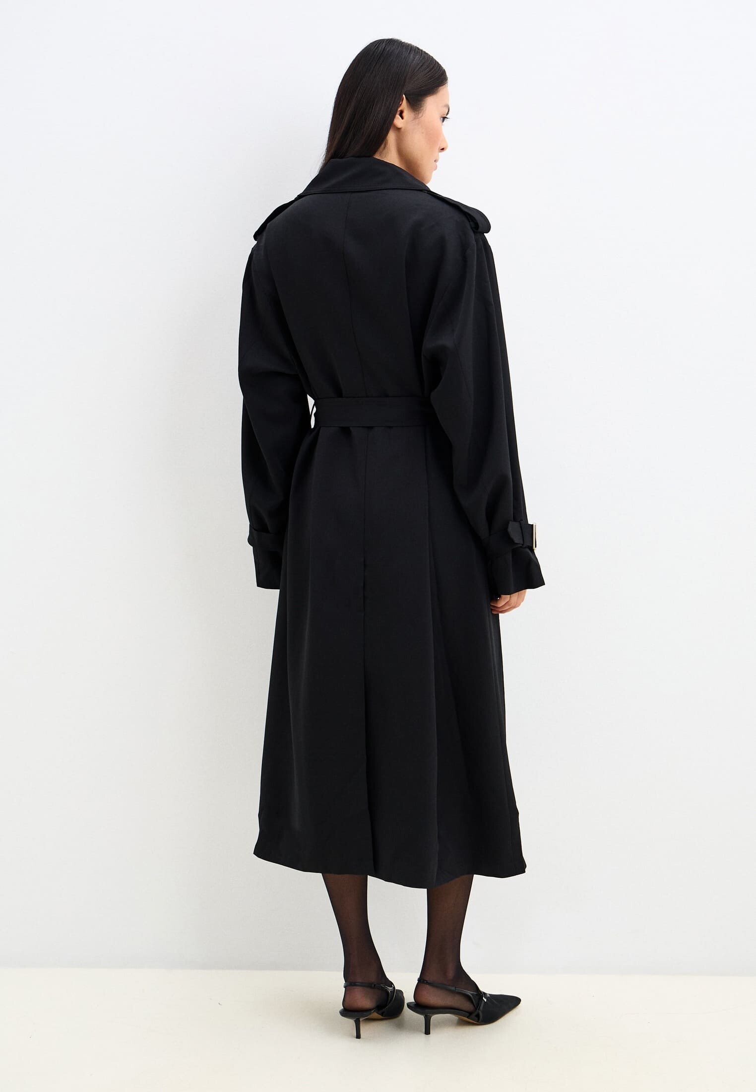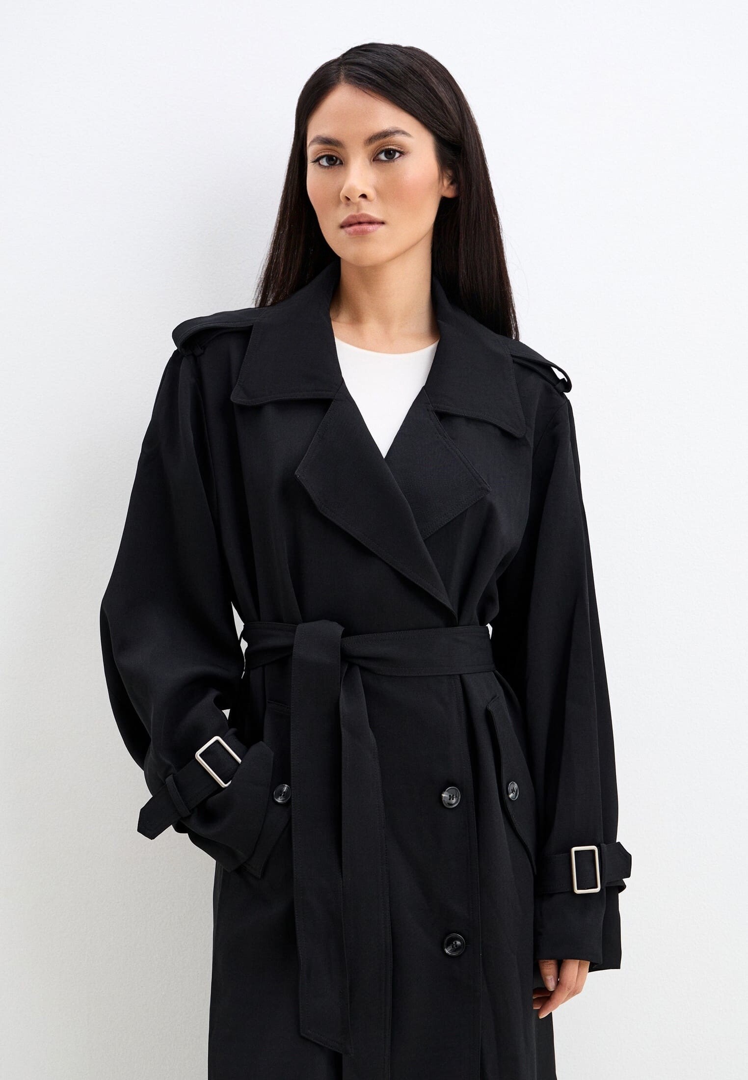 Минимализм в деталях: двубортный силуэт, пояс и акцентные пряжки. Универсальный код для современного гардероба.