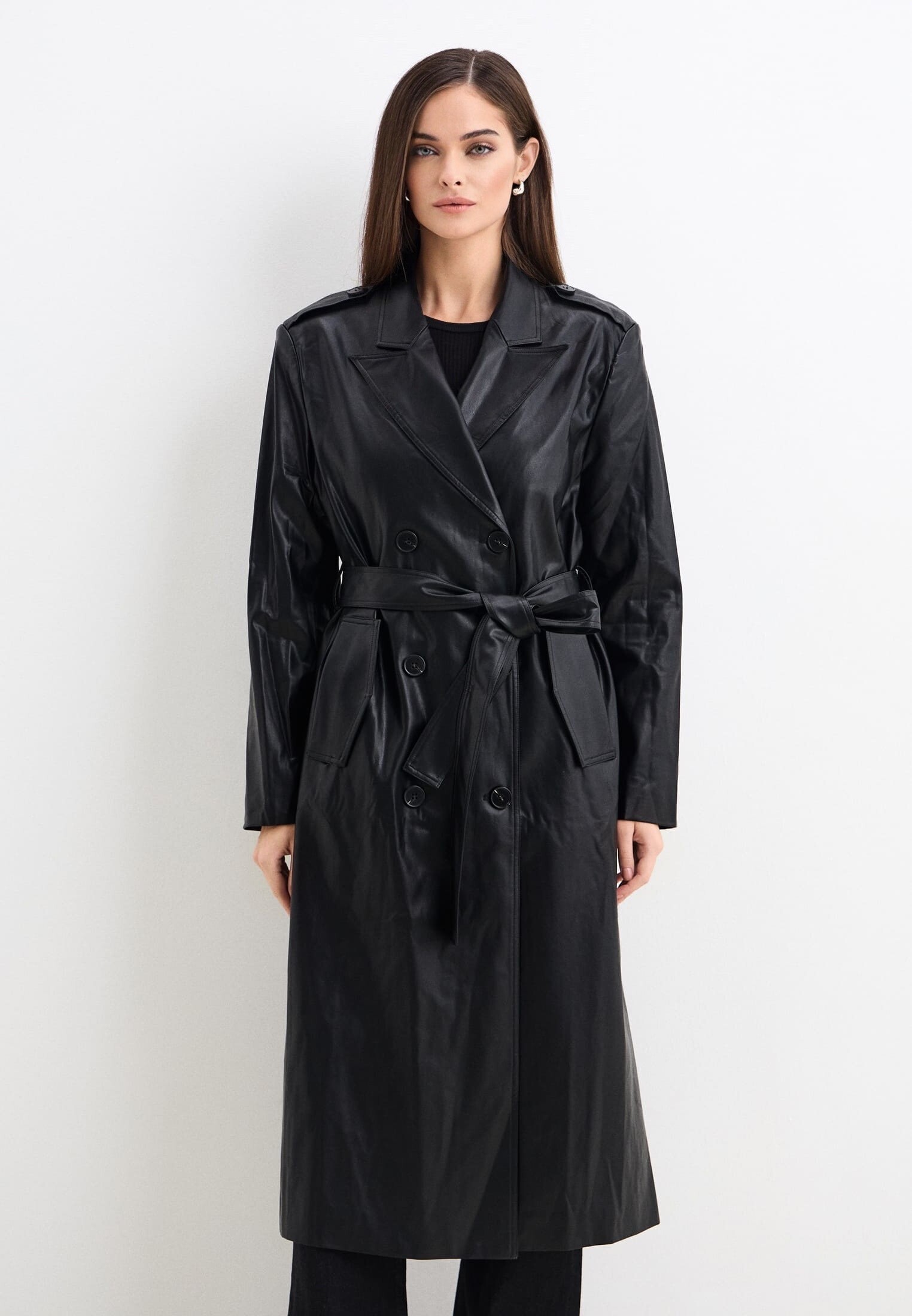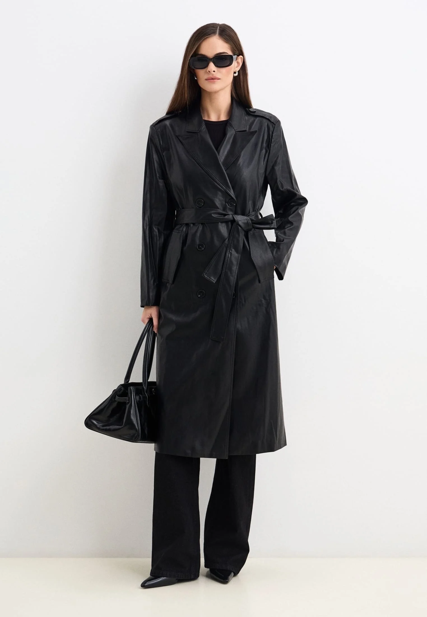Длинный силуэт, строгие лацканы и пояс для акцента на талии. Минимализм в каждой линии.