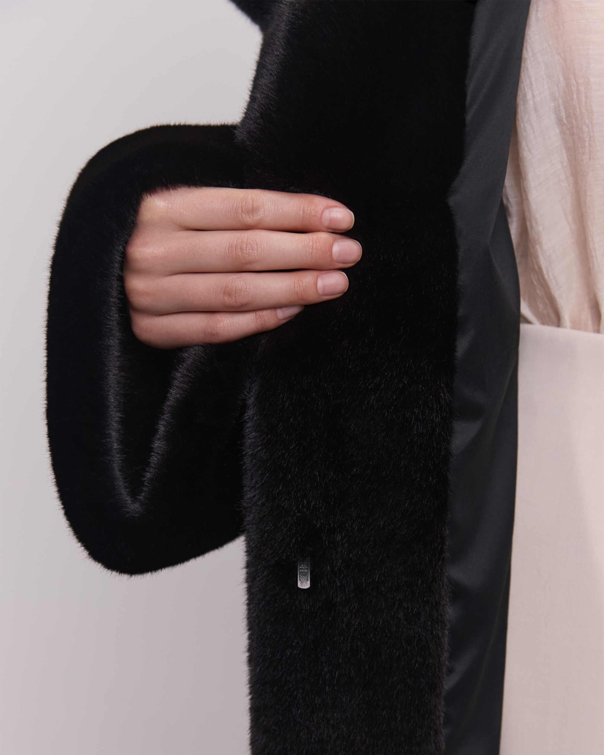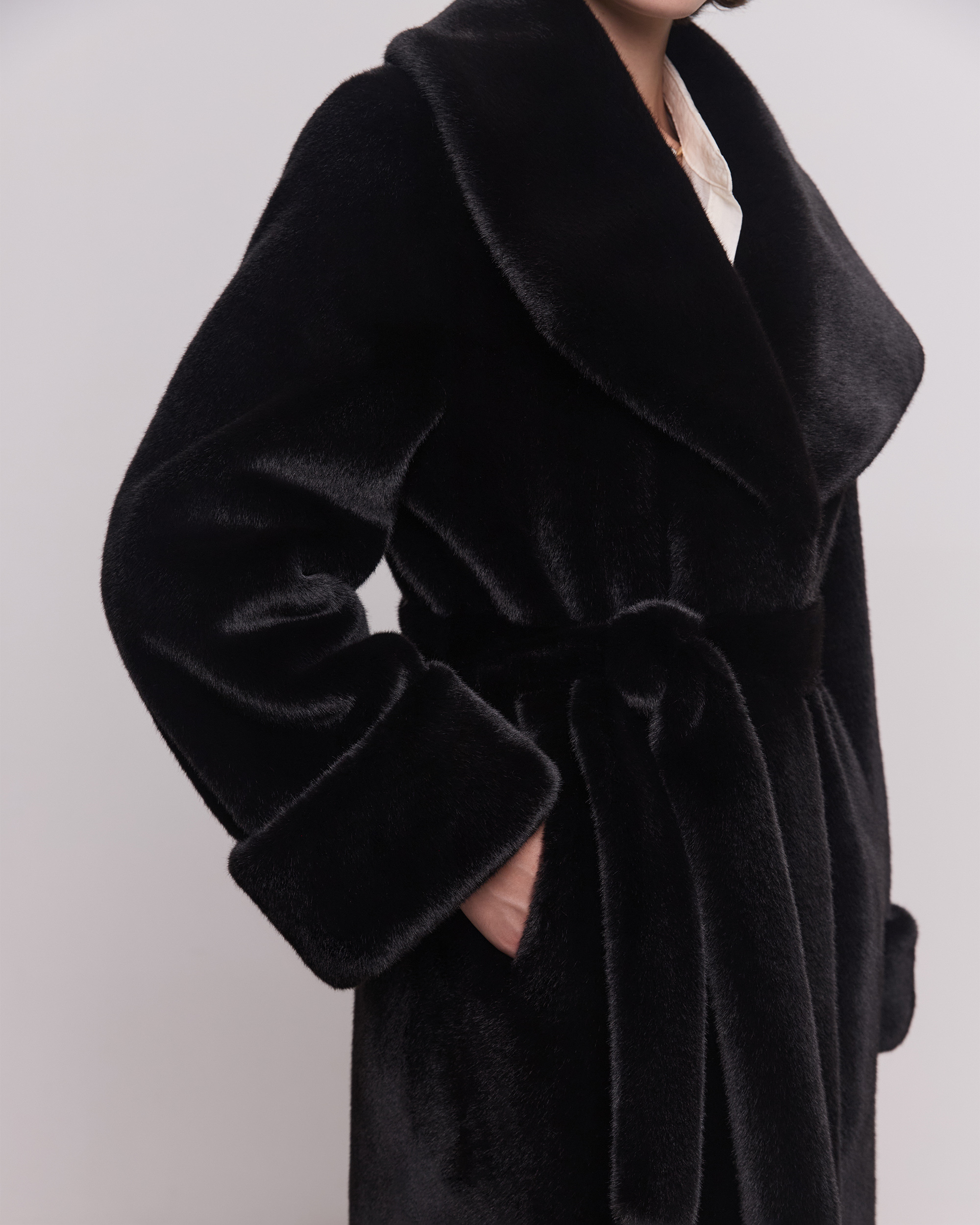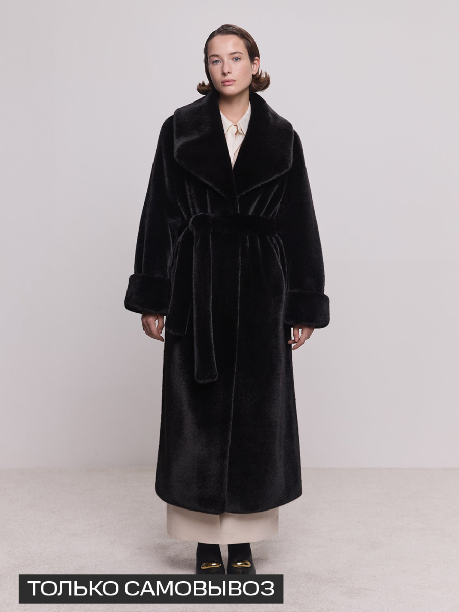 Экошуба выполнена из экомеха под соболя. Воротник апаш привлекает взгляд и дает возможность разной стилизации: поднять и вытянуть силуэт или опустить и украсить зону декольте. В модели практически отсутствуют или скрыты для глаз мелкие детали, здесь доминируют крупные штрихи: экстра длинные рукава с широкими манжетами, мягкая линия плеч и раскидистый воротник. Образы с этой моделью получаются максимально эффектными и запоминающимися.