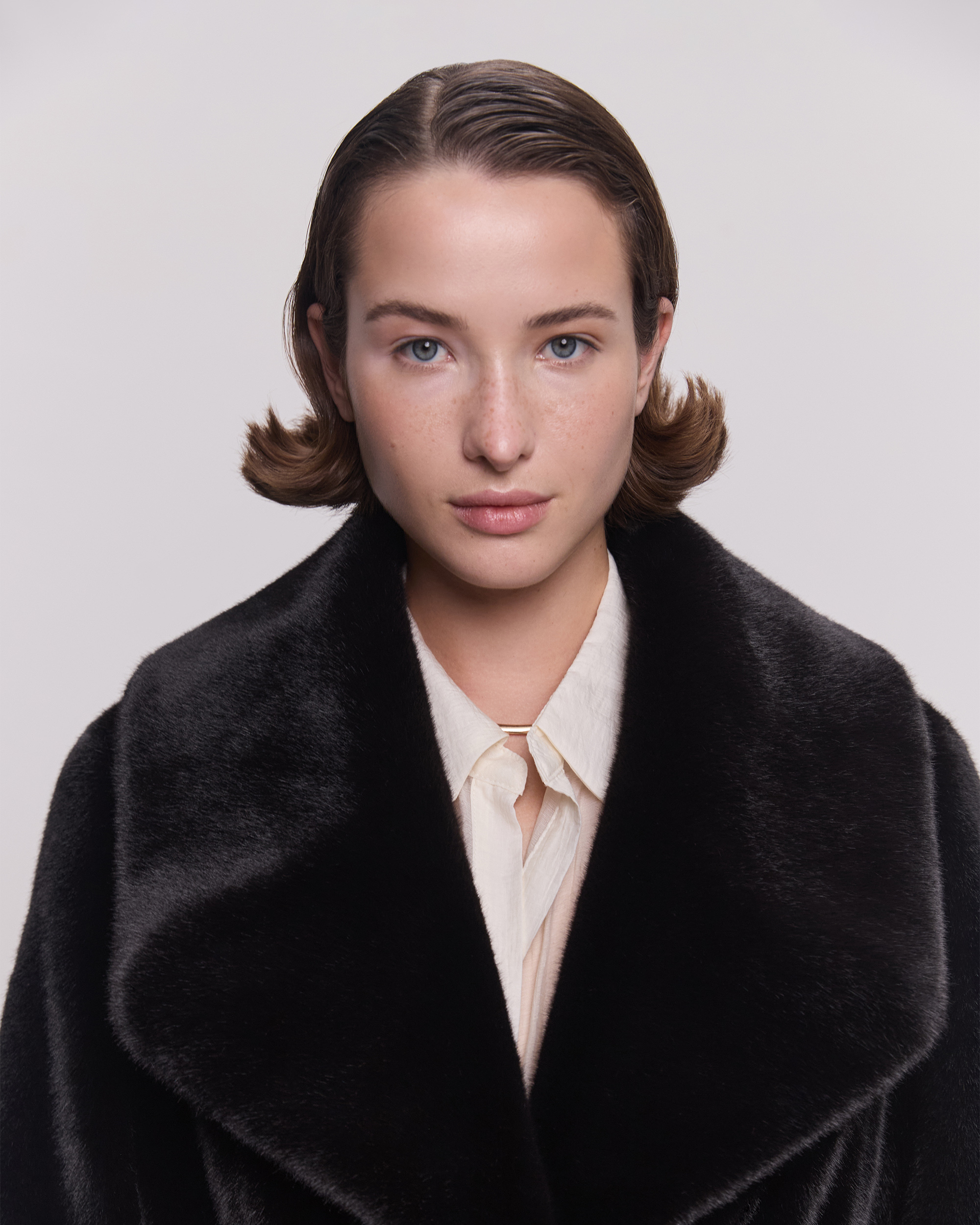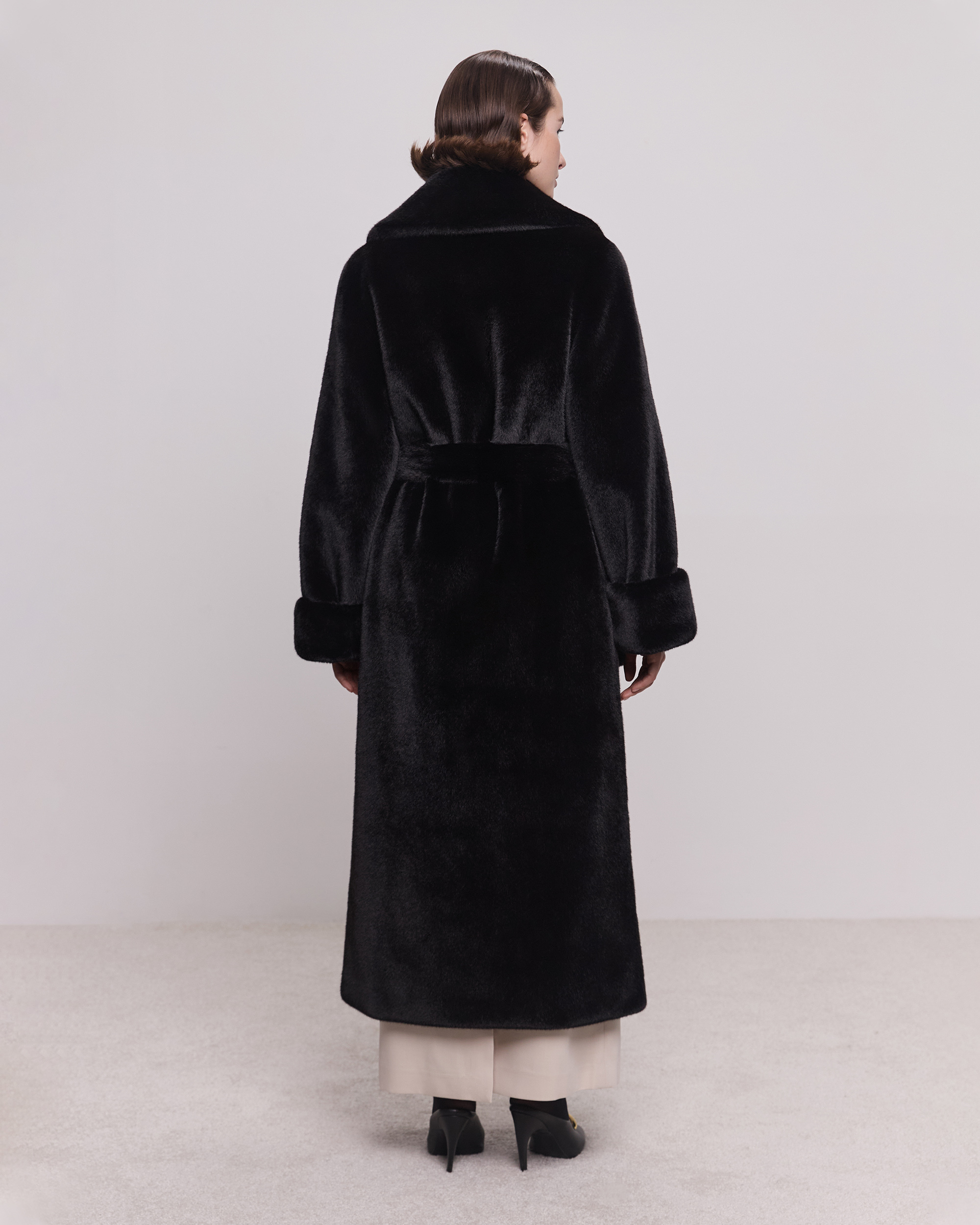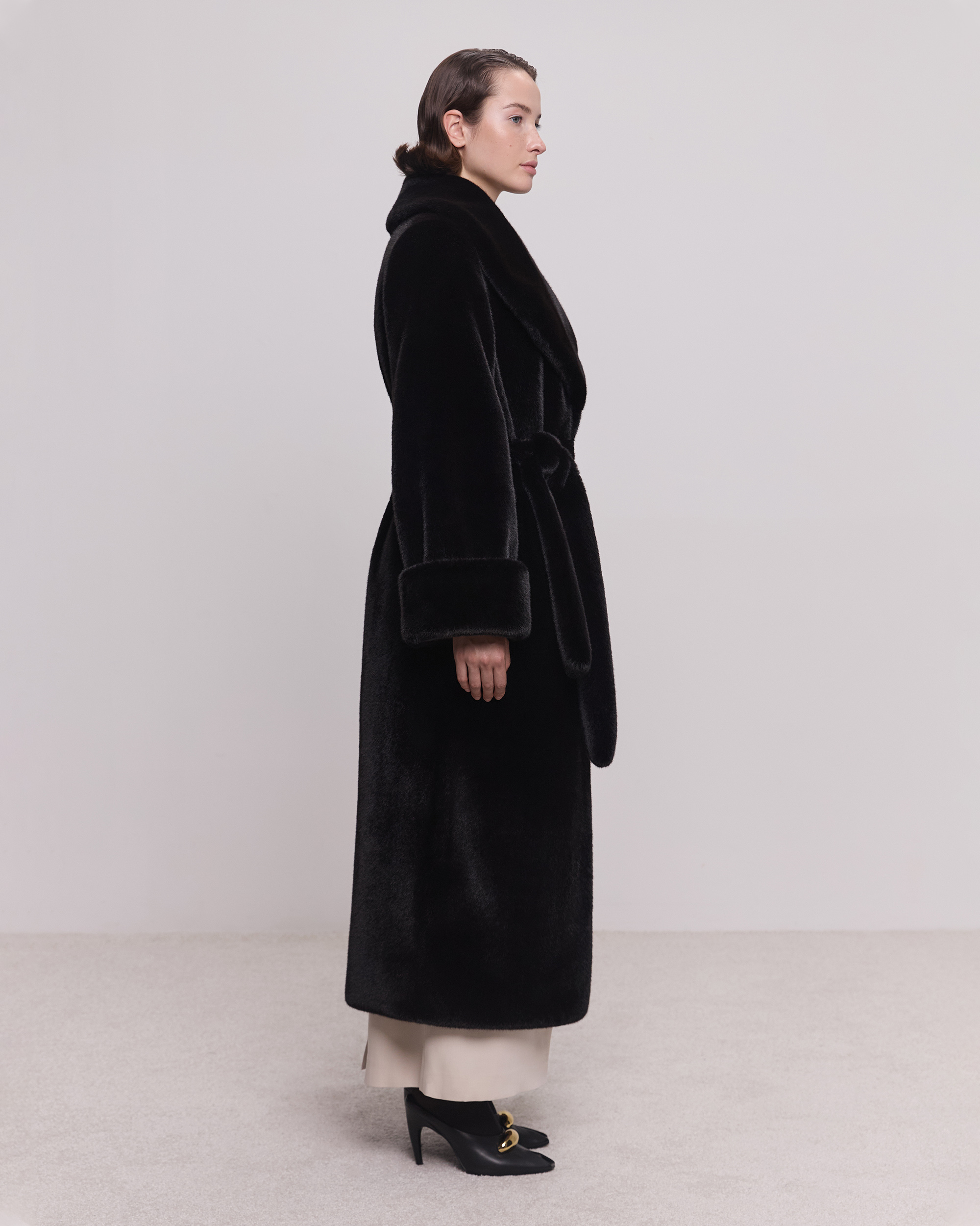 Экошуба выполнена из экомеха под соболя. Воротник апаш привлекает взгляд и дает возможность разной стилизации: поднять и вытянуть силуэт или опустить и украсить зону декольте. В модели практически отсутствуют или скрыты для глаз мелкие детали, здесь доминируют крупные штрихи: экстра длинные рукава с широкими манжетами, мягкая линия плеч и раскидистый воротник. Образы с этой моделью получаются максимально эффектными и запоминающимися.