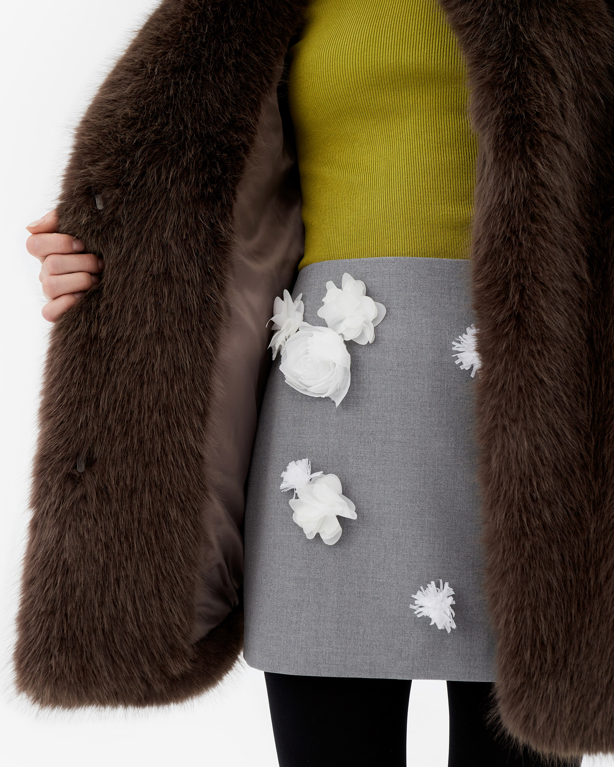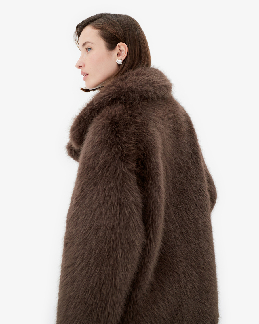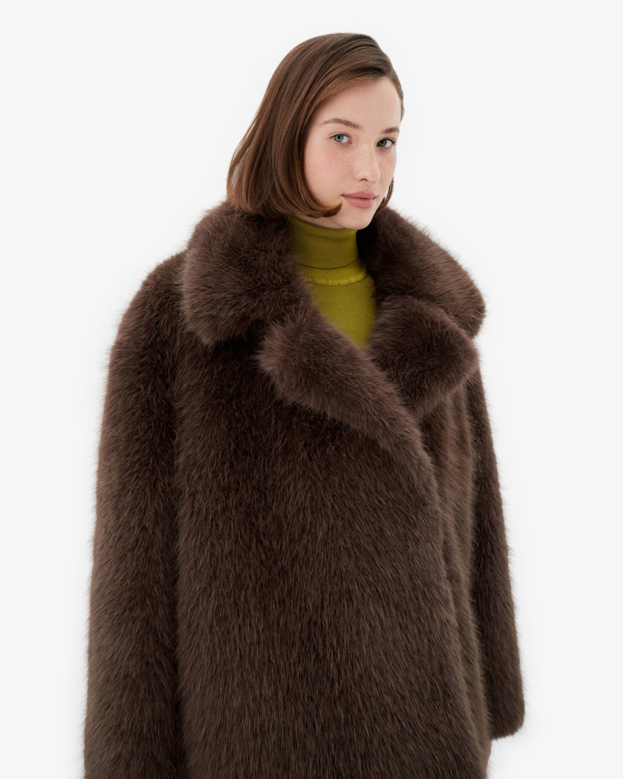 Укороченная экошуба оверсайз фасона с английским воротником, который можно поднять и застегнуть на крючок. Объемный, воздушный мех под песца не утяжеляет изделия, а мягкая текстура вызывает желание прикоснуться. Самый правильный оверсайз силуэт для самых актуальных образов.