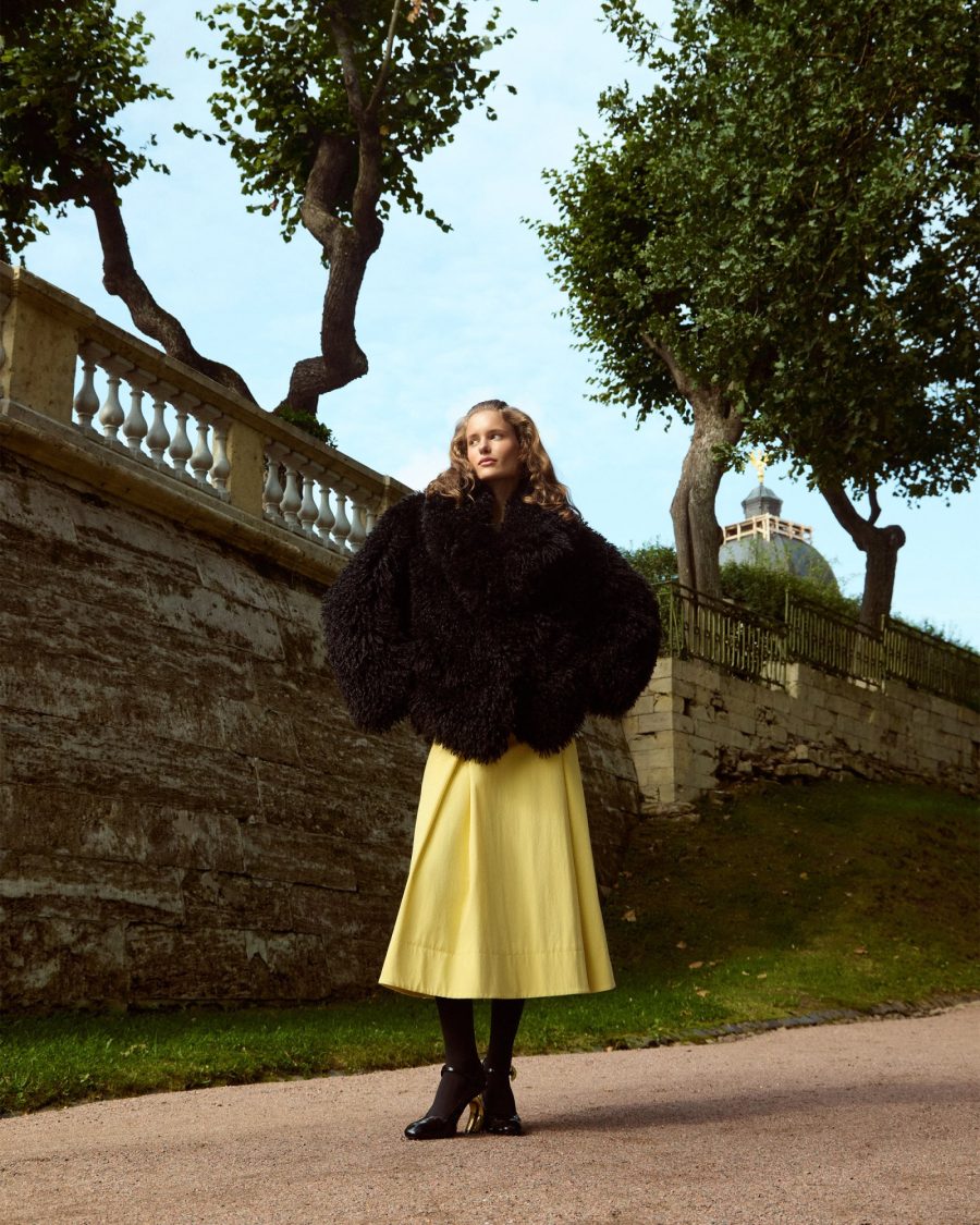 Полупальто с широким английским воротником и двумя боковыми карманами не утяжеляет силуэт несмотря на свой объемный внешний вид.