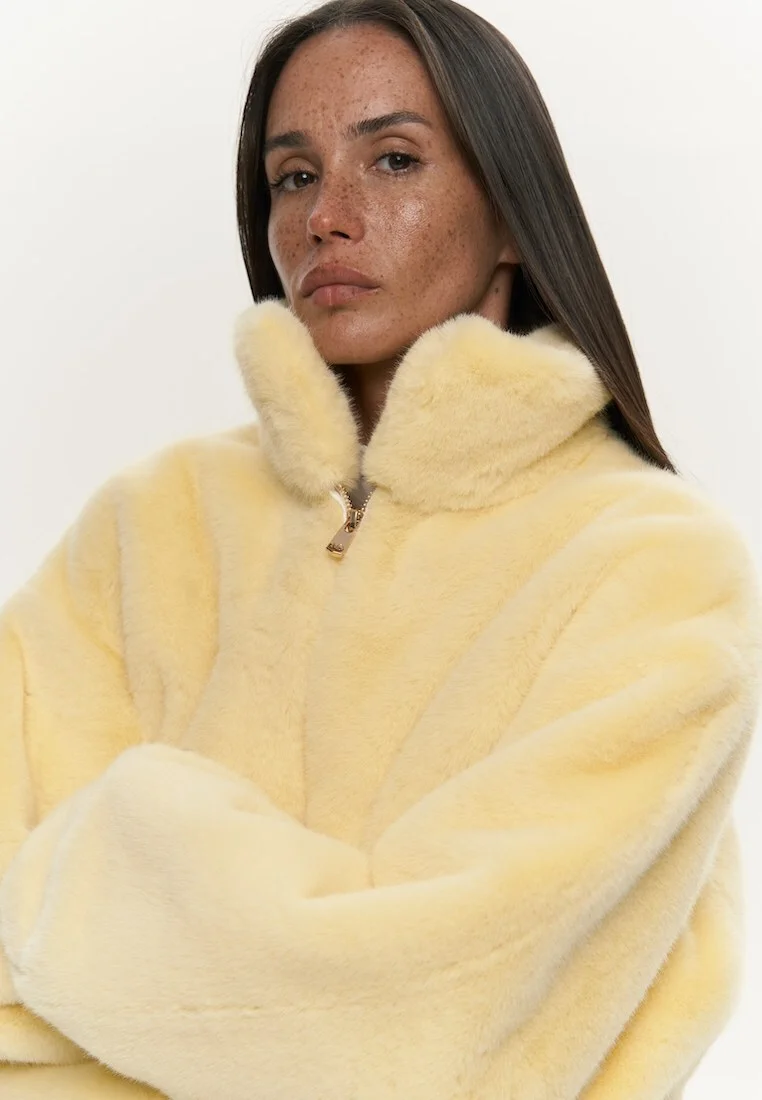 Короткая шуба из искусственного меха в форме бомбера — это дерзкий и современный вариант зимней верхней одежды, сочетающий уют искусственного меха и спортивный крой авиатора. Модель выполнена из густого и мягкого искусственного меха, характерные для бомбера детали: застежку-молнию, а также объемный силуэт с отложным воротником. Укороченная длина подчеркивает талию и визуально удлиняет ноги, делая образ динамичным и стильным. Такая шуба отлично смотрится с узкими джинсами, высокими сапогами или грубыми ботинками, добавляя образу легкости и роскоши без излишней строгости.