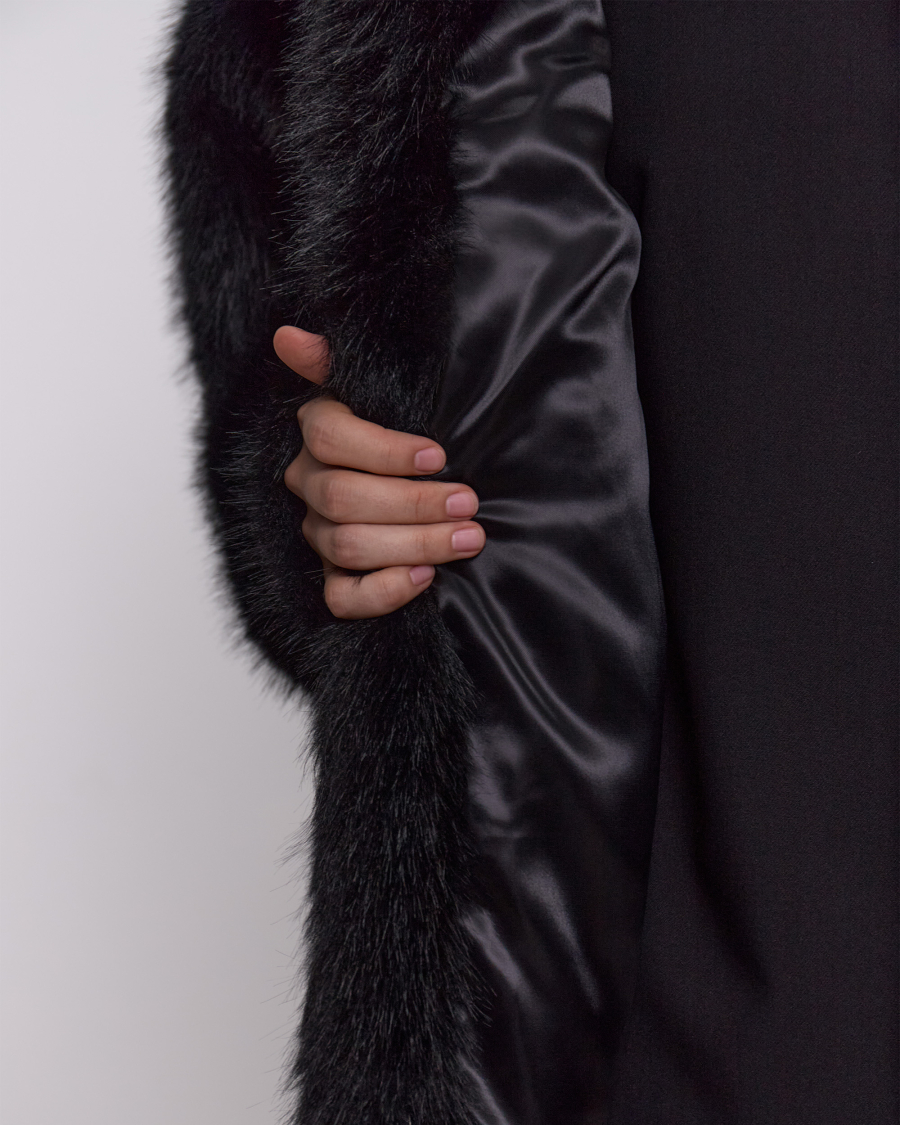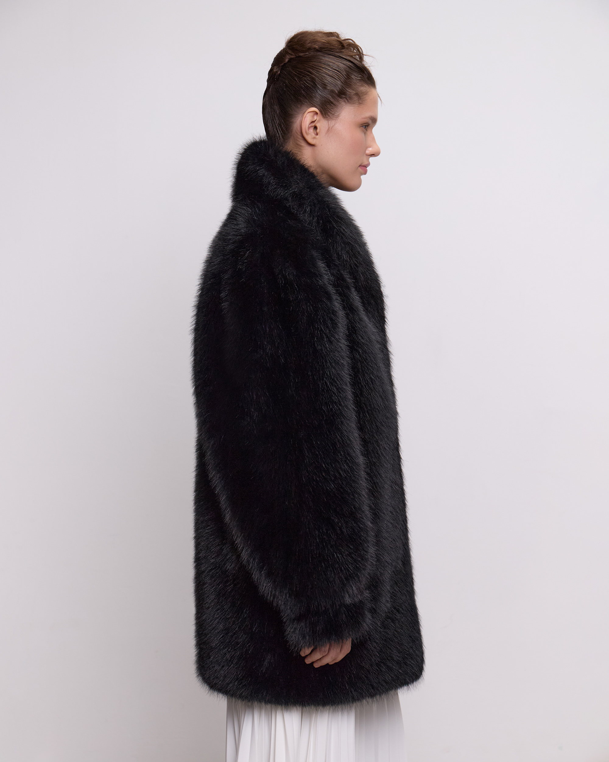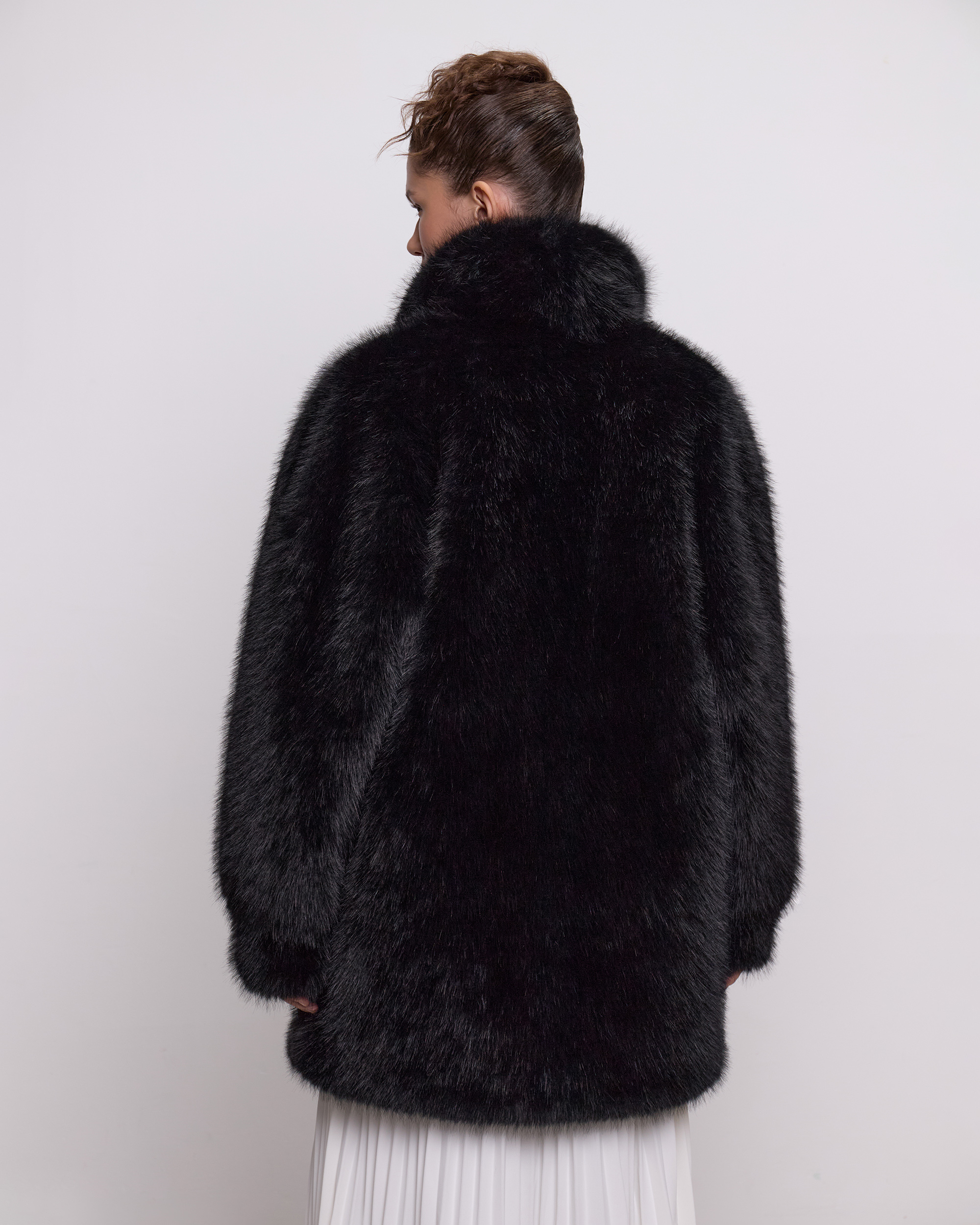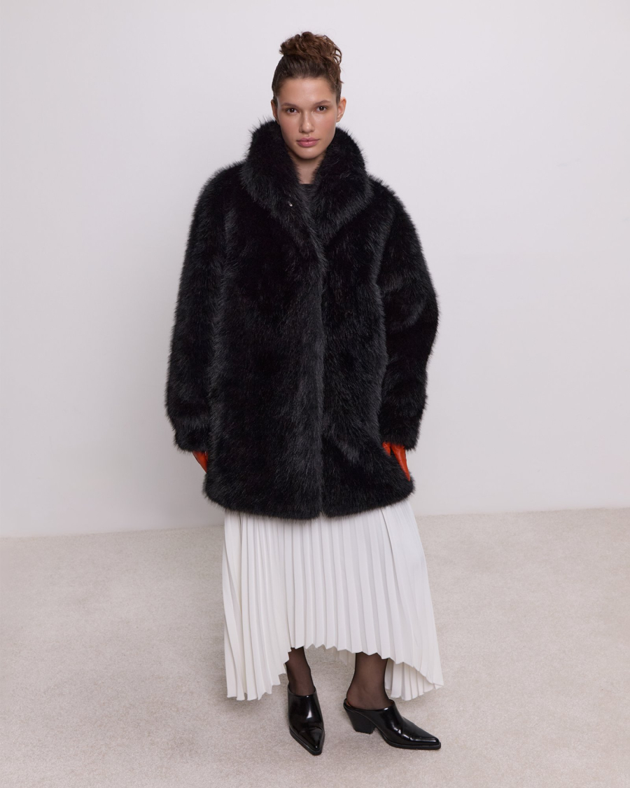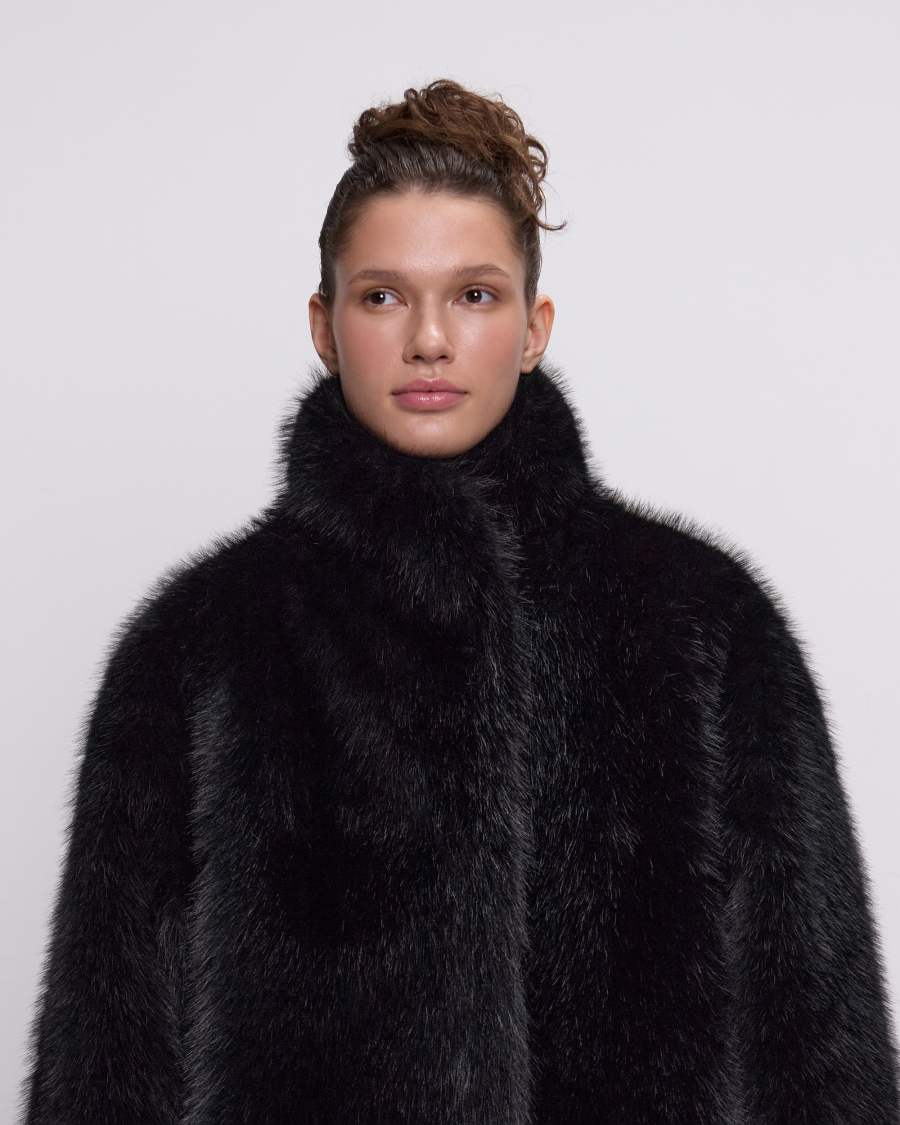 Пушистая и классная! Экошуба оверсайз фасона с эффектным воротником апаш и объемными рукавами. Каждая деталь продумана для защиты от холода: воротник поднимается и застегивается на крючок, а на рукавах есть манжеты. Одинаково хорошо смотрится и с повседневными образами, и с вечерним платьем.
