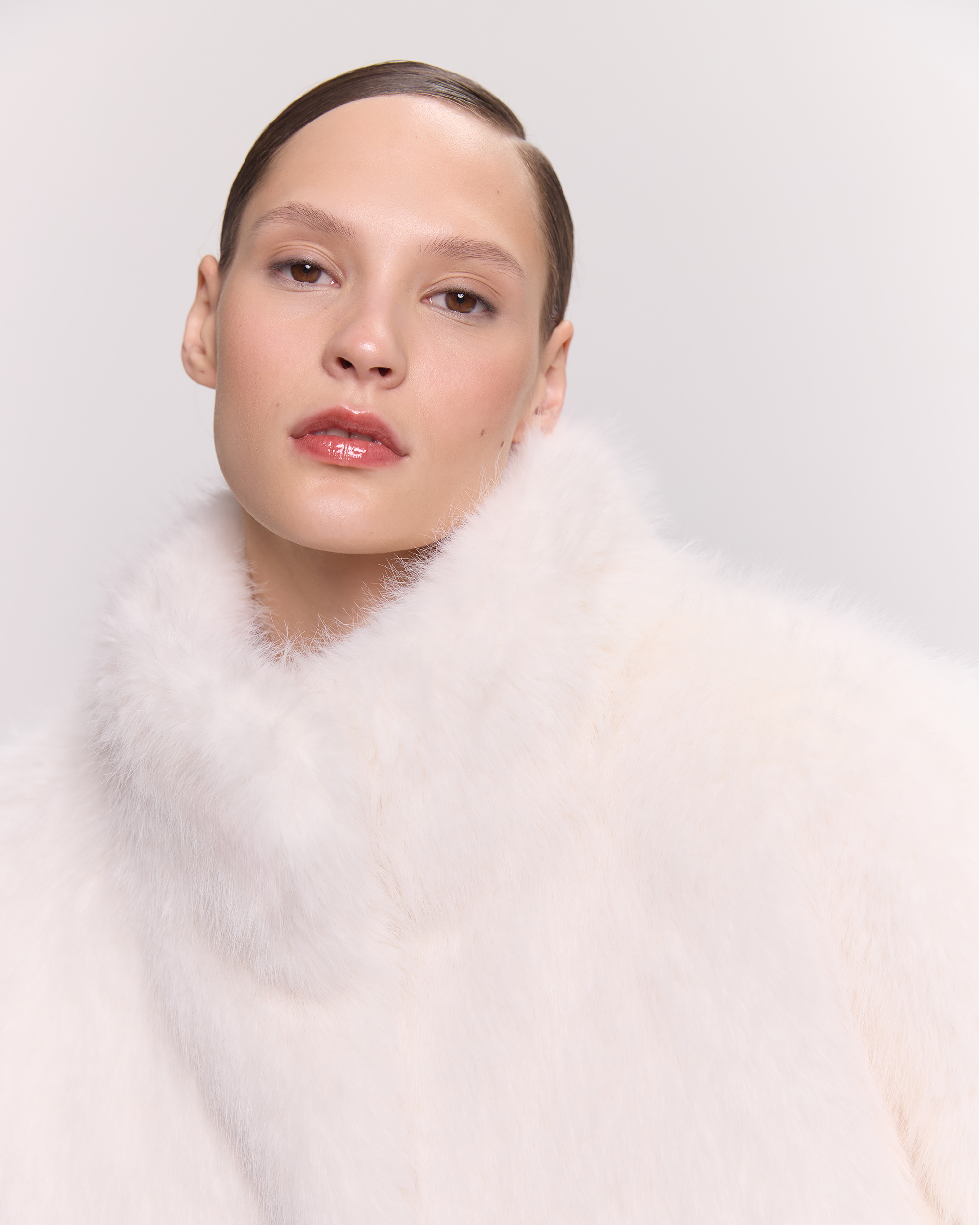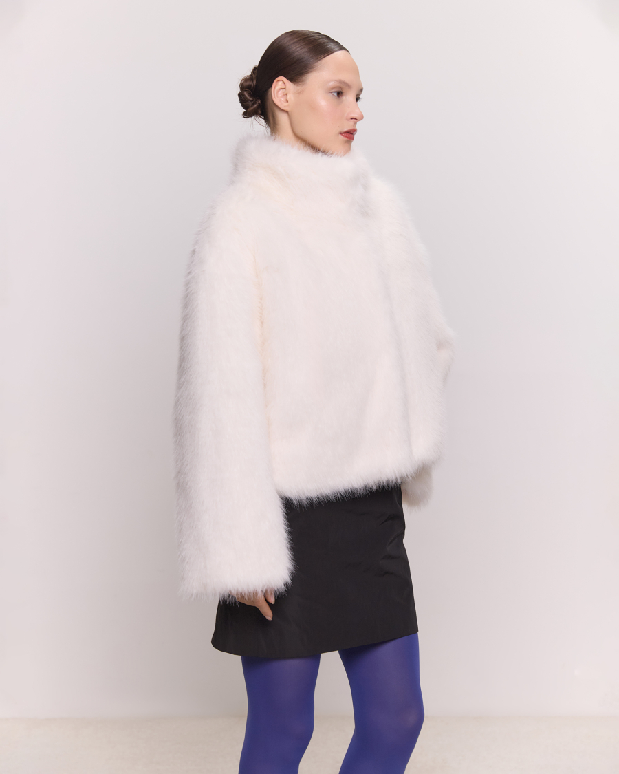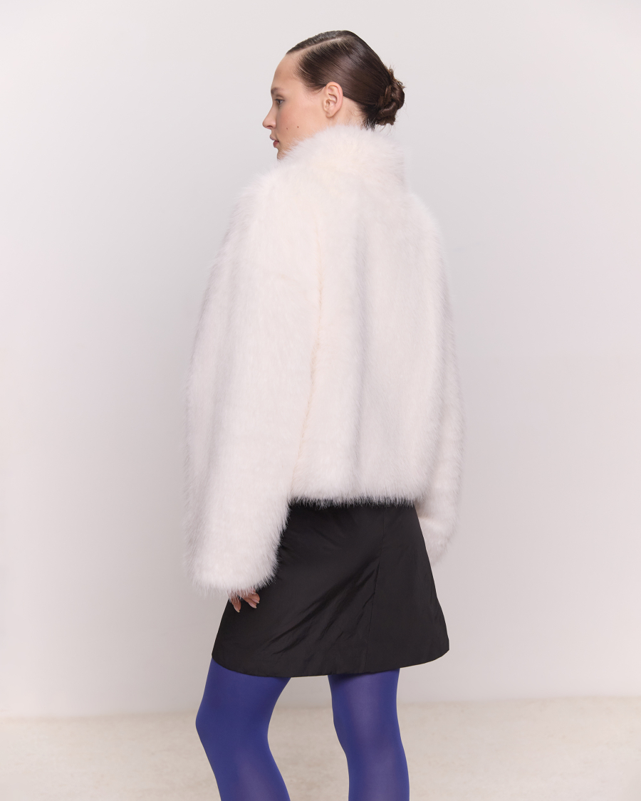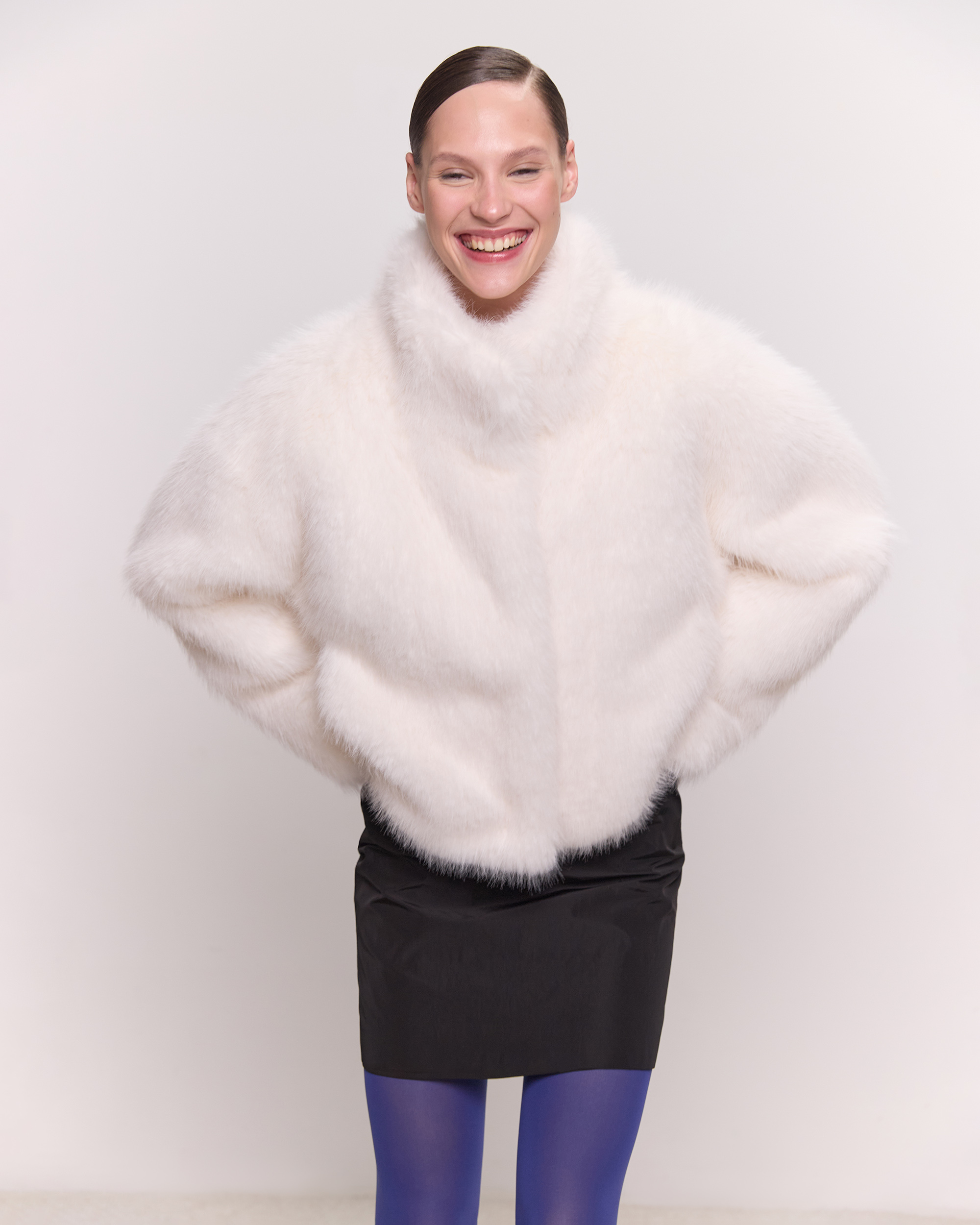 Укороченная шуба из экомеха под песца – длинный и мягкий ворс, приятный на ощупь. Воротник стойка поднимается и застегивается на крючок, боковые карманы. Идеально завершит вечерний образ и подойдет также в повседневный гардероб – носите с денимом и экокожей.