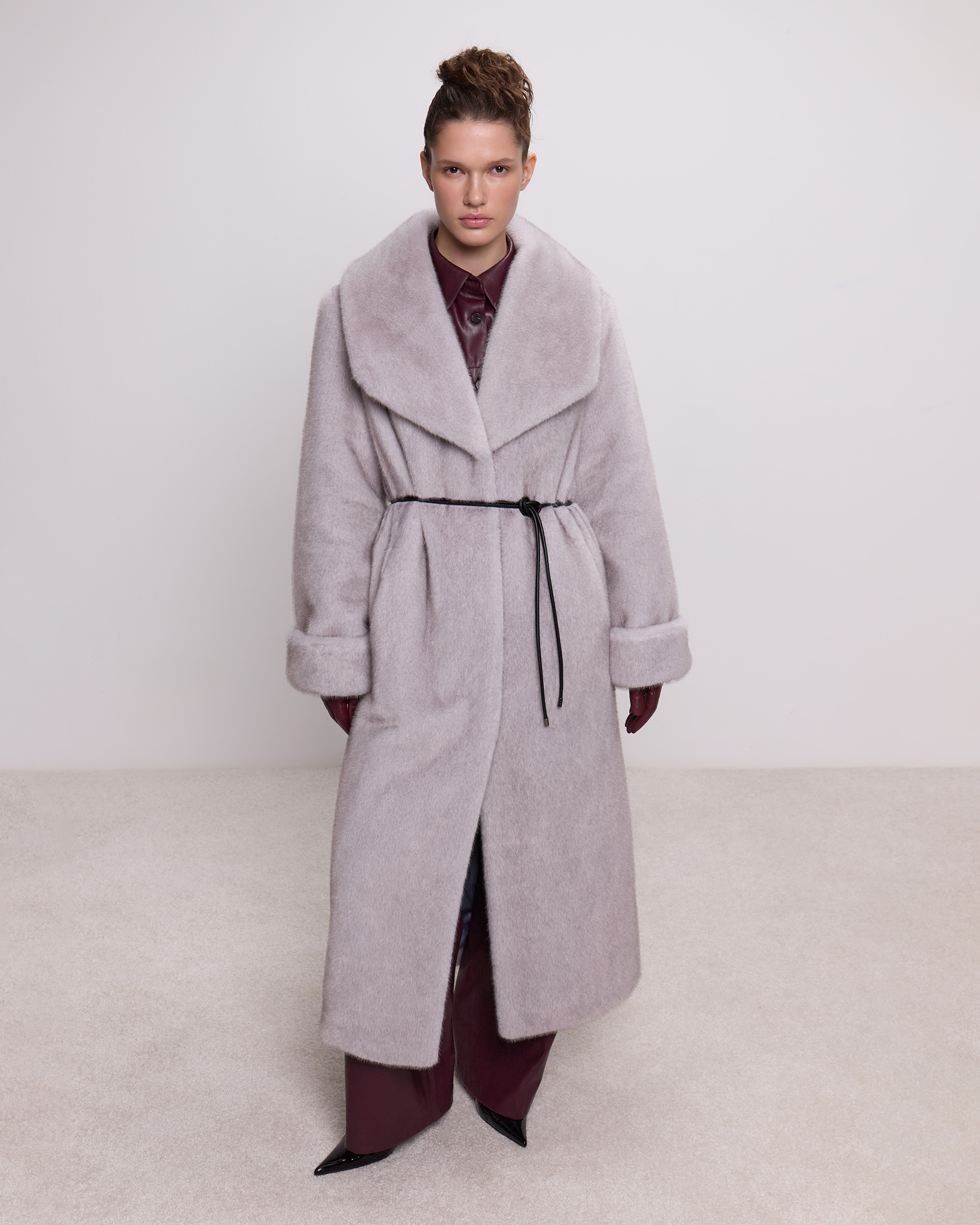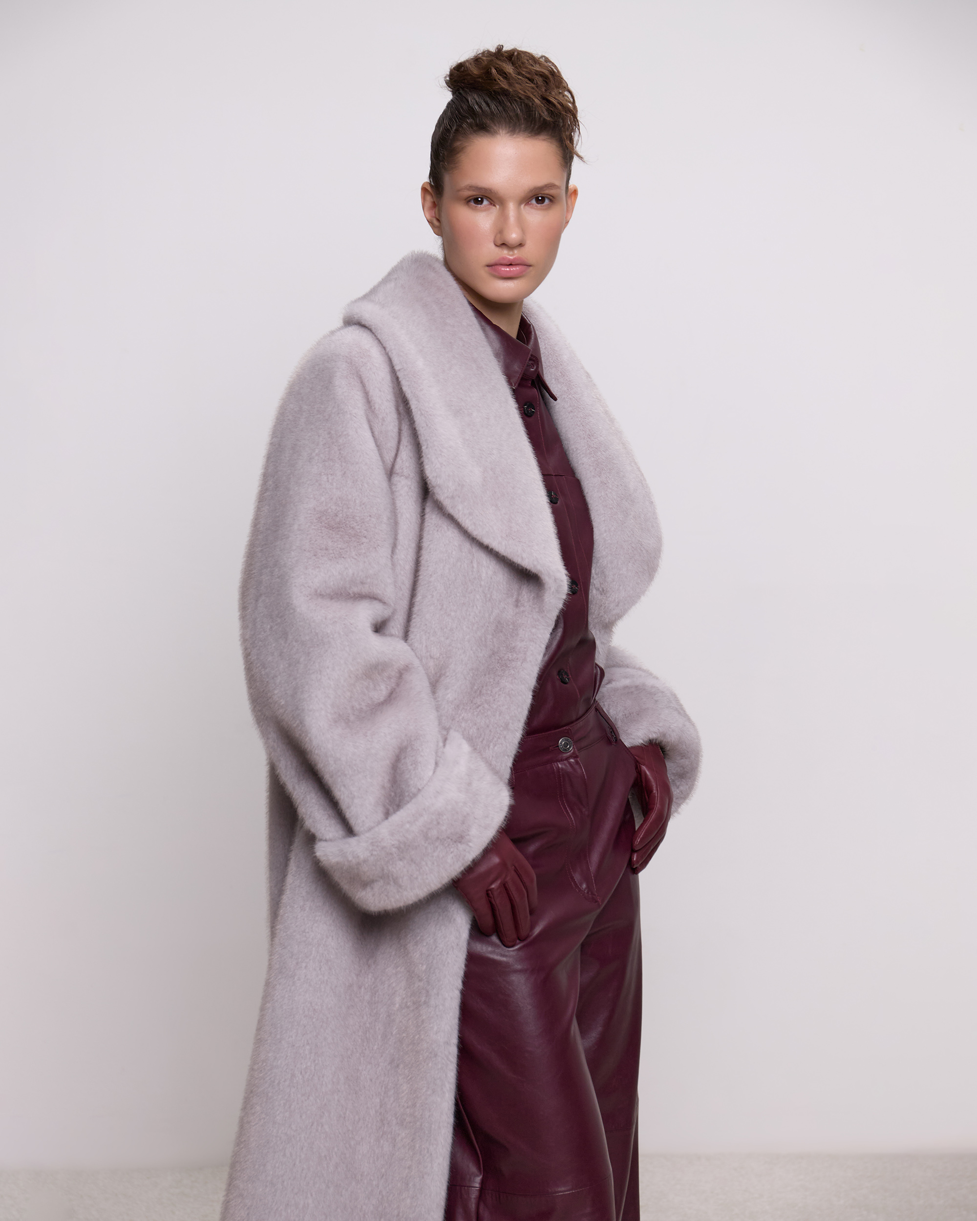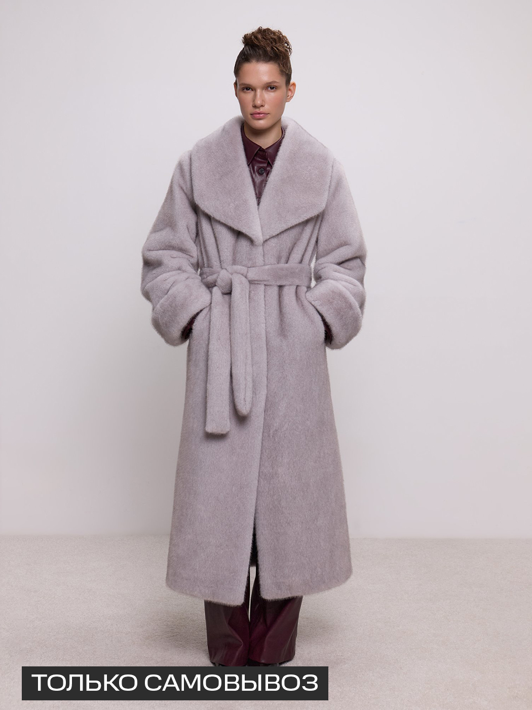Экошуба выполнена из экомеха под соболя. Воротник апаш привлекает взгляд и дает возможность разной стилизации: поднять и вытянуть силуэт или опустить и украсить зону декольте. В модели практически отсутствуют или скрыты для глаз мелкие детали, здесь доминируют крупные штрихи: экстра длинные рукава с широкими манжетами, мягкая линия плеч и раскидистый воротник. Образы с этой моделью получаются максимально эффектными и запоминающимися.