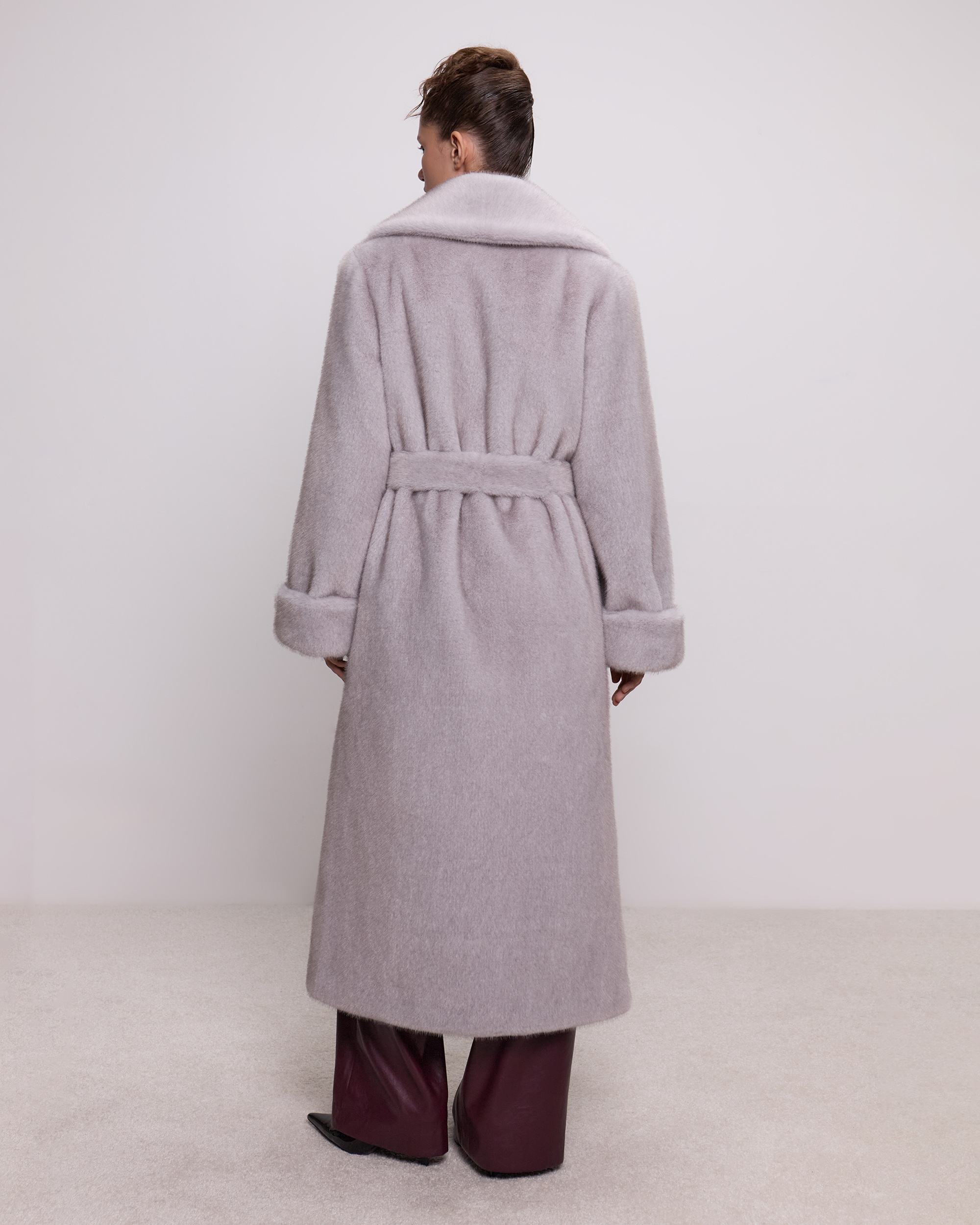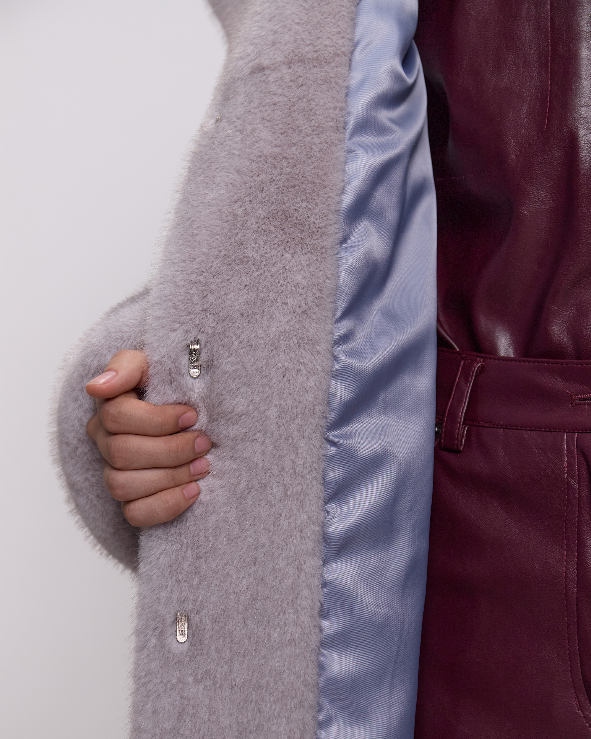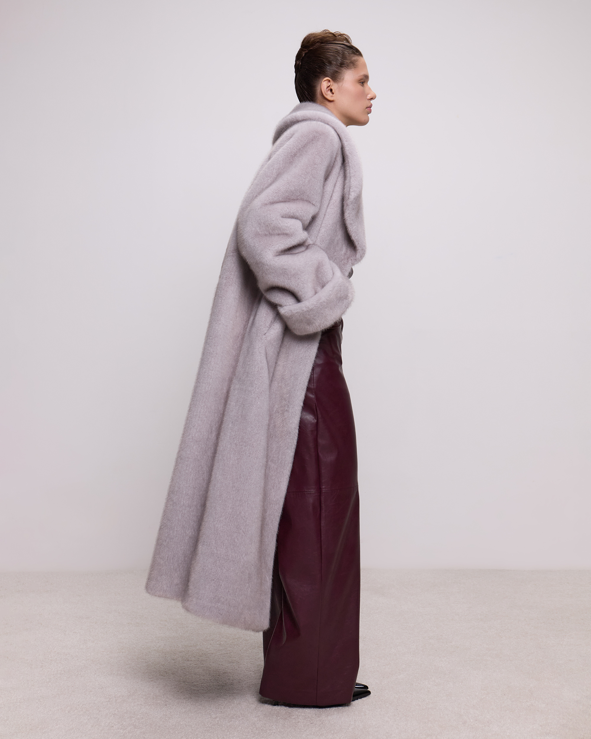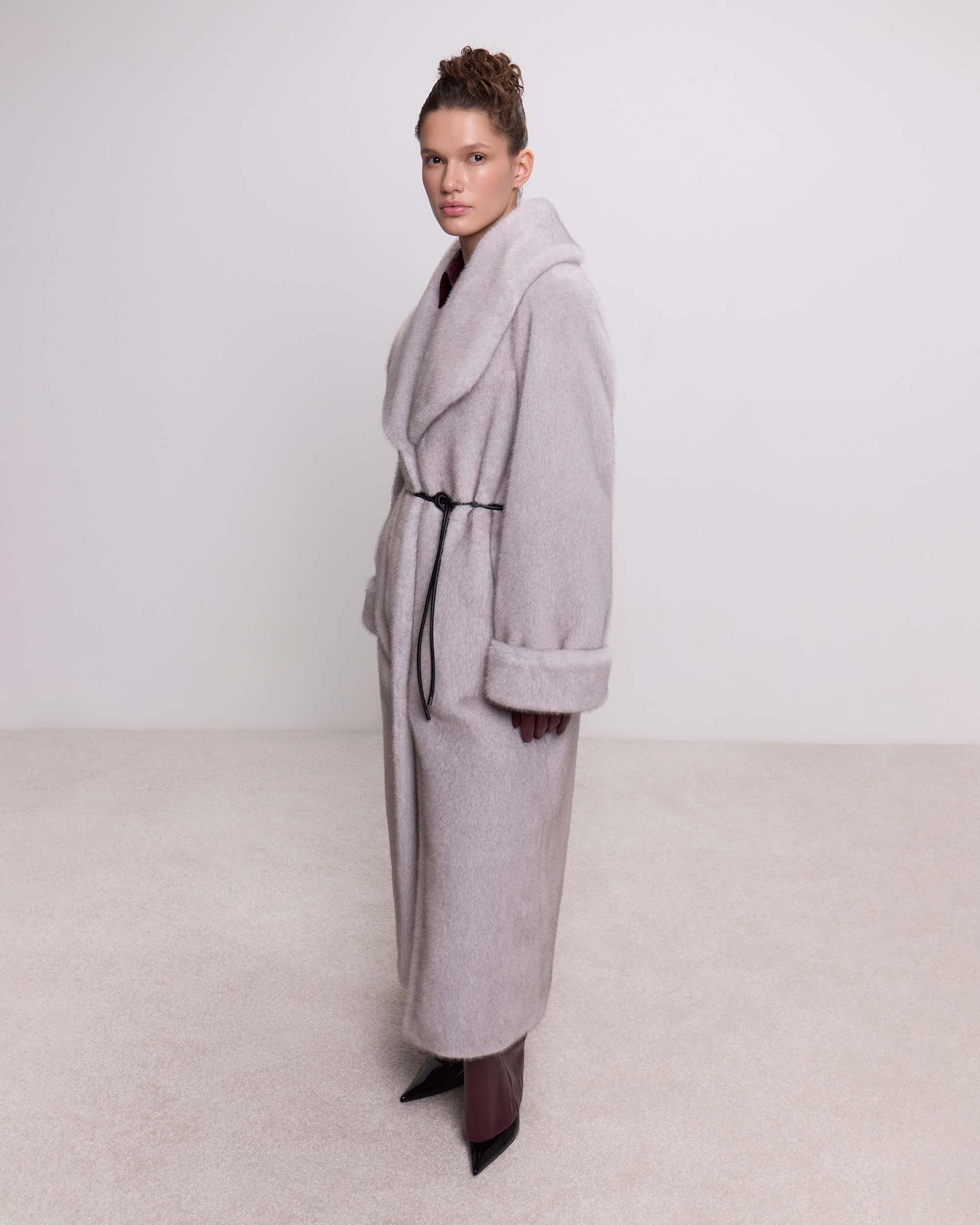 Экошуба выполнена из экомеха под соболя. Воротник апаш привлекает взгляд и дает возможность разной стилизации: поднять и вытянуть силуэт или опустить и украсить зону декольте. В модели практически отсутствуют или скрыты для глаз мелкие детали, здесь доминируют крупные штрихи: экстра длинные рукава с широкими манжетами, мягкая линия плеч и раскидистый воротник. Образы с этой моделью получаются максимально эффектными и запоминающимися.