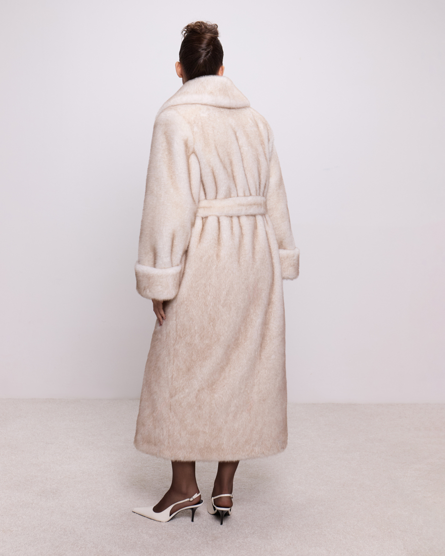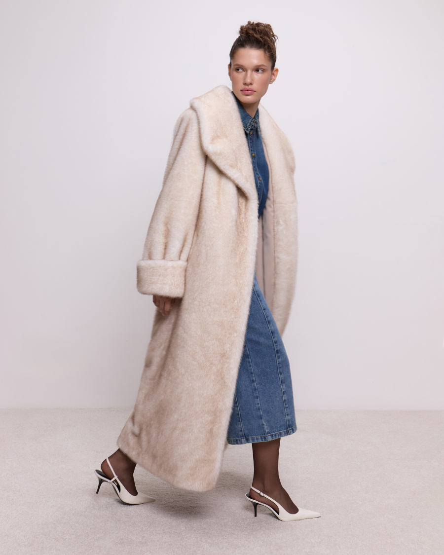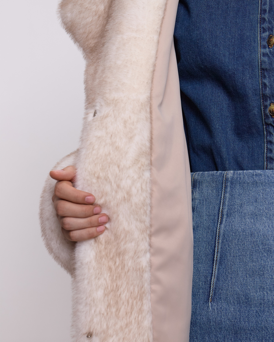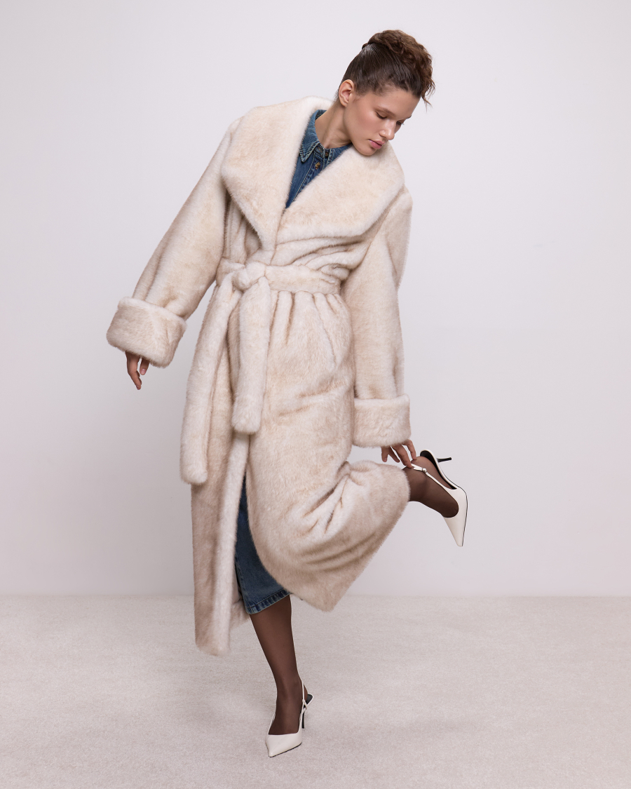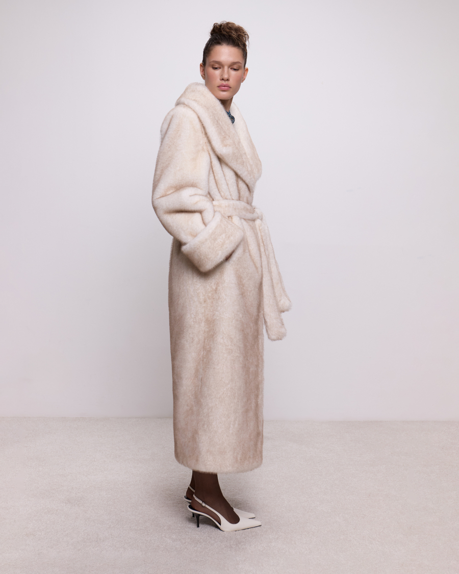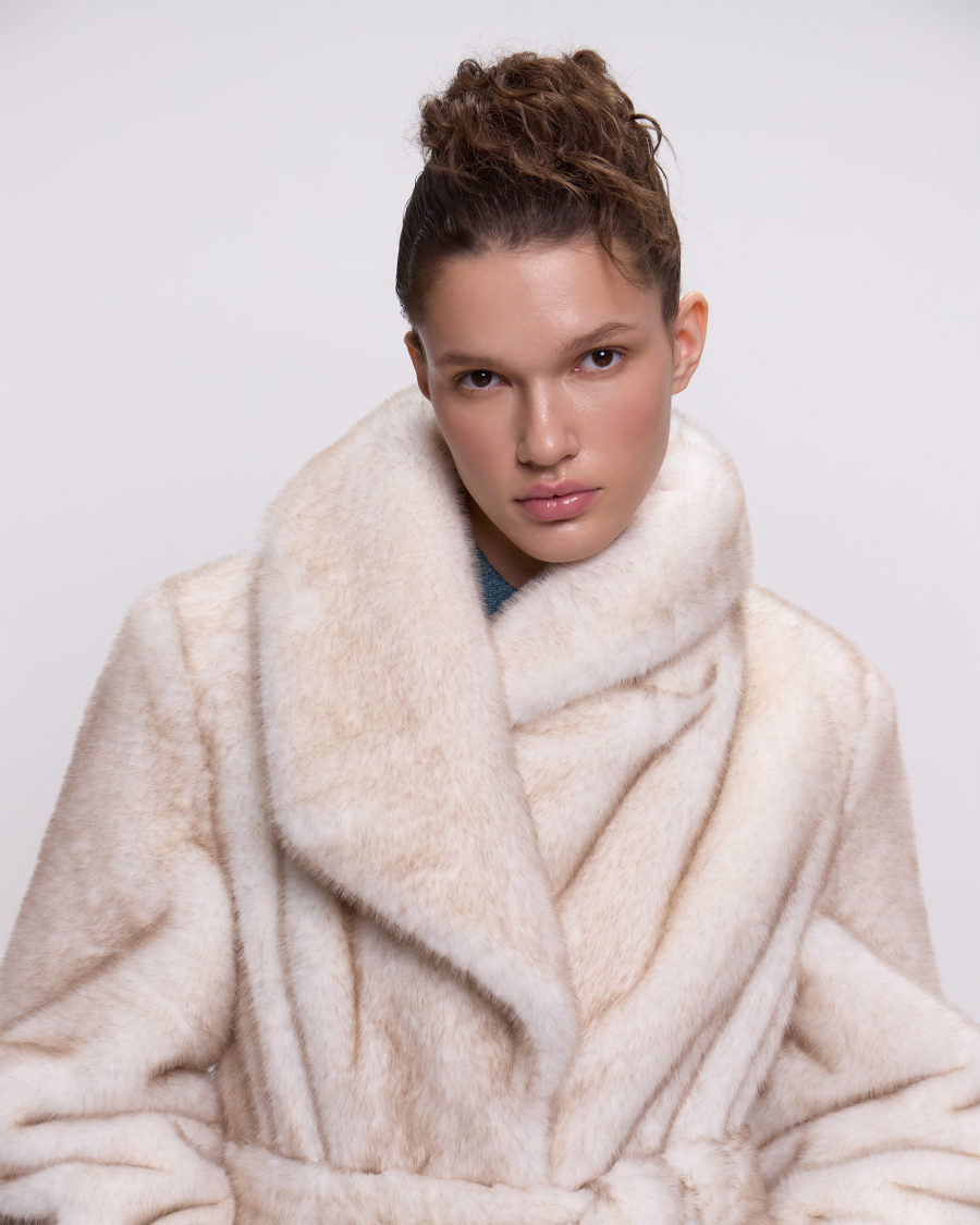 Экошуба выполнена из экомеха под соболя. Воротник апаш привлекает взгляд и дает возможность разной стилизации: поднять и вытянуть силуэт или опустить и украсить зону декольте. В модели практически отсутствуют или скрыты для глаз мелкие детали, здесь доминируют крупные штрихи: экстра длинные рукава с широкими манжетами, мягкая линия плеч и раскидистый воротник. Образы с этой моделью получаются максимально эффектными и запоминающимися.