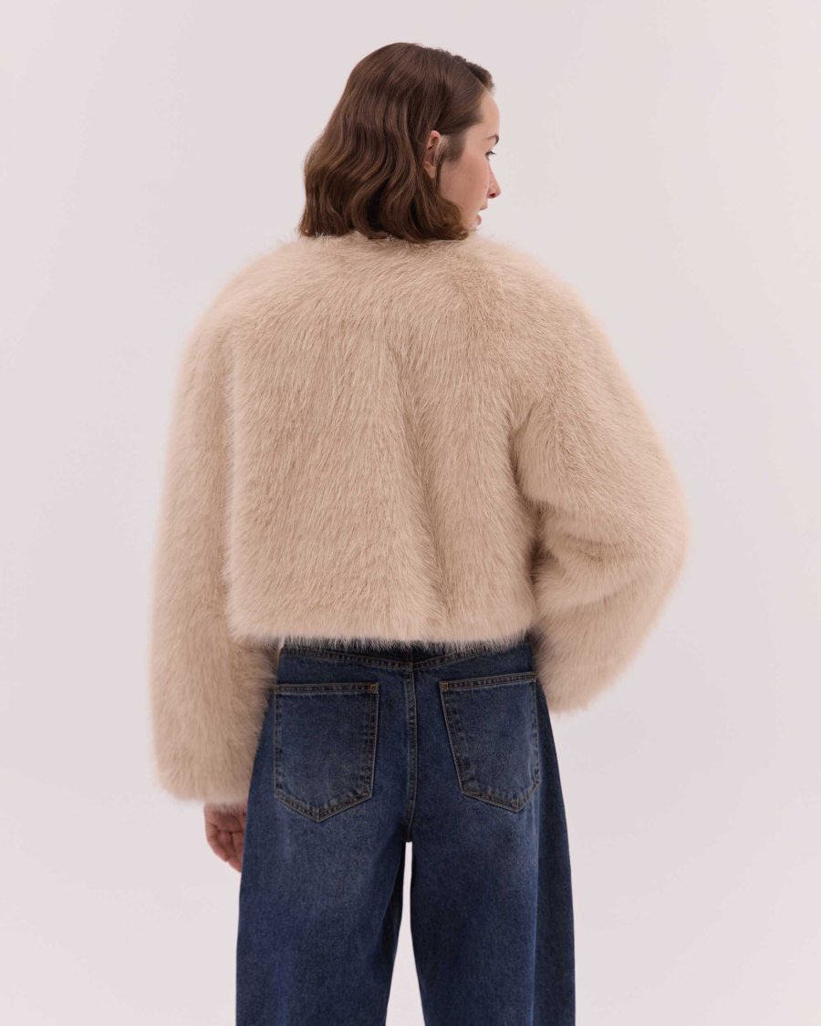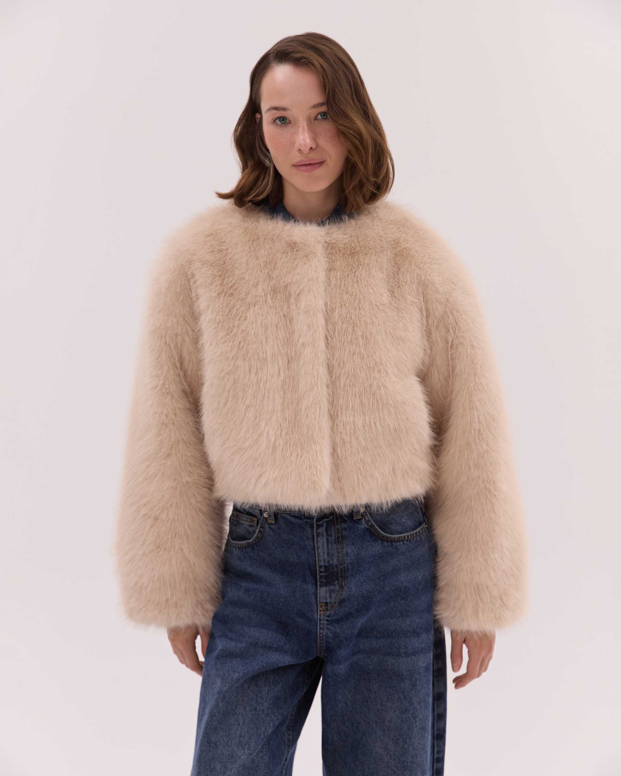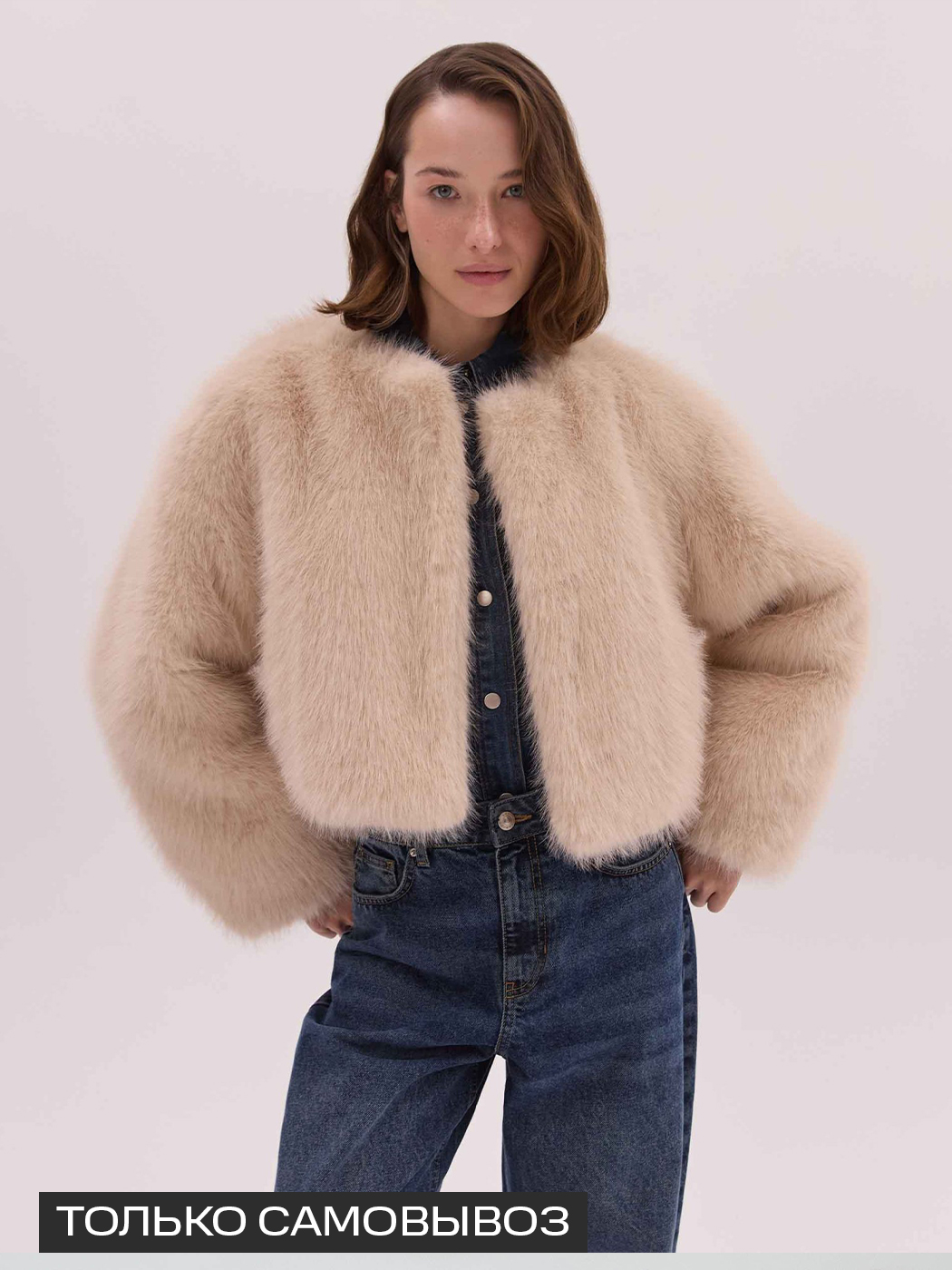 Эффектная укороченная шуба из пушистого экомеха под песца.