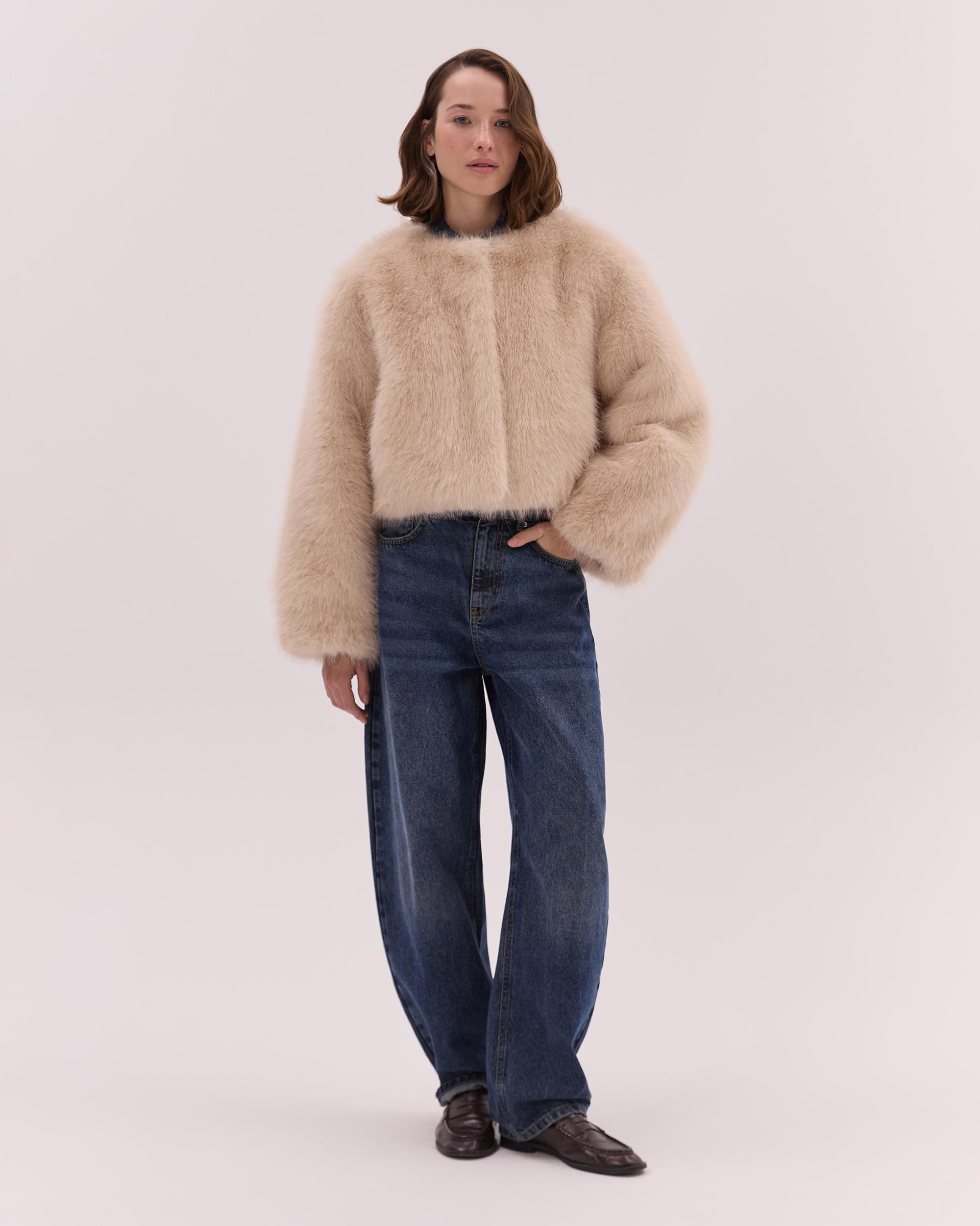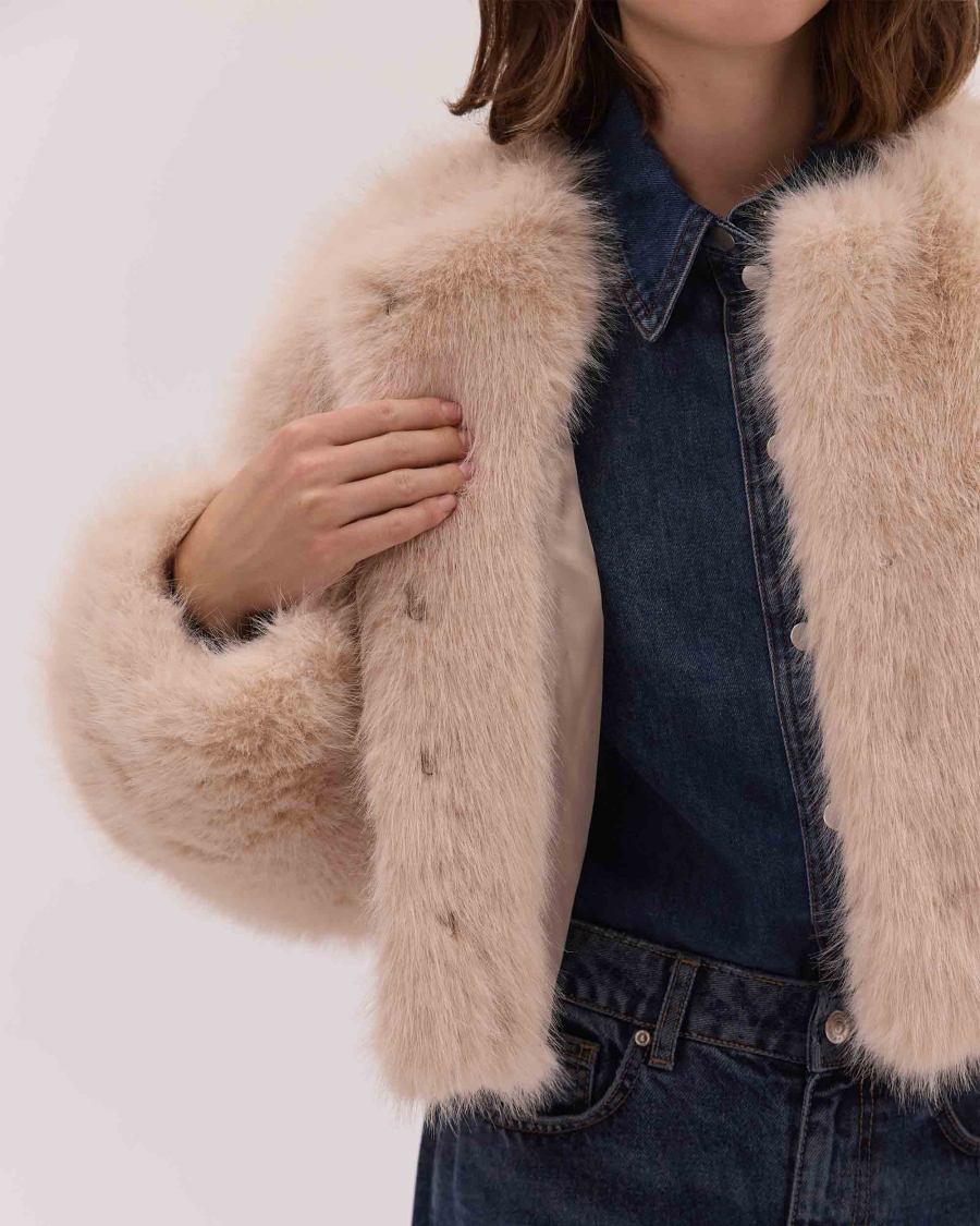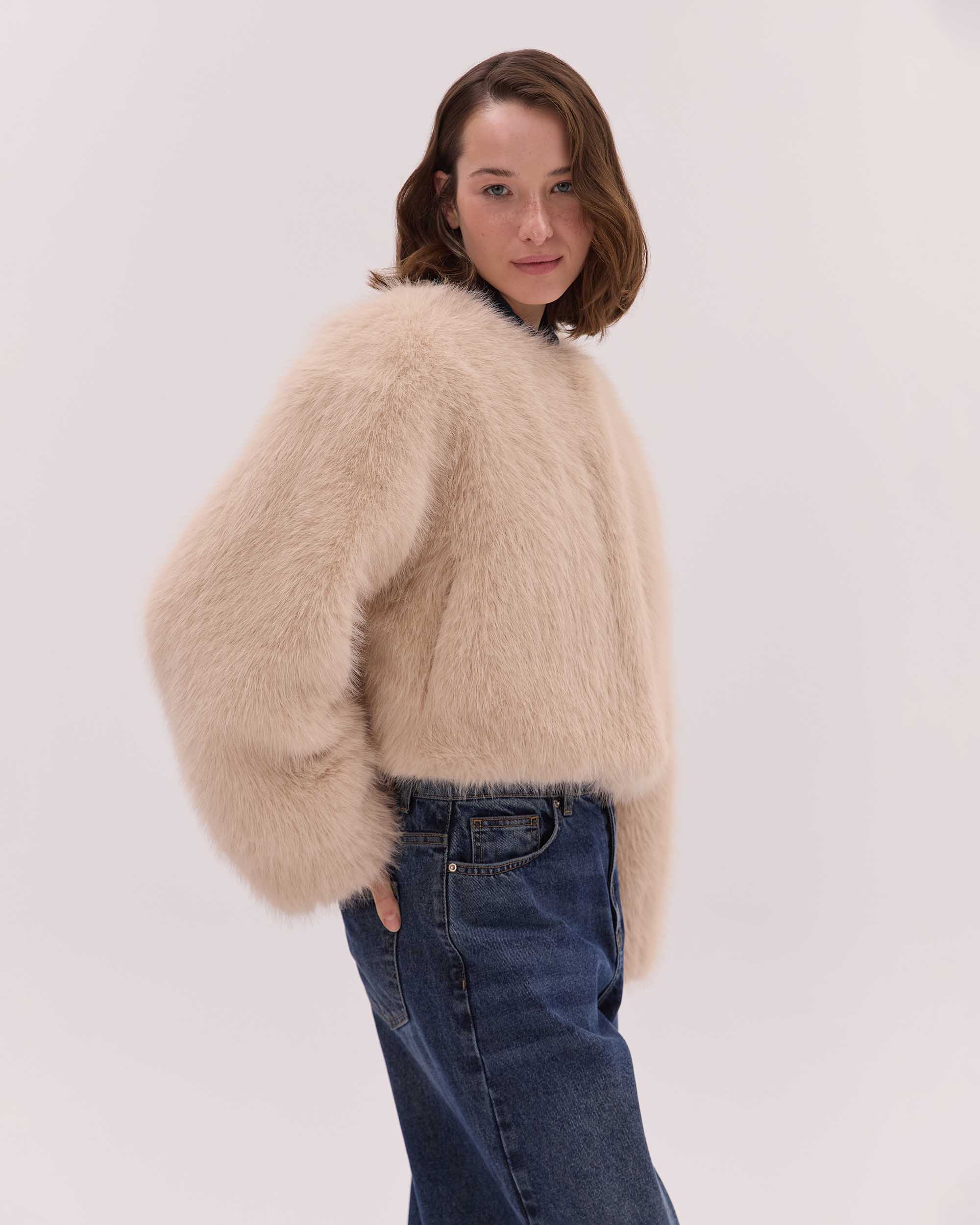 Эффектная укороченная шуба из пушистого экомеха под песца.