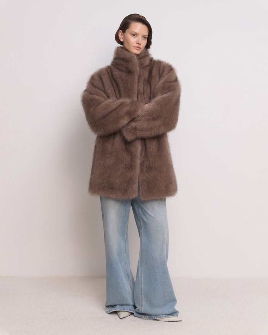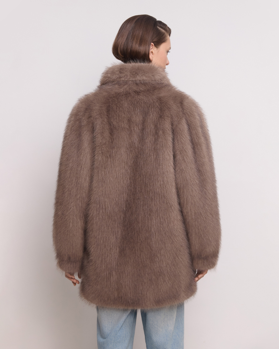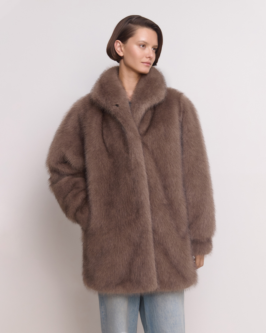 Пушистая и классная! Экошуба оверсайз фасона с эффектным воротником апаш и объемными рукавами. Каждая деталь продумана для защиты от холода: воротник поднимается и застегивается на крючок, а на рукавах есть манжеты. Одинаково хорошо смотрится и с повседневными образами, и с вечерним платьем.