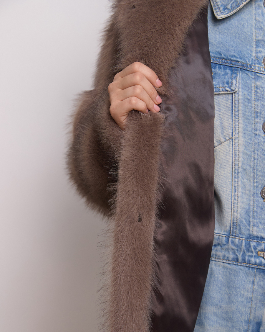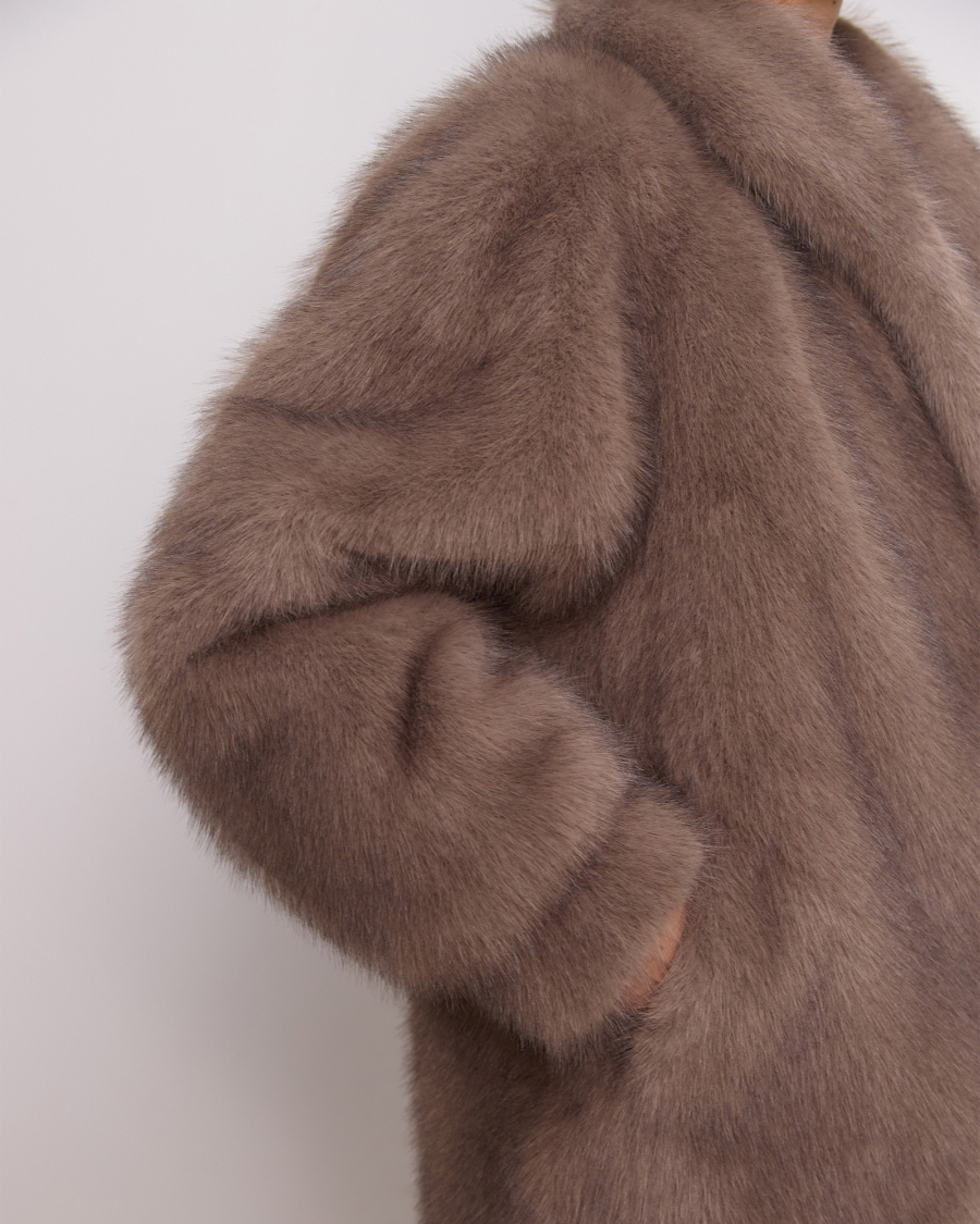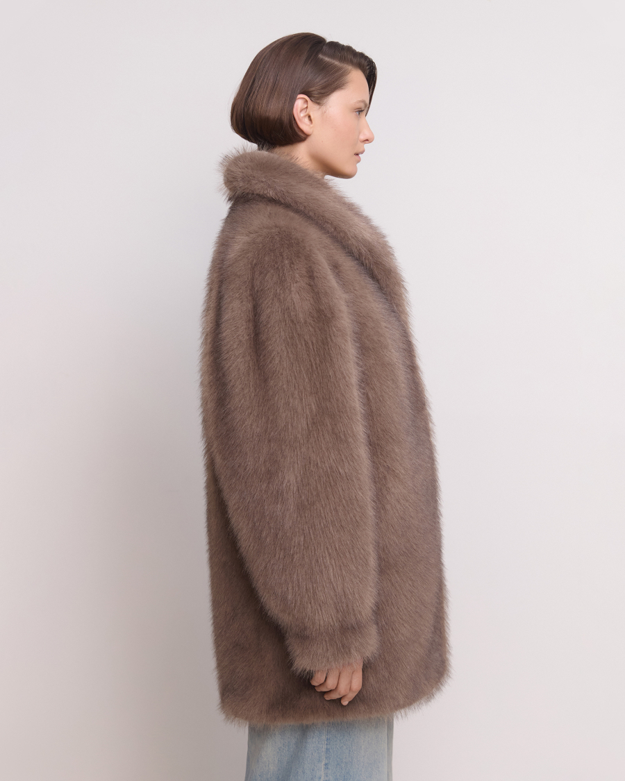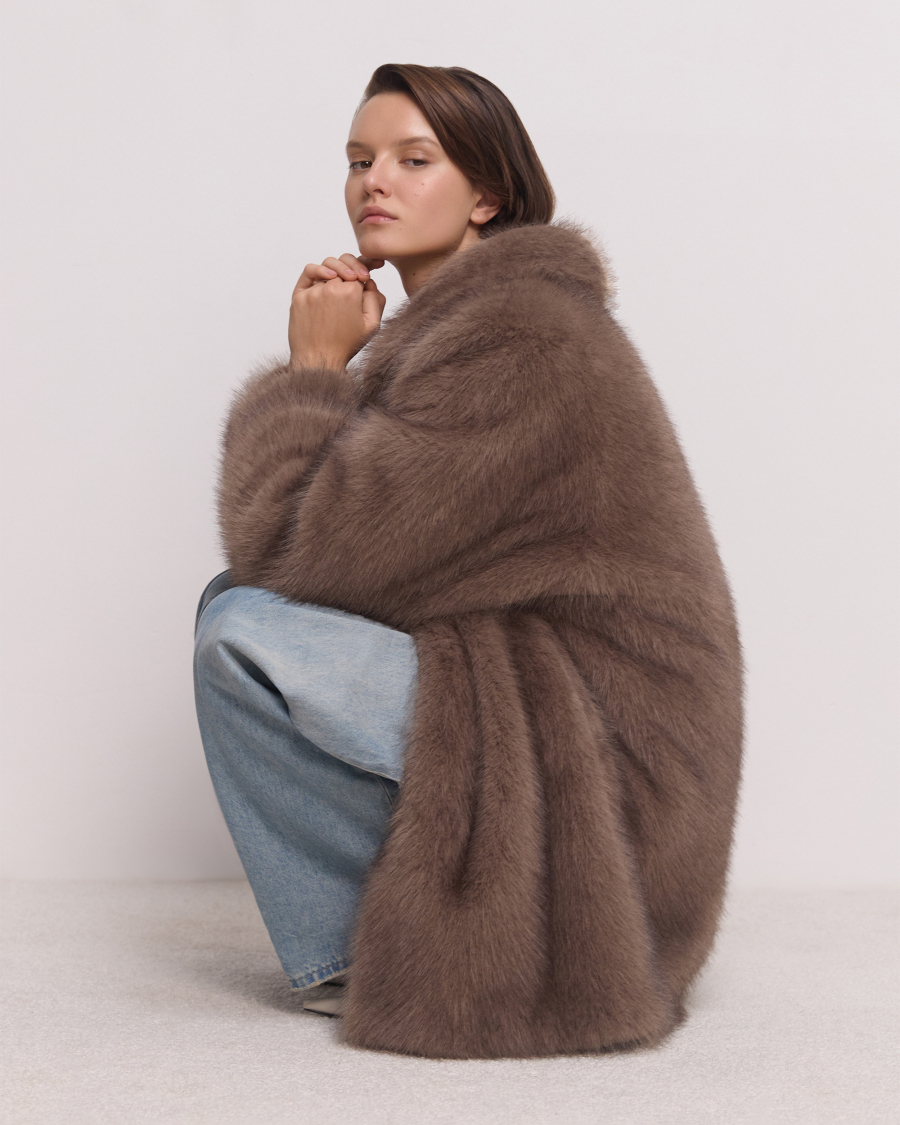 Пушистая и классная! Экошуба оверсайз фасона с эффектным воротником апаш и объемными рукавами. Каждая деталь продумана для защиты от холода: воротник поднимается и застегивается на крючок, а на рукавах есть манжеты. Одинаково хорошо смотрится и с повседневными образами, и с вечерним платьем.