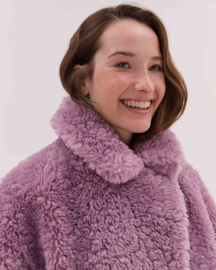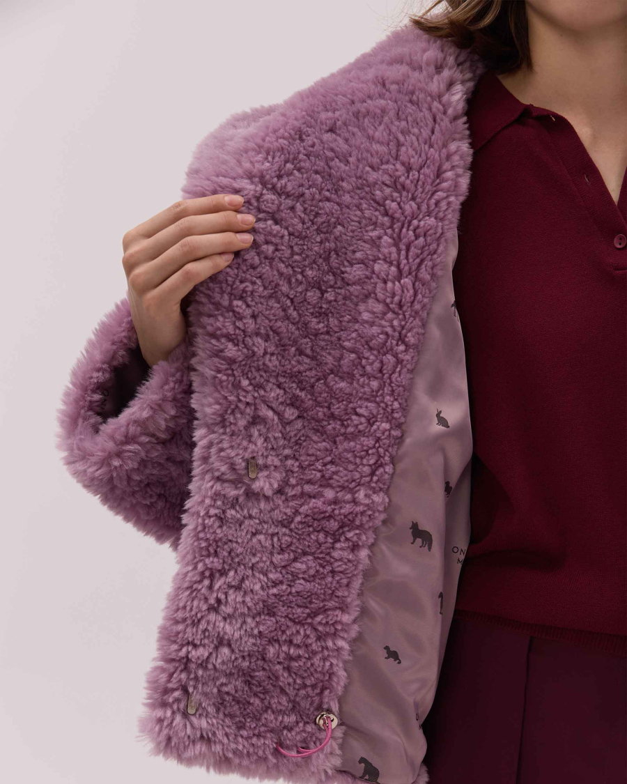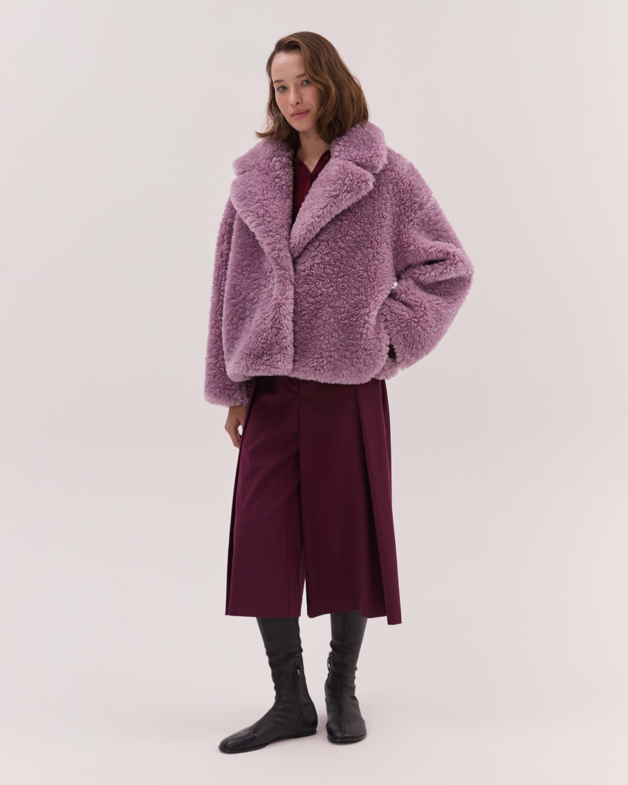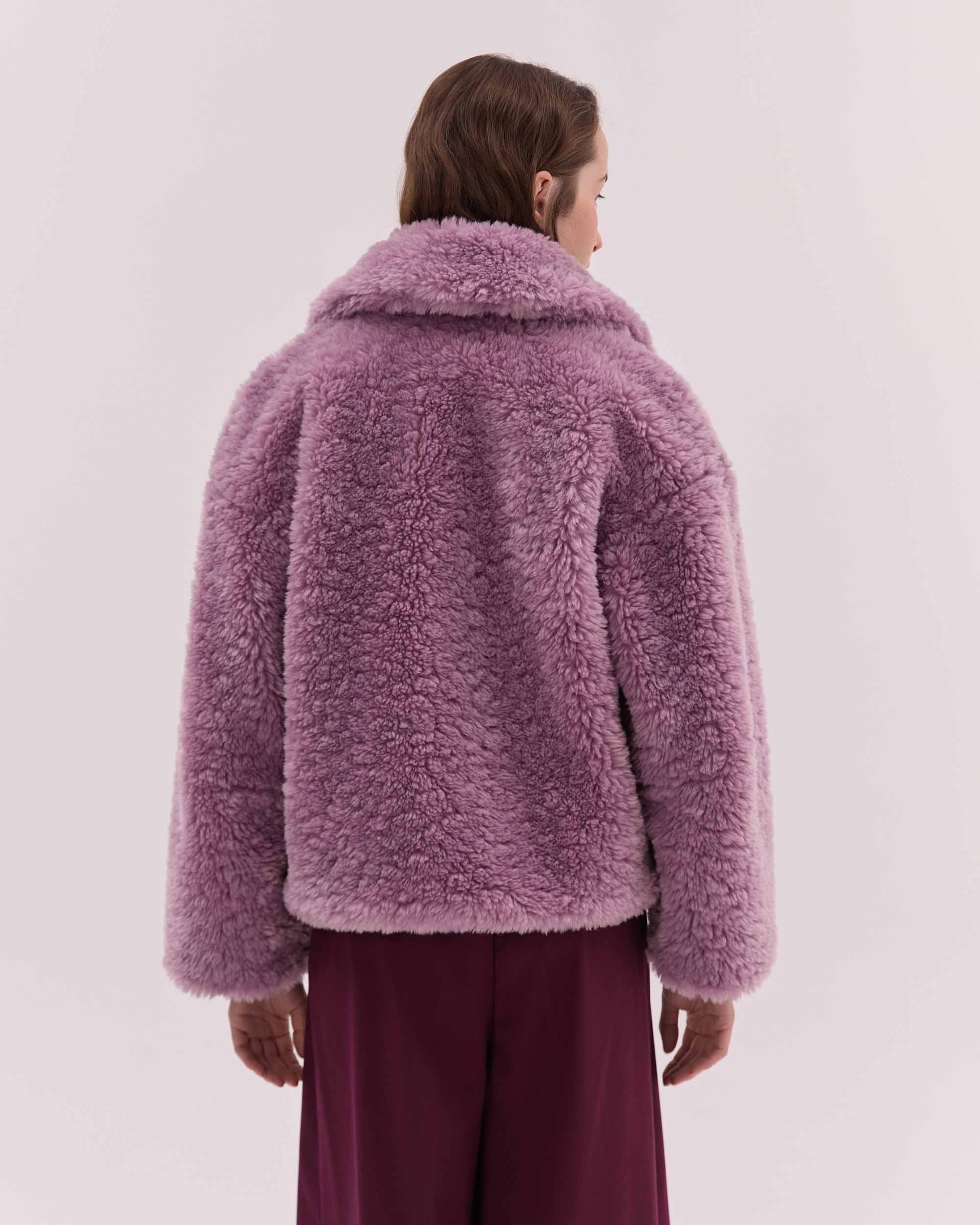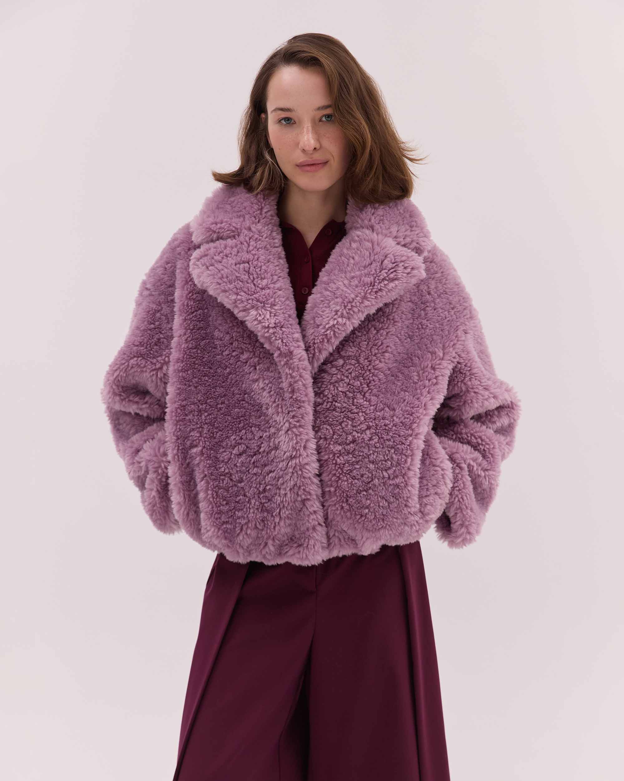 Укороченная шуба из экомеха под барашка в актуальном лавандовом оттенке.