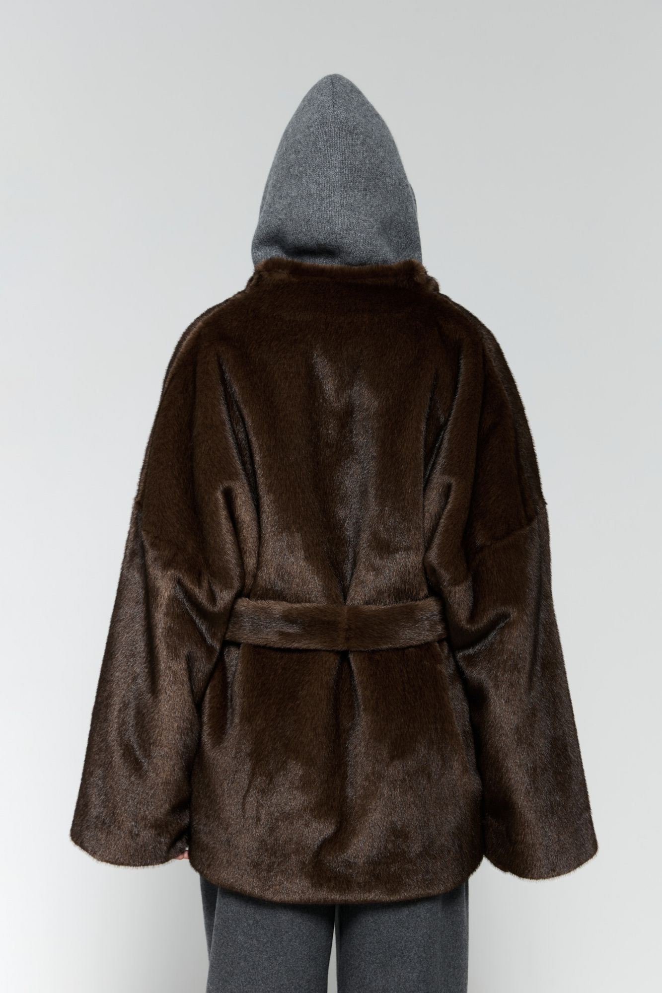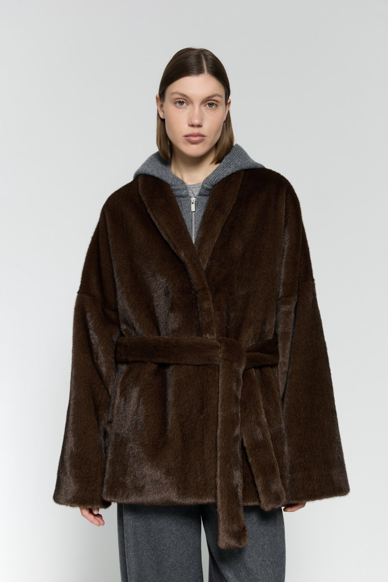 Меховое полупальто сшито из искусственного меха. У него качественная выделка под норку, которая выглядит благородно и имитирует натуральный мех. При этом материал соответствует эко-принципам и поддерживает осознанное потребление.