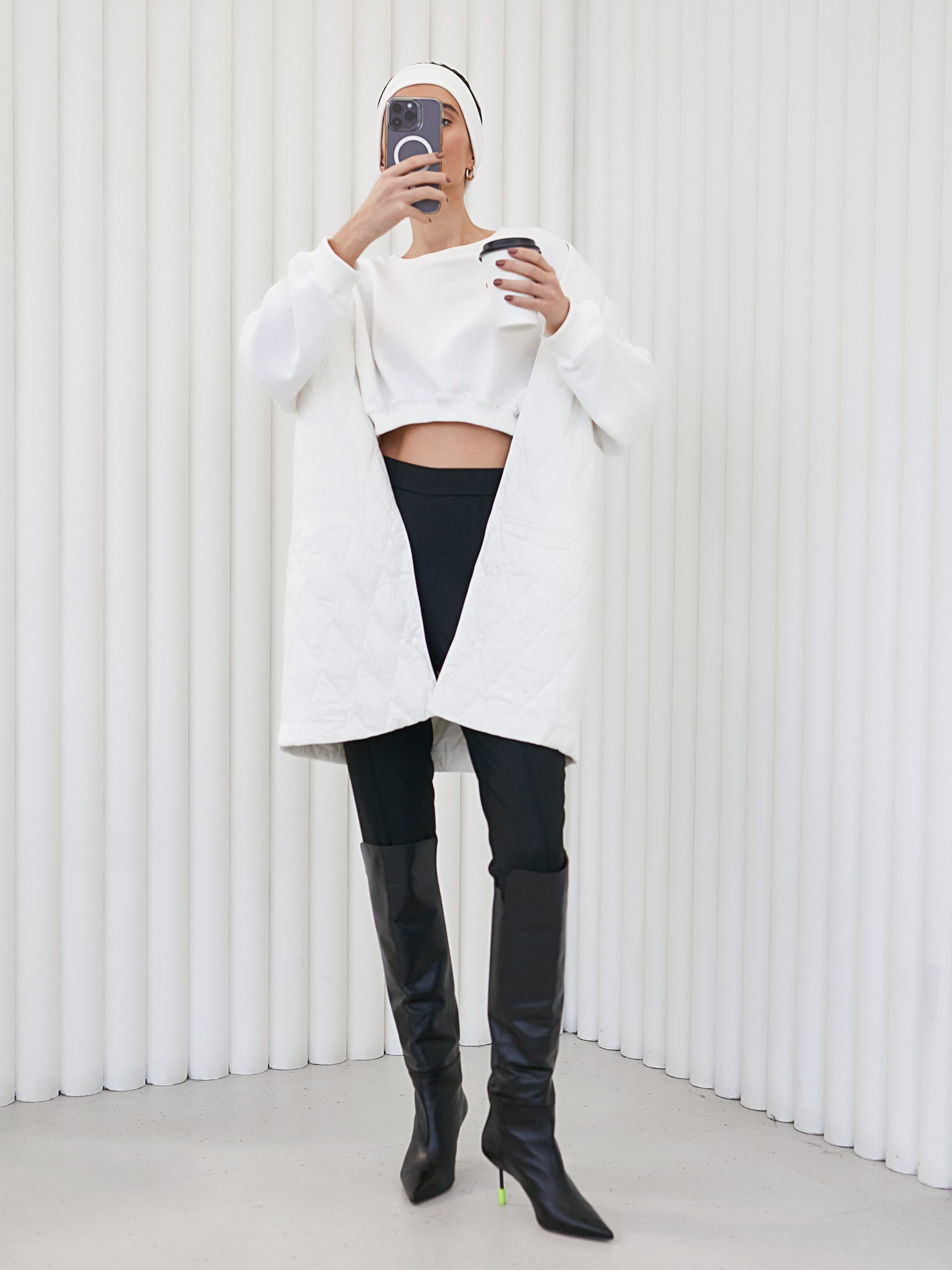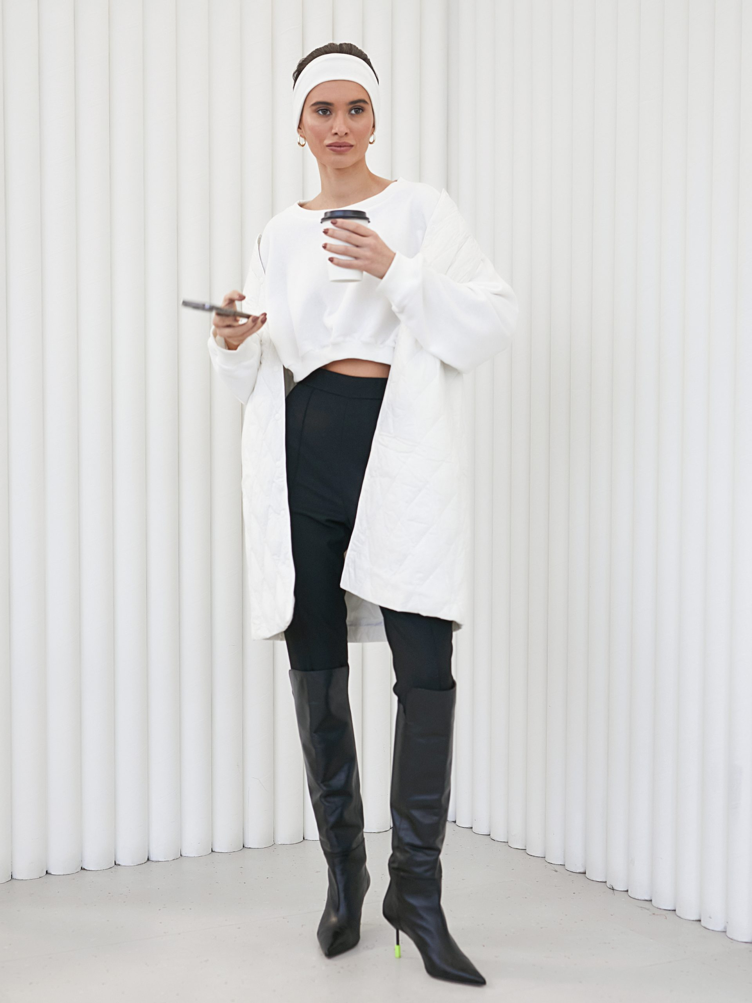 Пуховой жилет, длина до колена, центральная застежка на кнопки.
