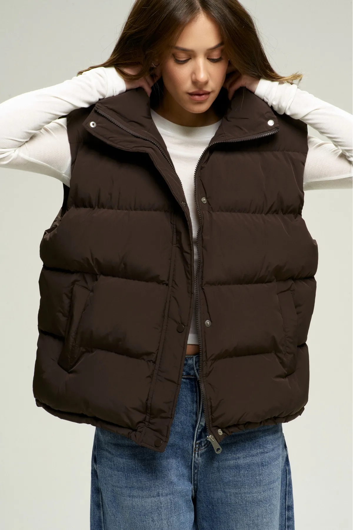 Тёплый жилет оверсайз с приятной матовой фактурой ткани, которая выглядит сдержанно и тактильно приятно. Низ на кулиске даёт свободу выбора: оставьте силуэт распахнутым или стяните, визуально подчеркнув дутость. Высокий воротник‑стойка и планка надёжно сохраняют тепло, а удобные карманы добавляют практичности.