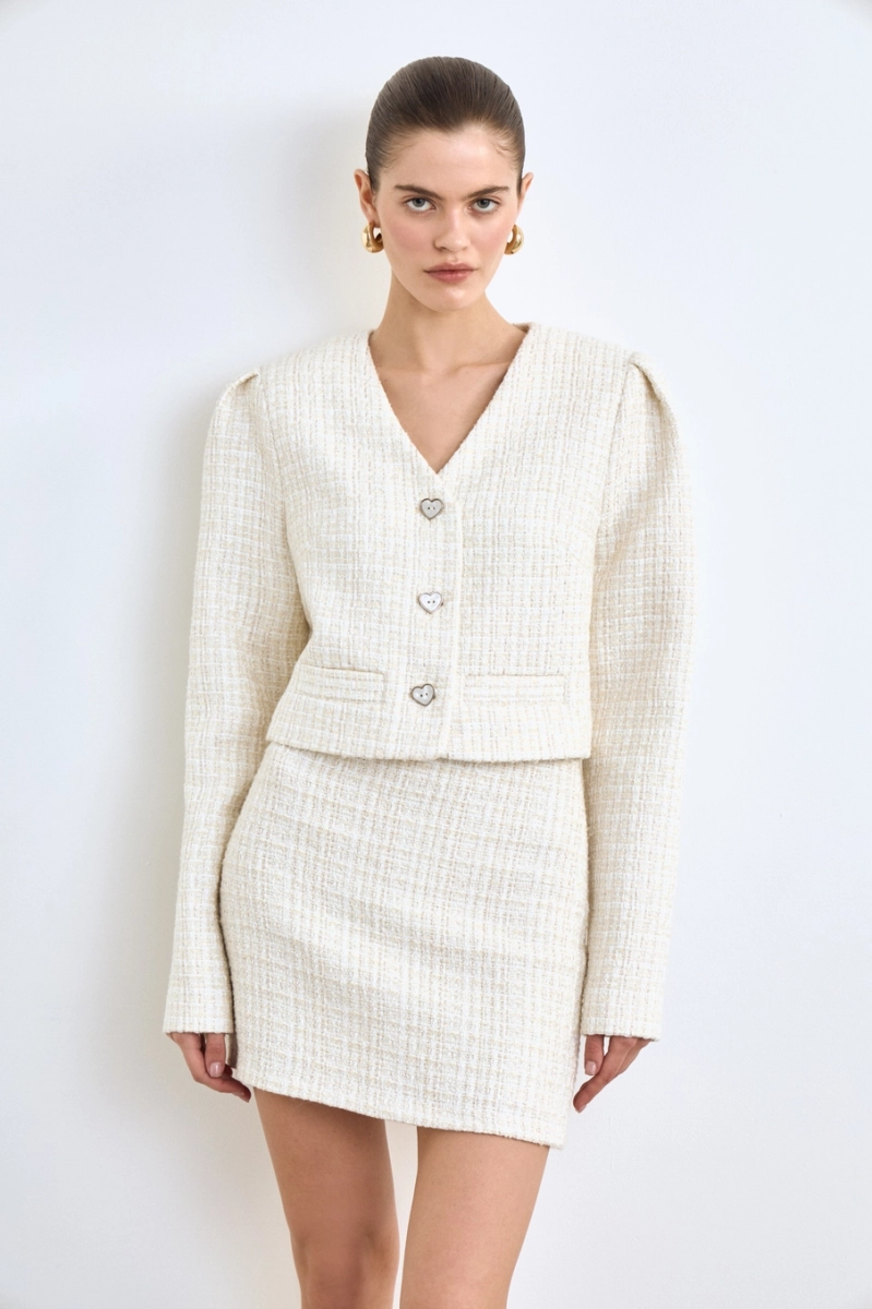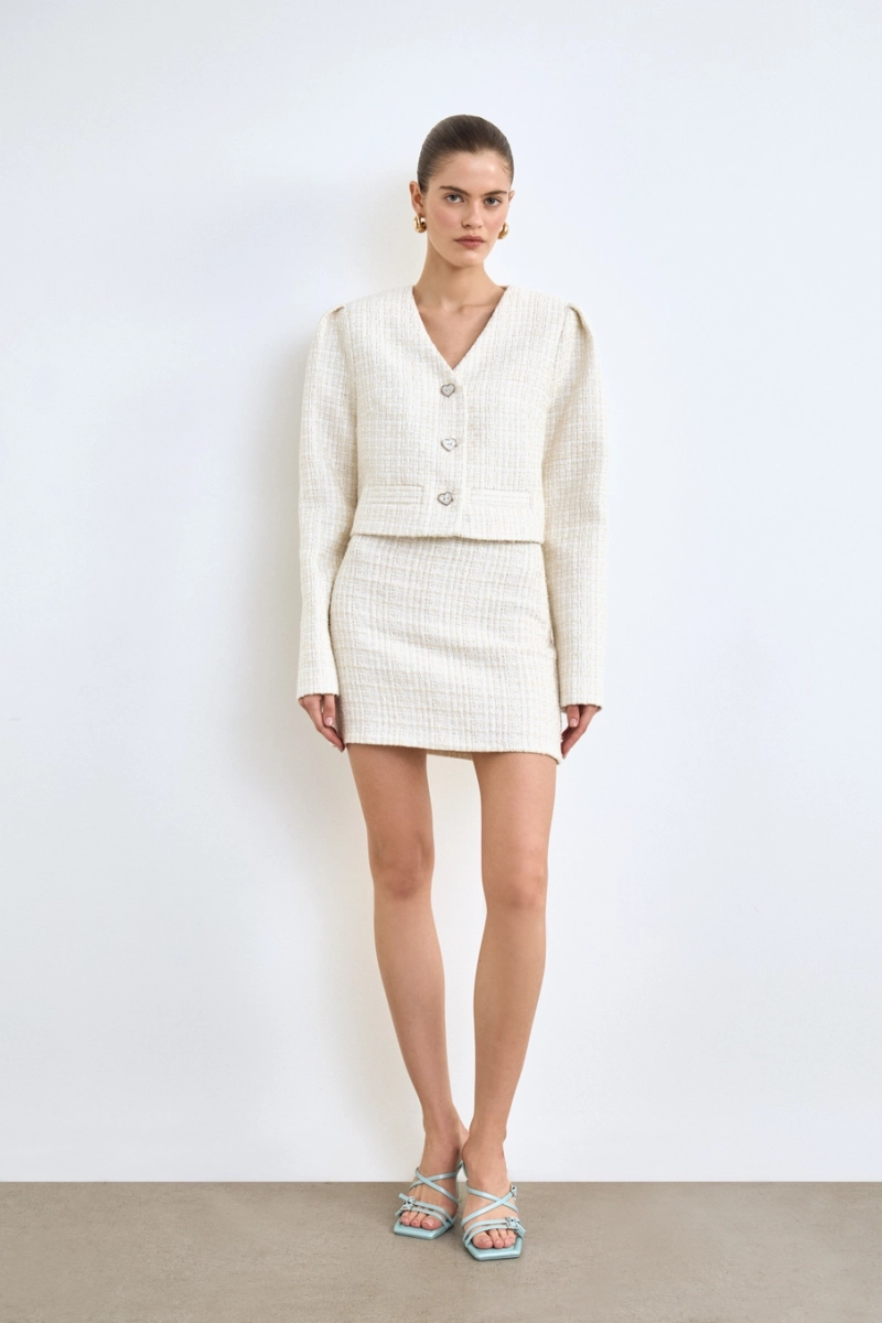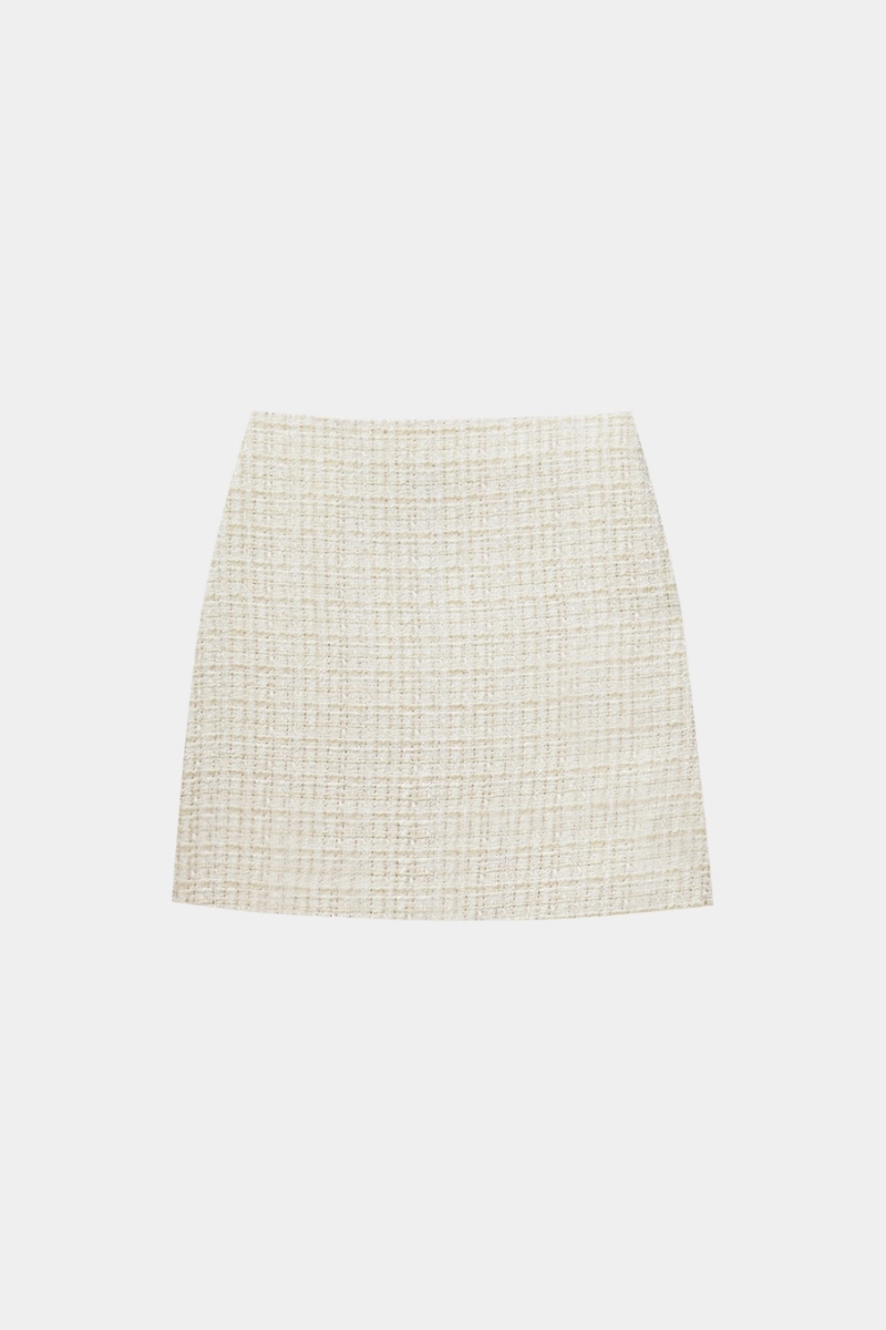 Юбка длины мини из твида. Прямая модель с плотной посадкой на бедрах. Создайте образ в стиле old money, добавив жакет из аналогичной ткани и лоферы на грубой подошве.