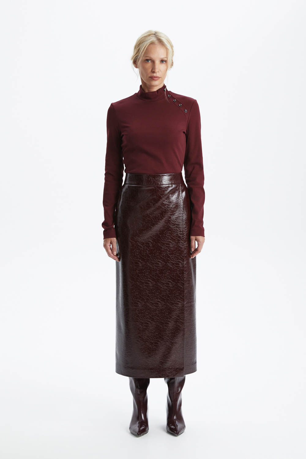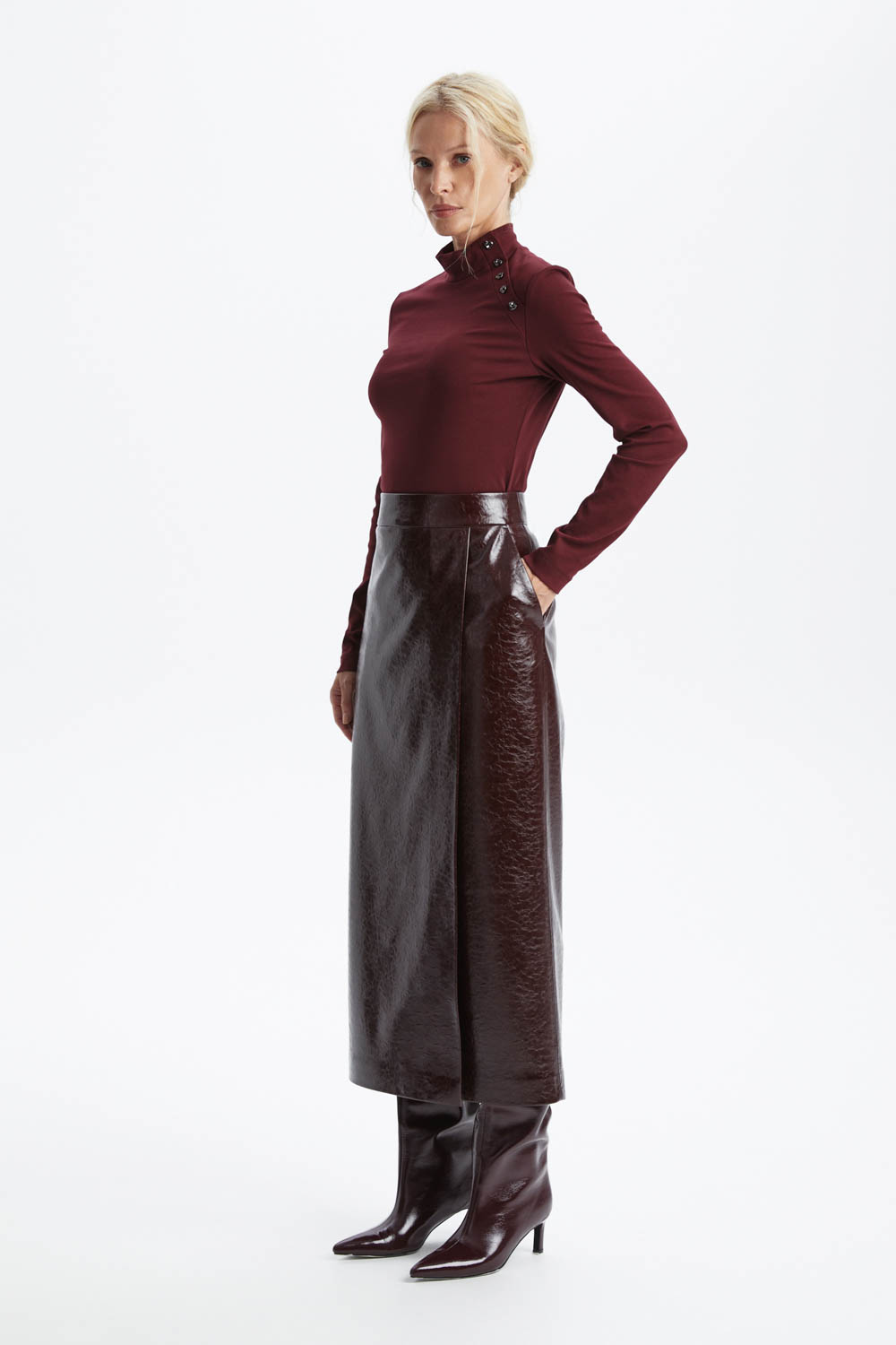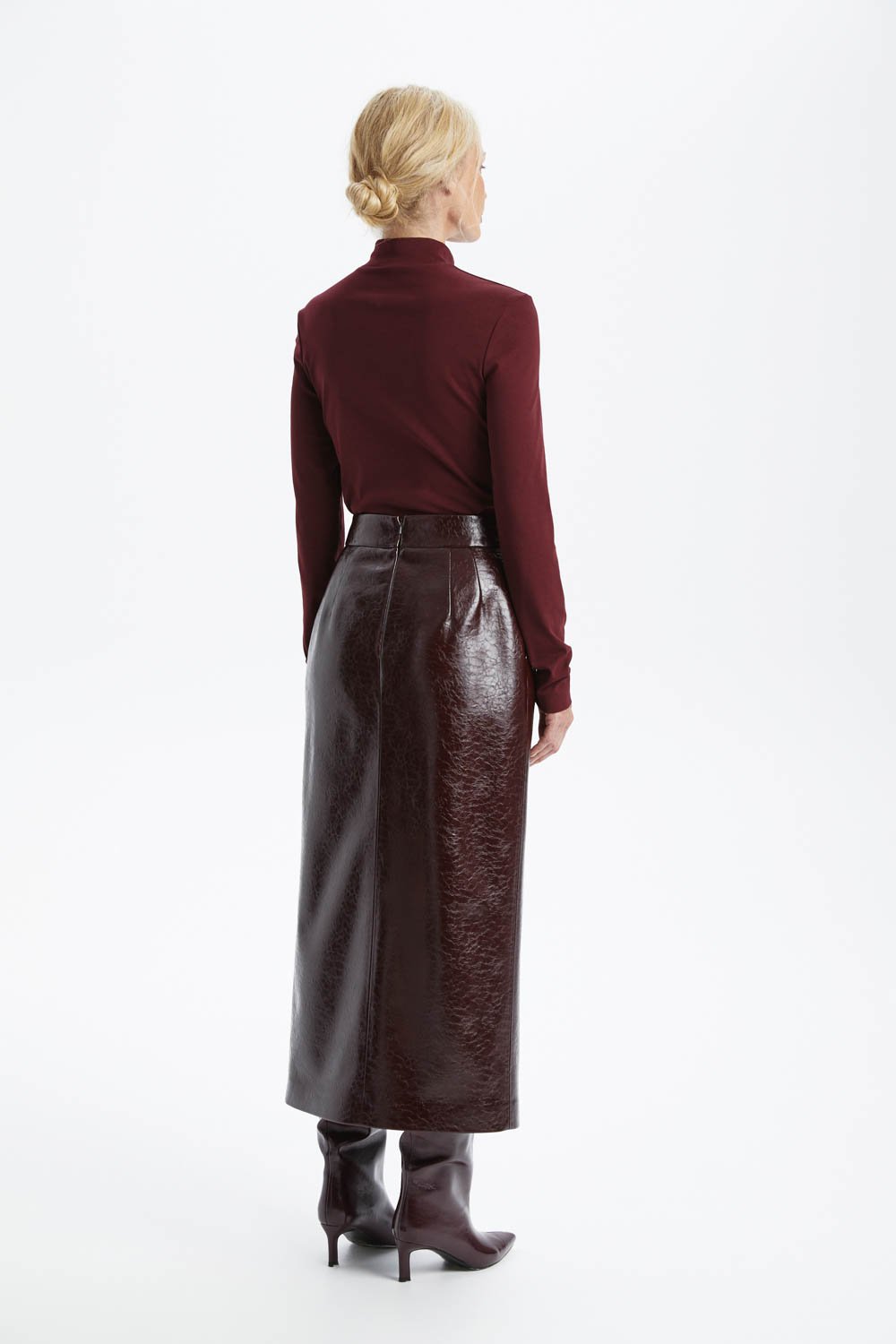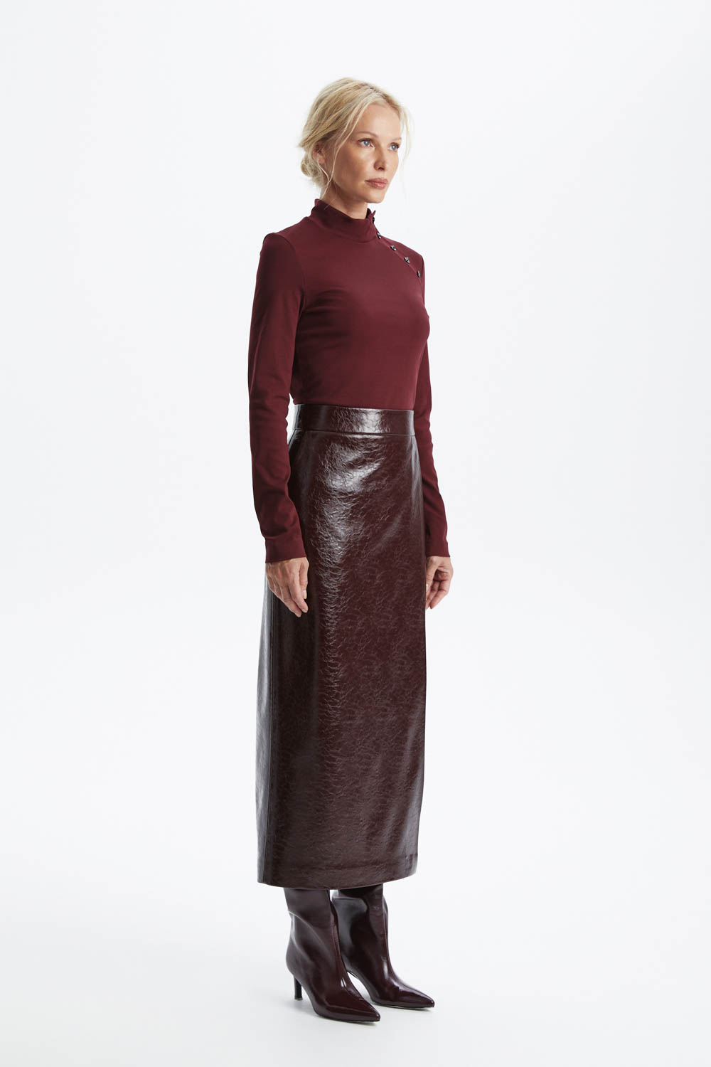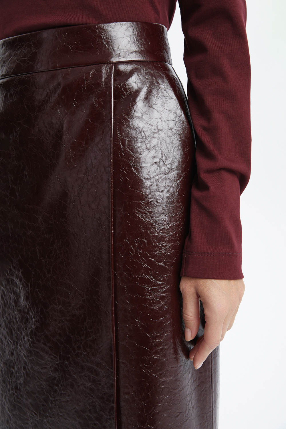 Юбка миди прямого силуэта выполнена из мягкой фактурной искусственной кожи глубокого винно-вишнёвого оттенка с деликатным глянцевым финишем, который придаёт образу благородство и современный блеск.