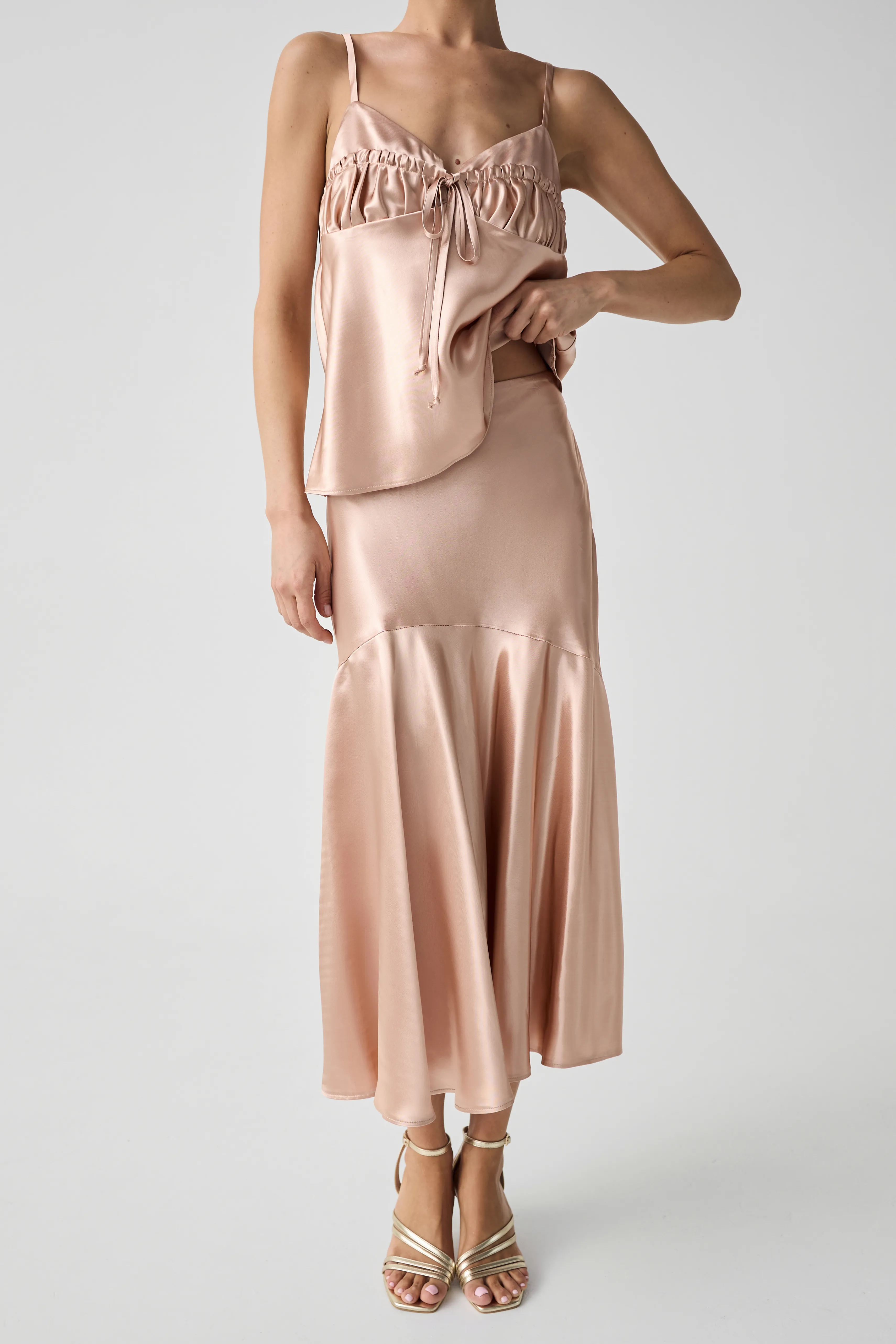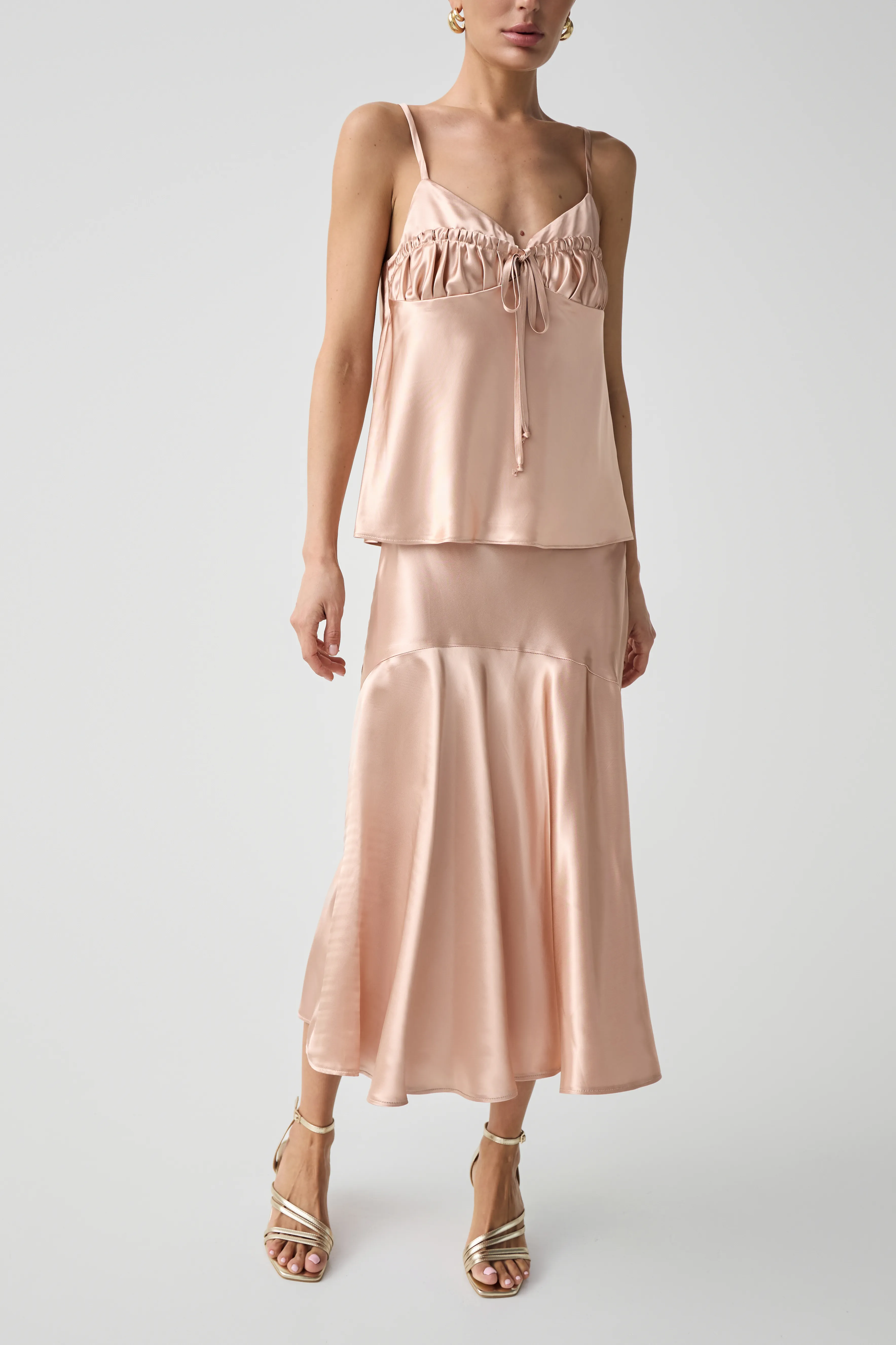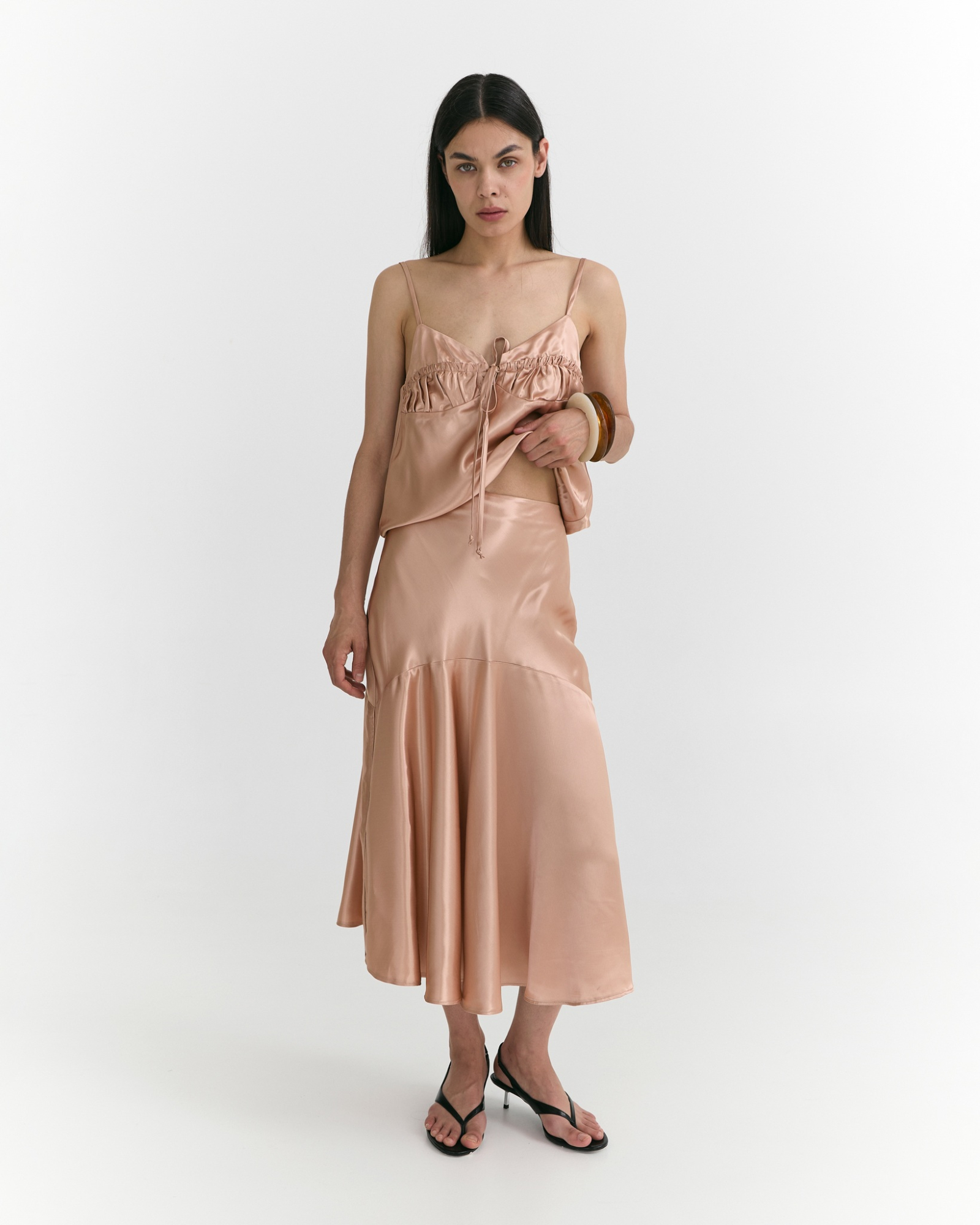 Юбка в бельевом стиле из премиальной итальянской вискозы - это воплощение легкости и утонченности. Юбка идет в дополнение к аналогичному топу, а сверху можно накинуть жакет.