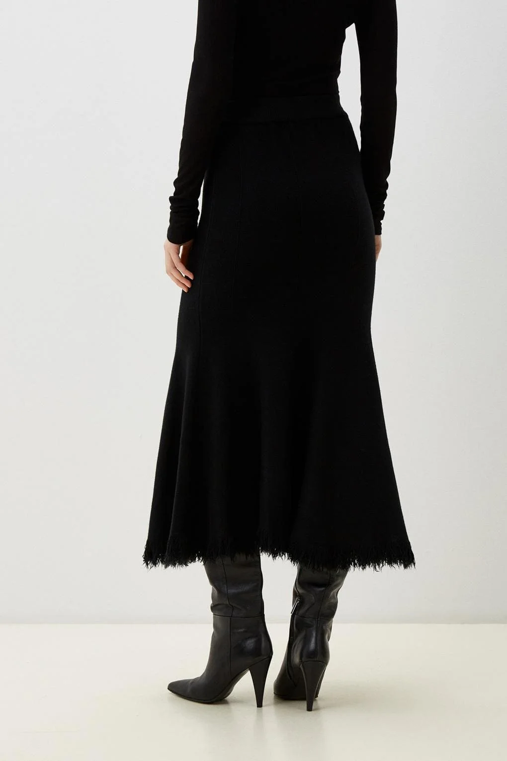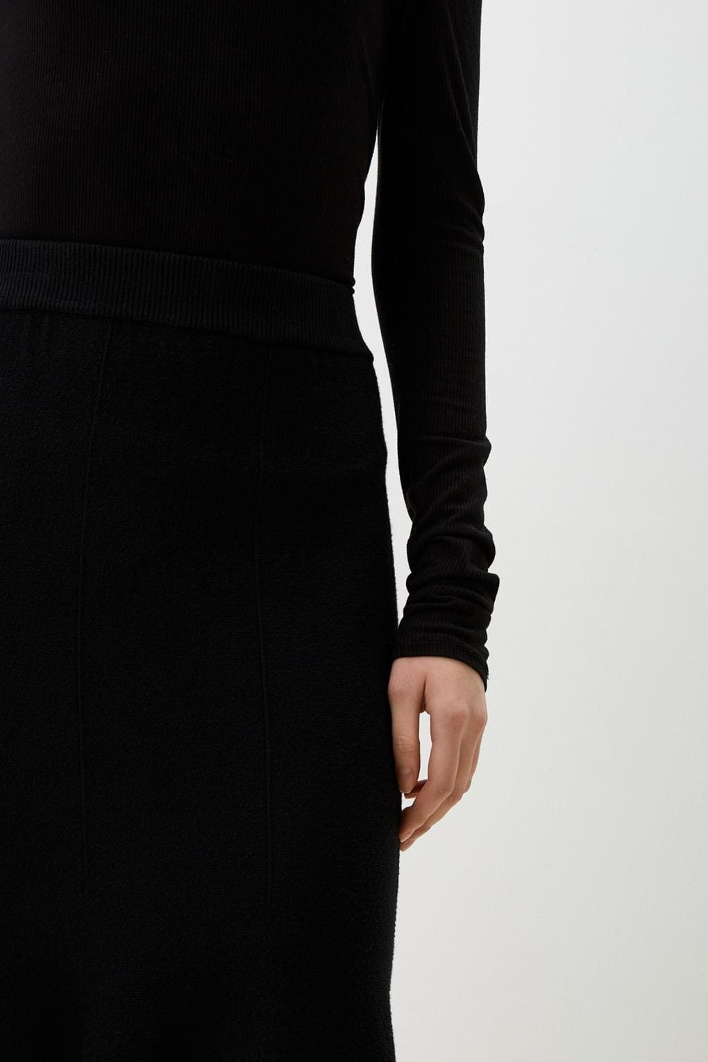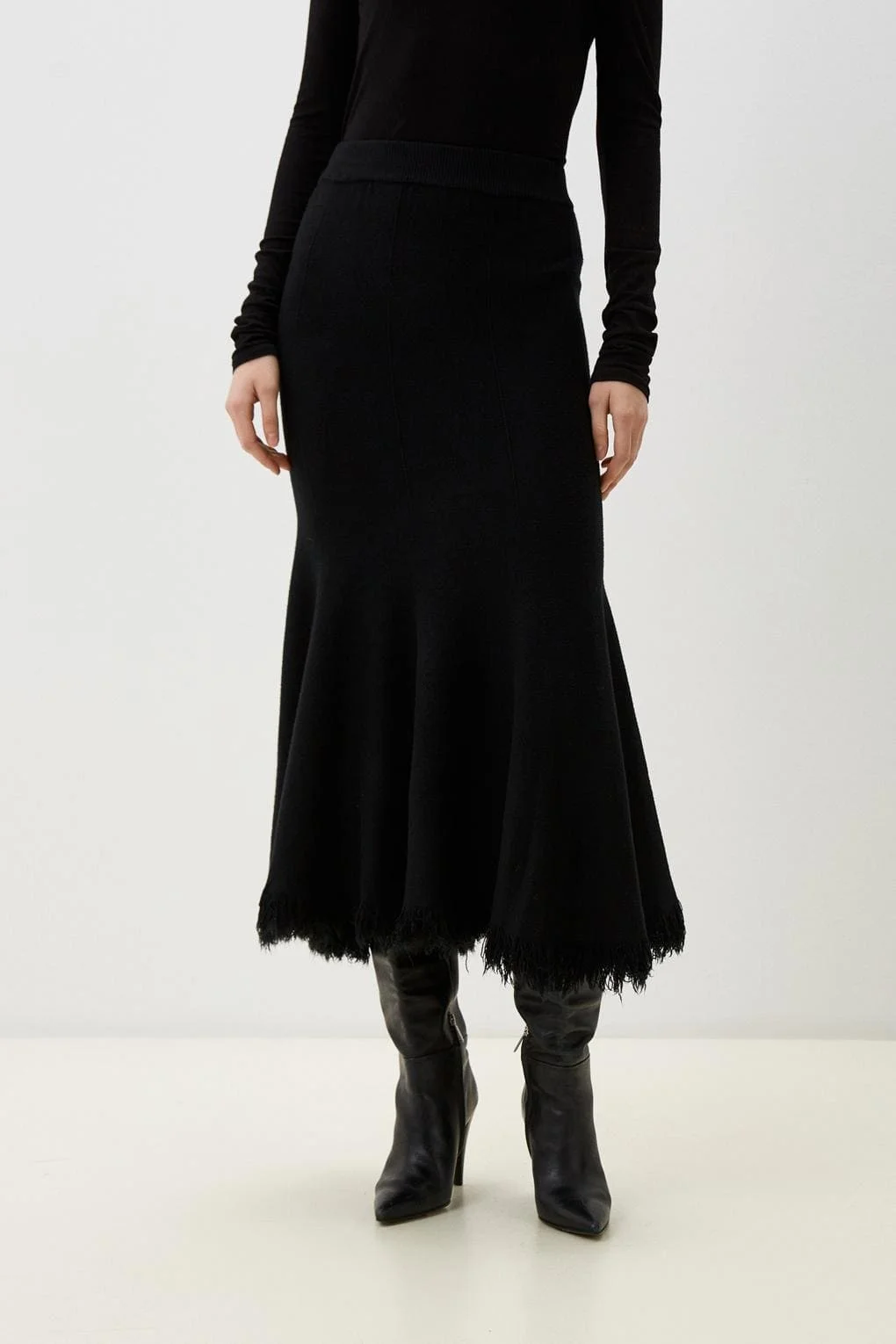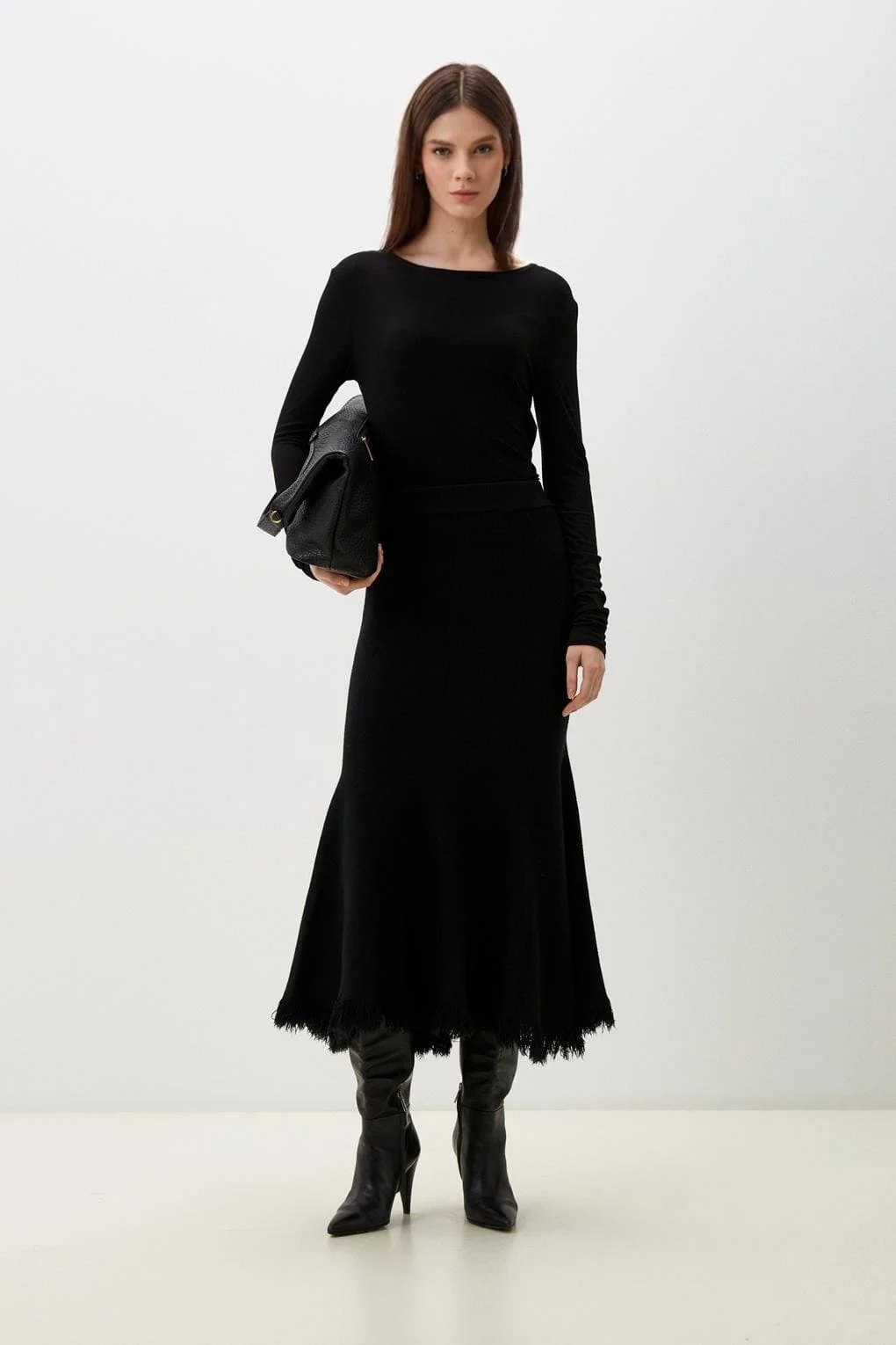 Мягкий трикотаж, высокая посадка и динамичный край. Универсальная модель для выразительных осенне-зимних образов.