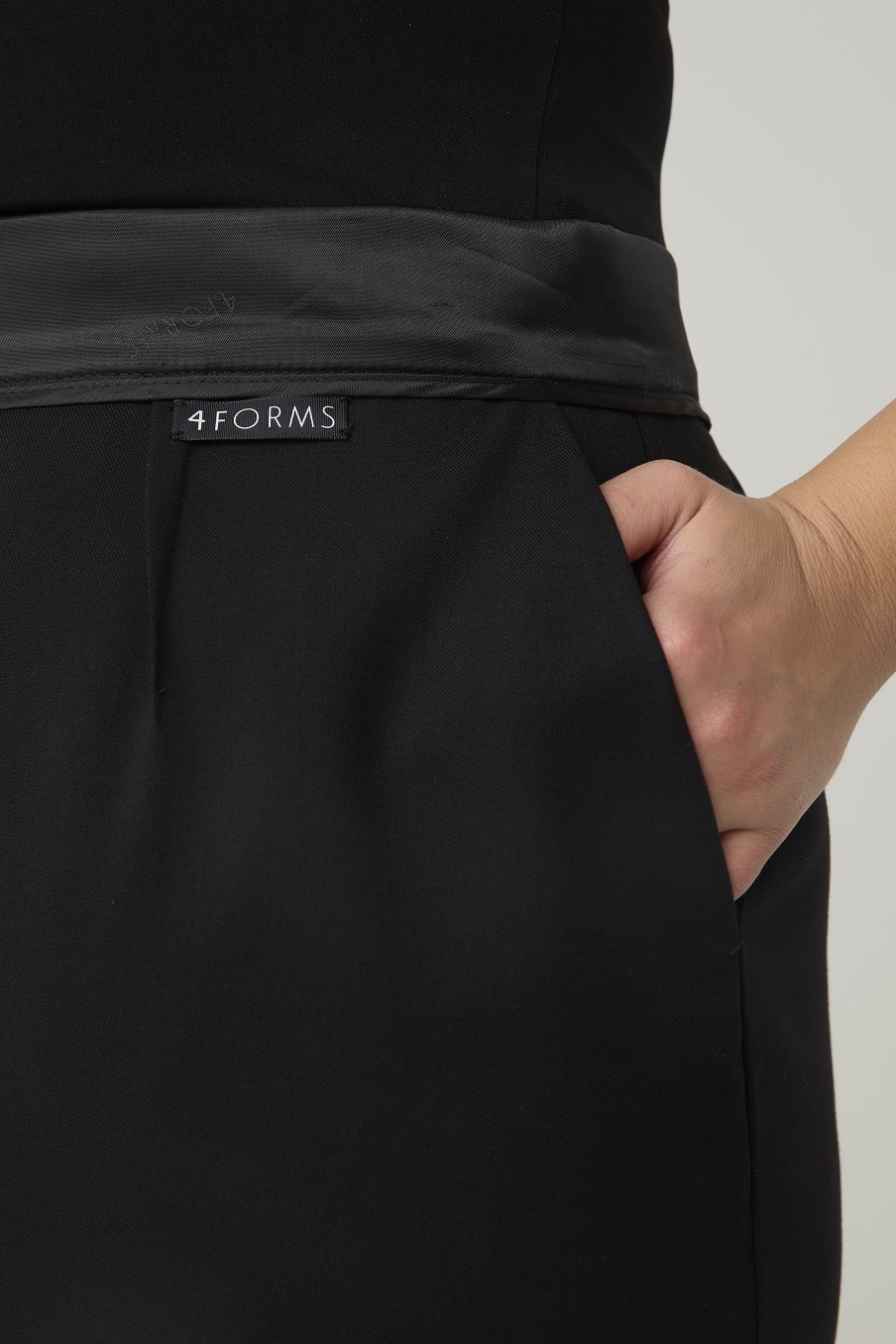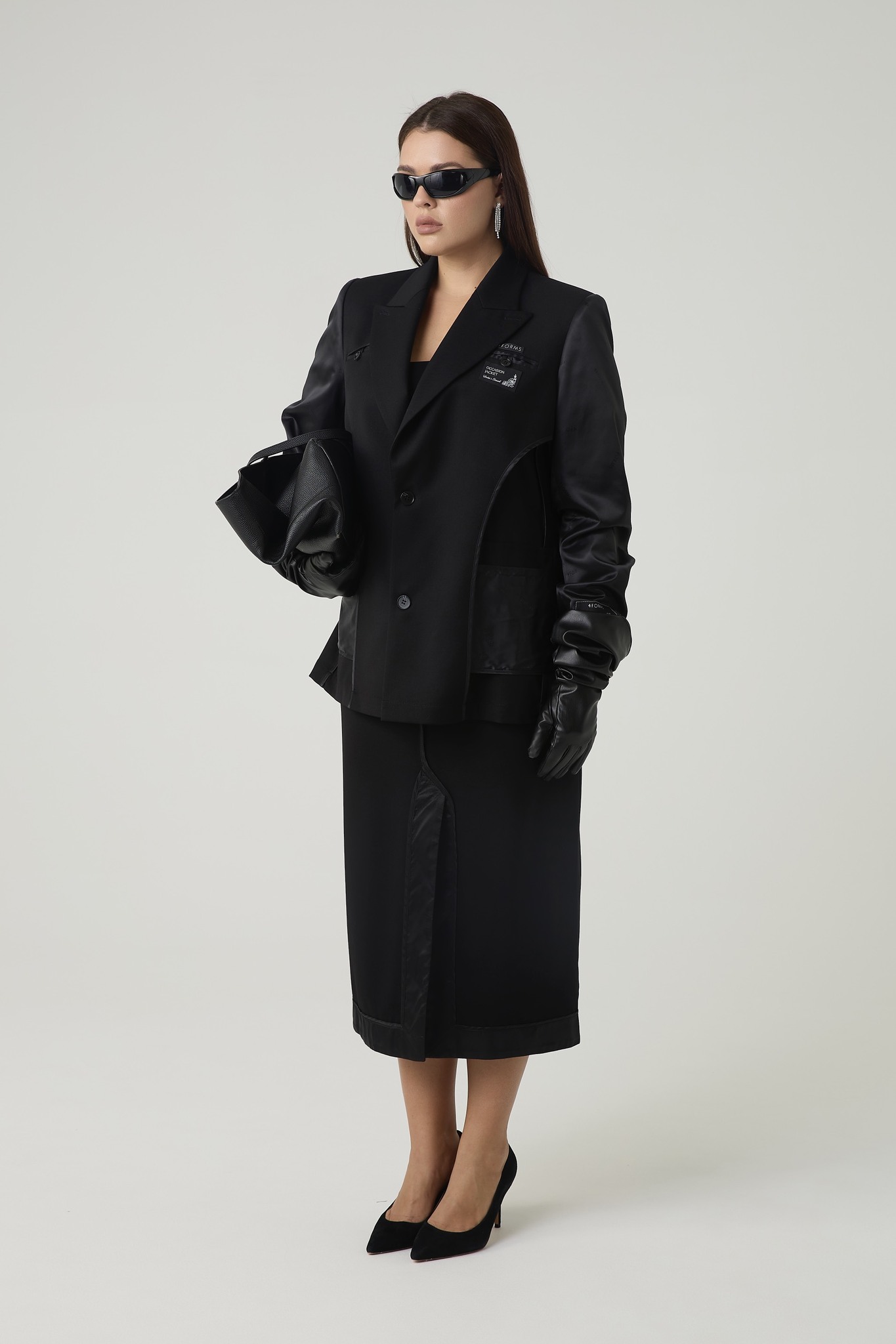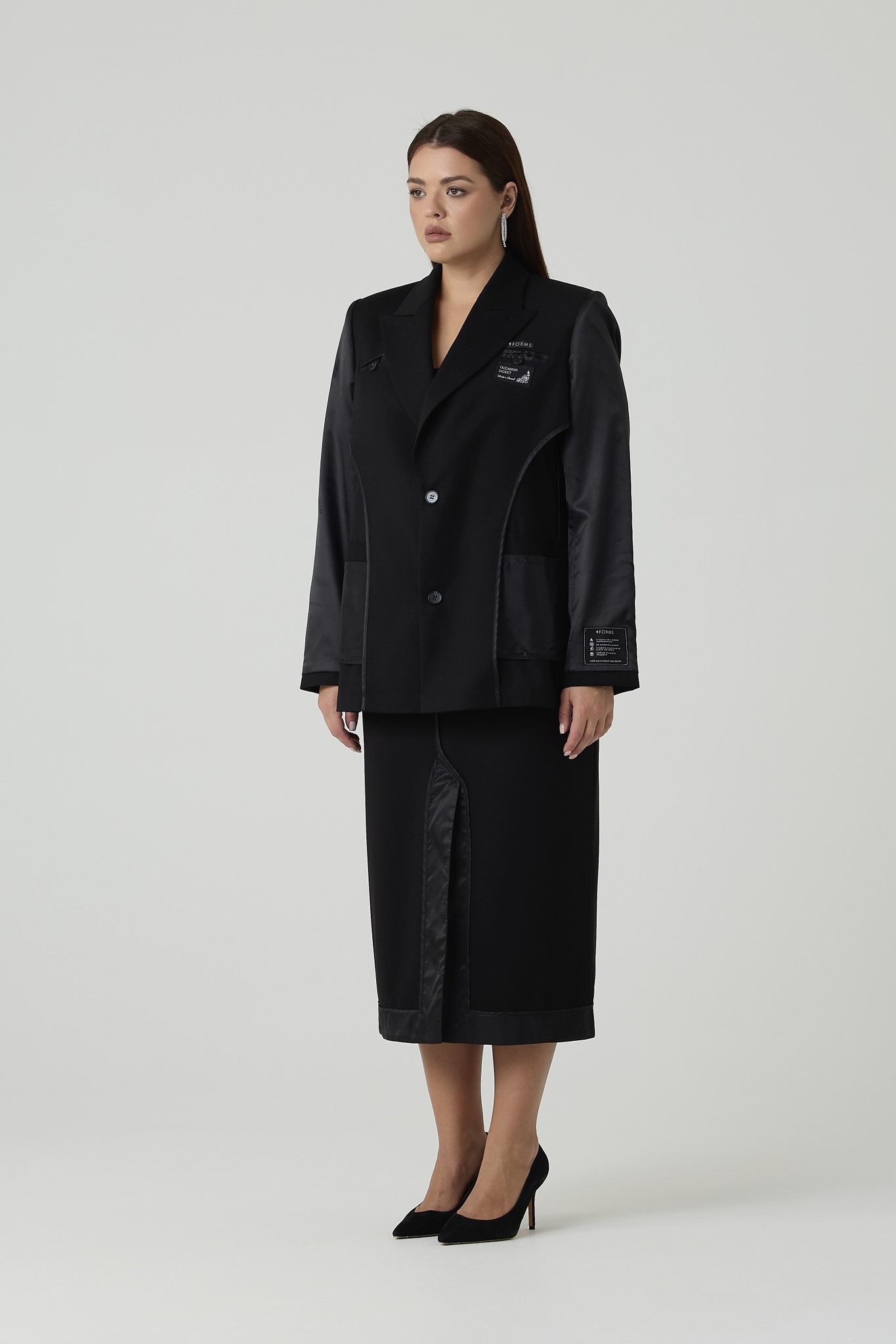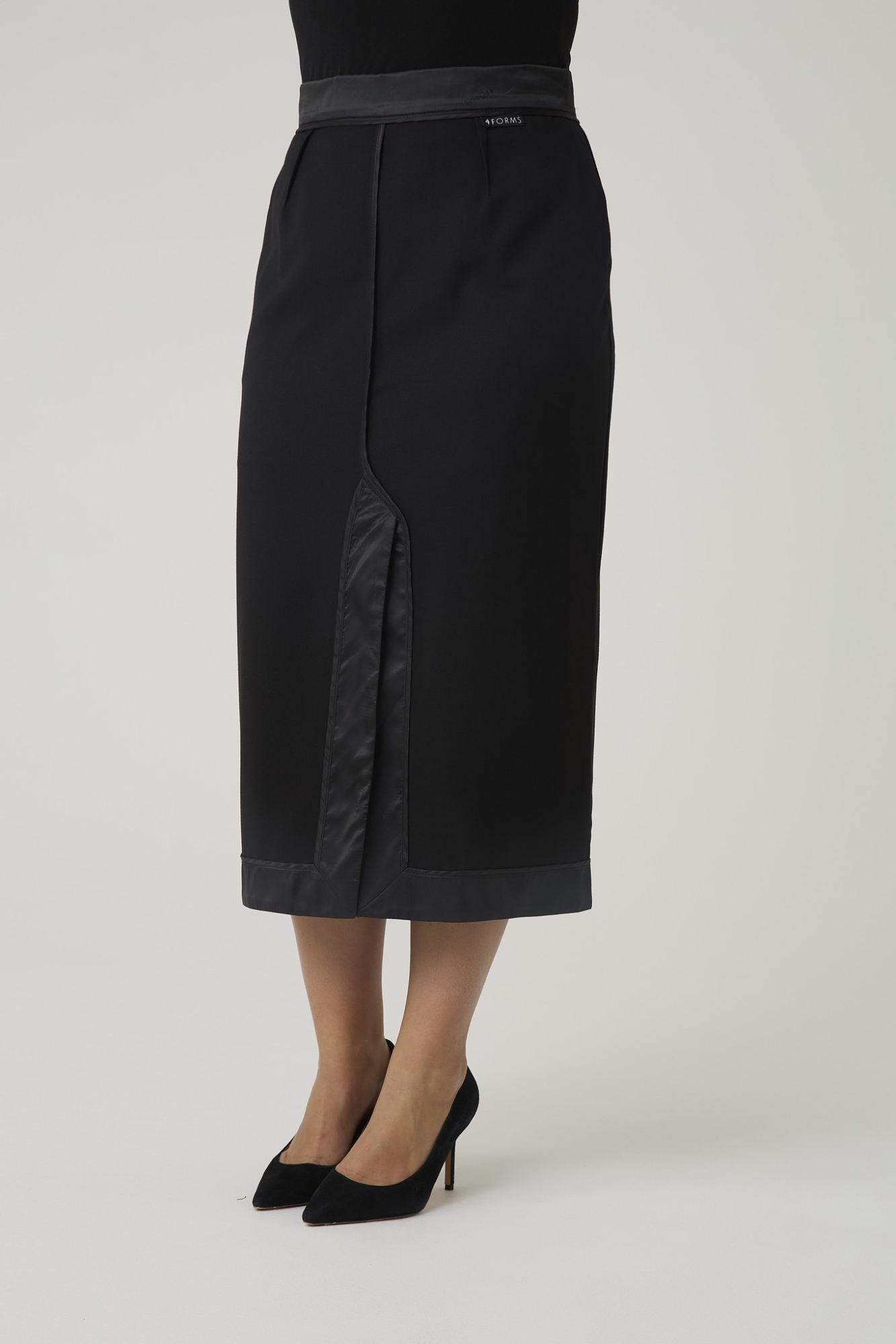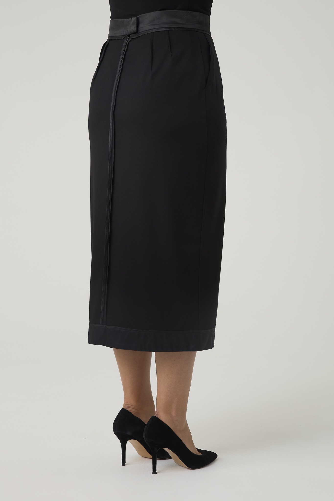 Женская юбка черного цвета выполнена из плотной ткани с матовой фактурой и атласной отделкой по поясу, центральному шву и низу изделия.