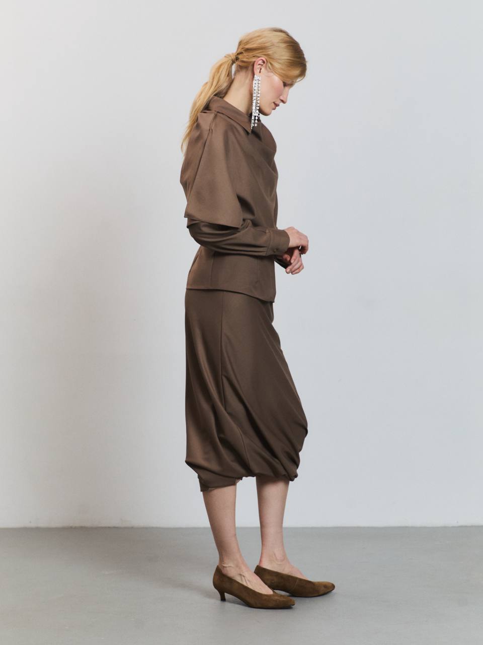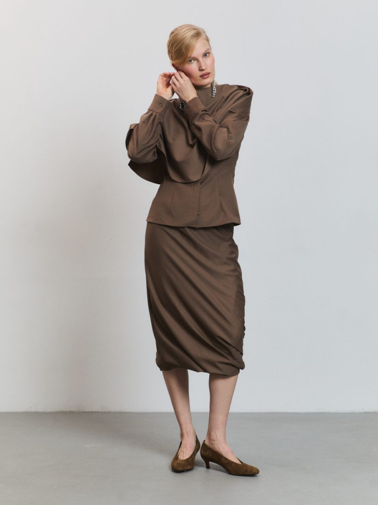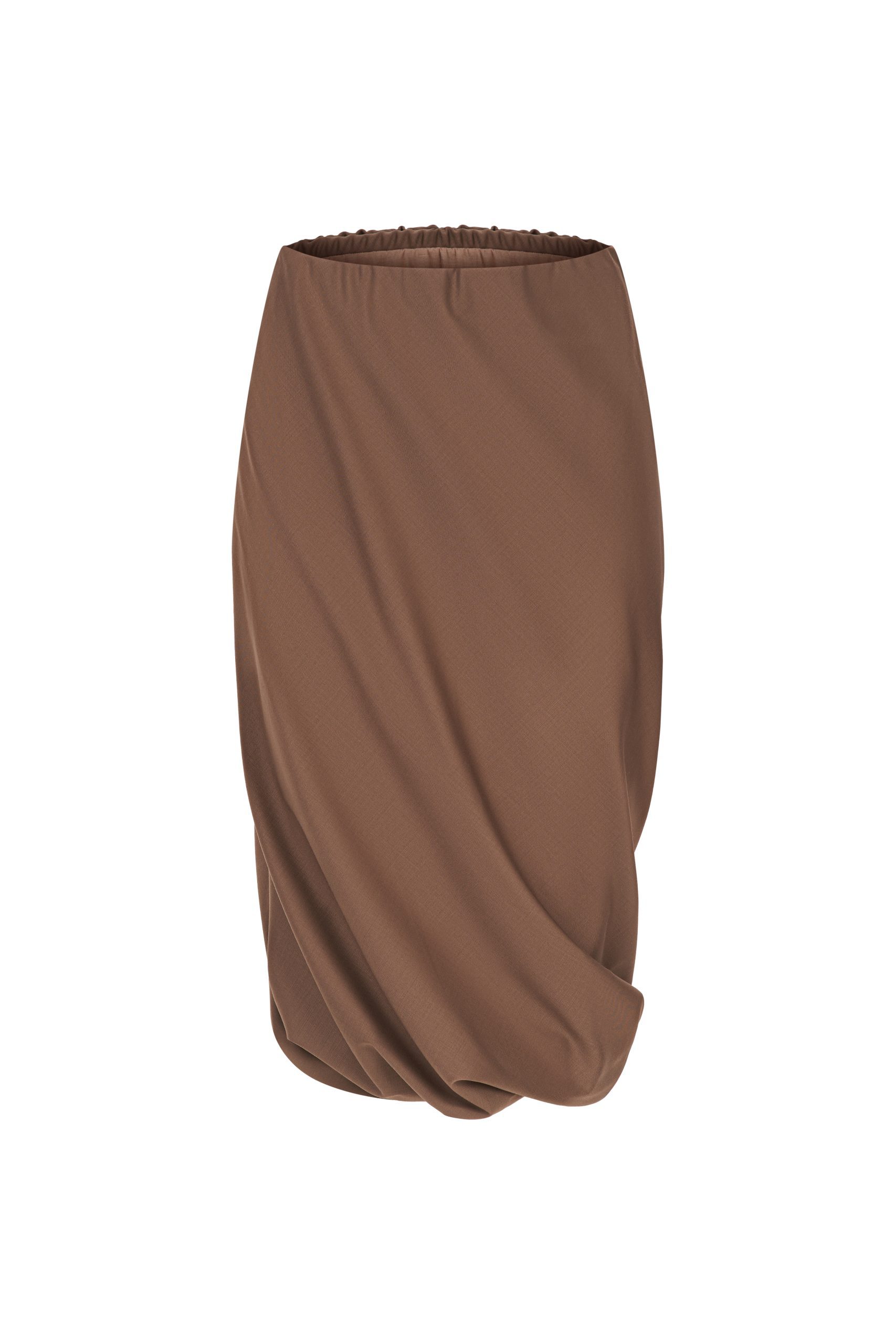 Юбка Wind выполнена из тонкой гладкой шерсти в оттенке тауп. Юбка прямого, слегка ассиметричного кроя, в длине миди, пояс на эластичной резинке. Рекомендуем стилизовать с рубашкой и кейпом Wind.