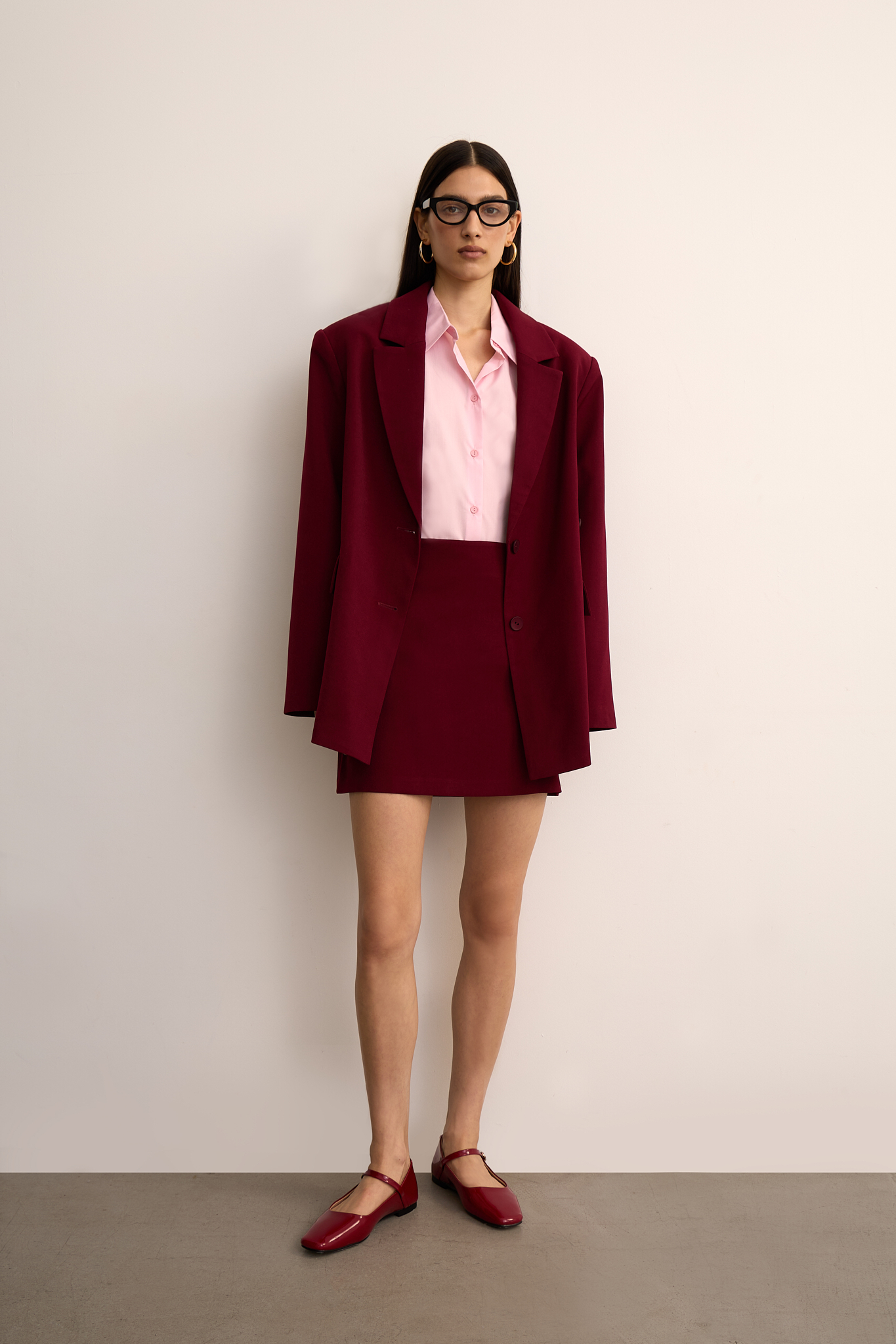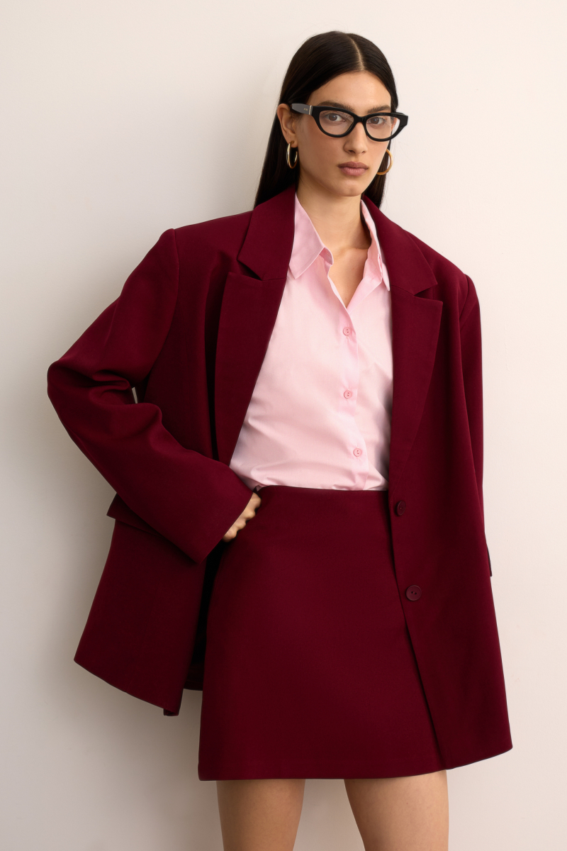 Юбка мини уравновесит жакет с брутальными мощными плечами, составит гармоничное сочетание с классической рубашкой или блузкой. Отличная основа образов на каждый день в модном винном цвете.