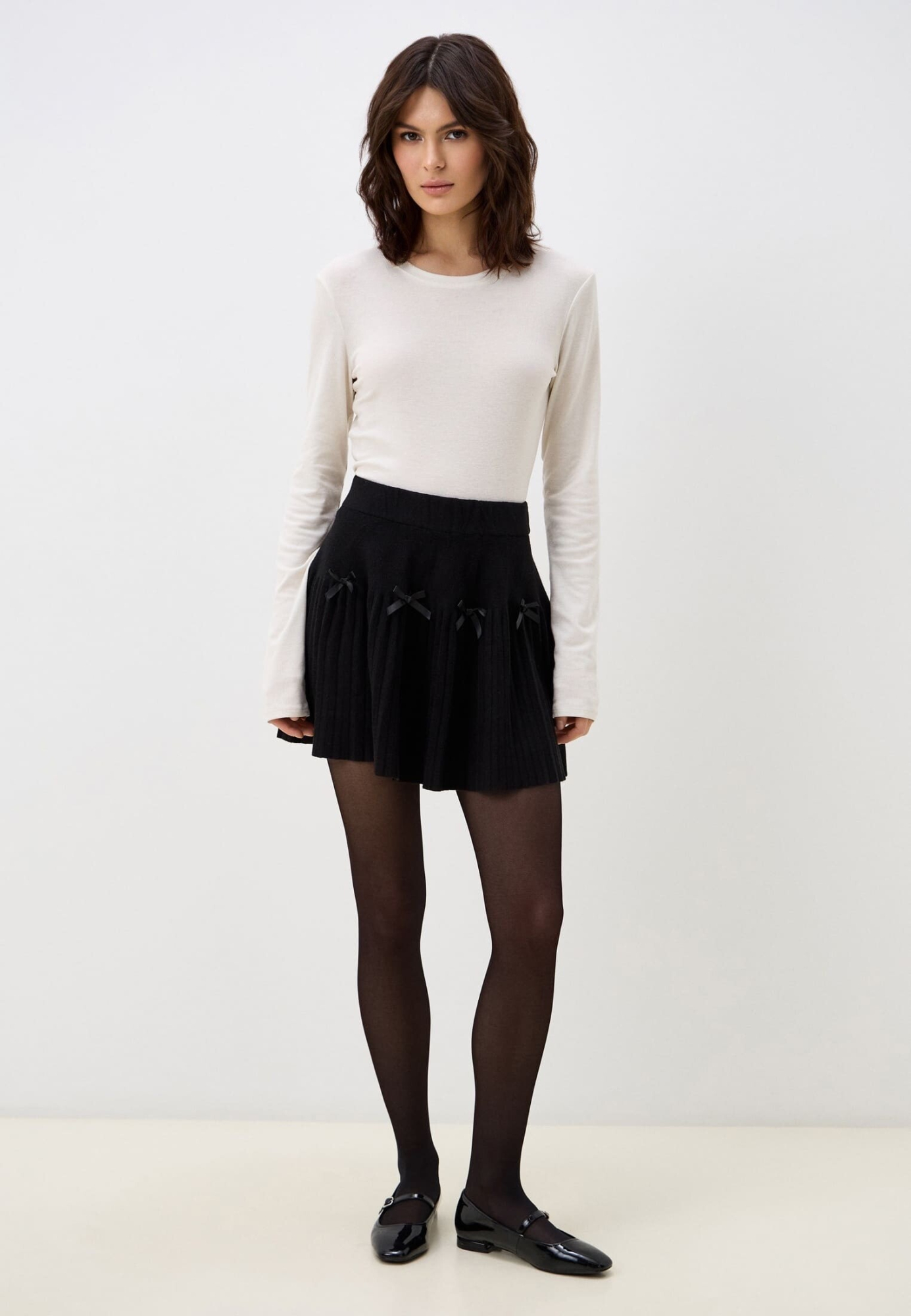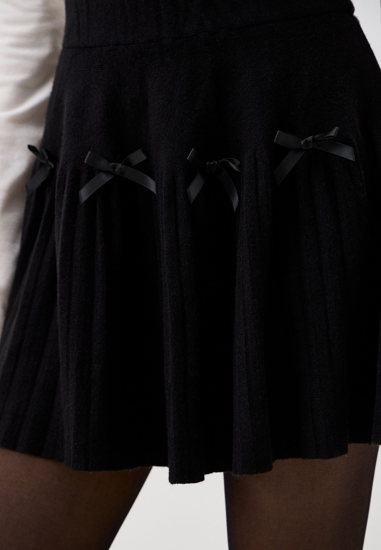 Чёрная плиссированная юбка с атласными бантиками — граница между элегантностью и naivе-chic. Короткая длина и текстурные акценты делают образ выразительным и запоминающимся.