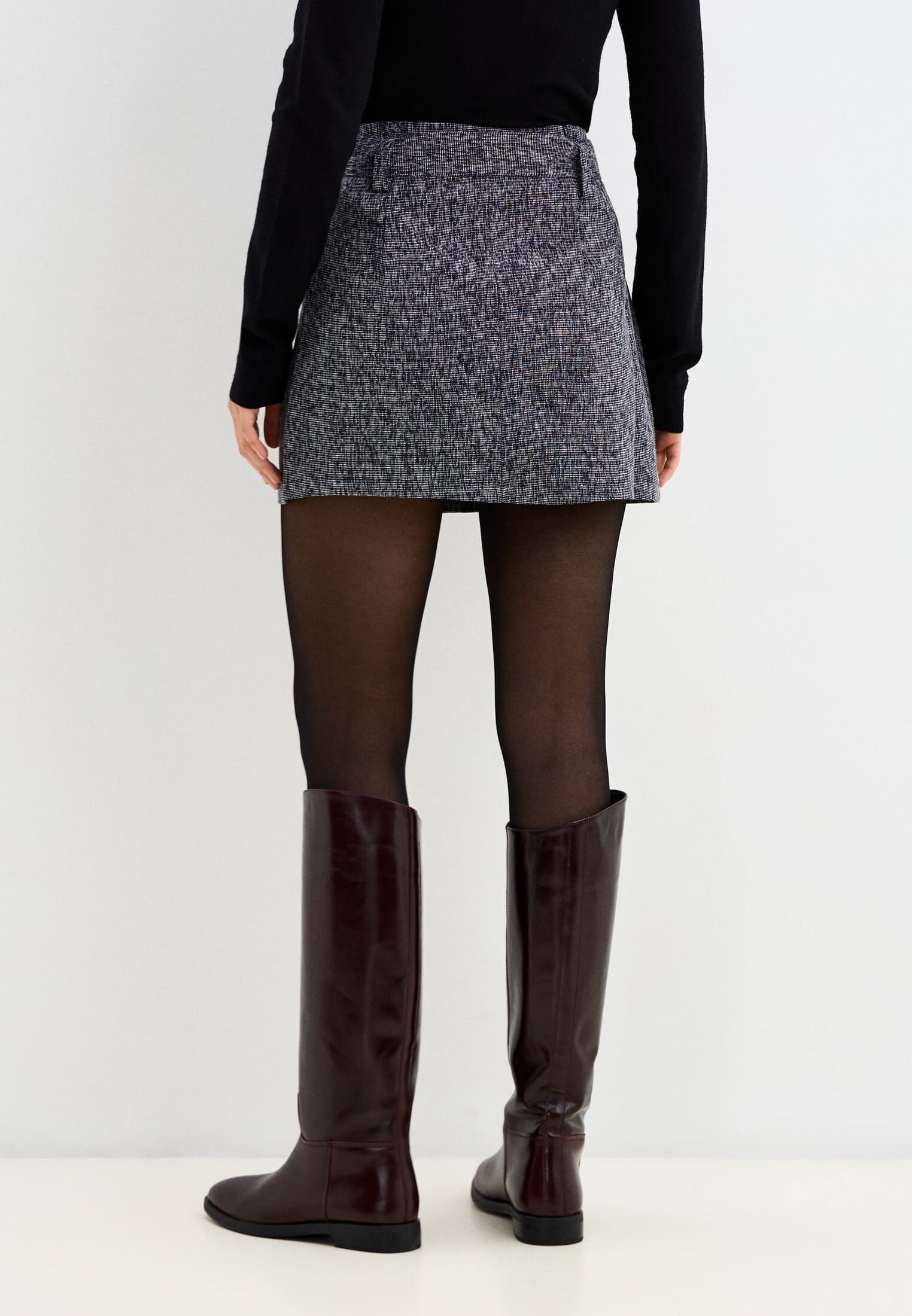 Высокая посадка и твидовая фактура формируют выразительный силуэт. Универсальная модель для осени и зимы.