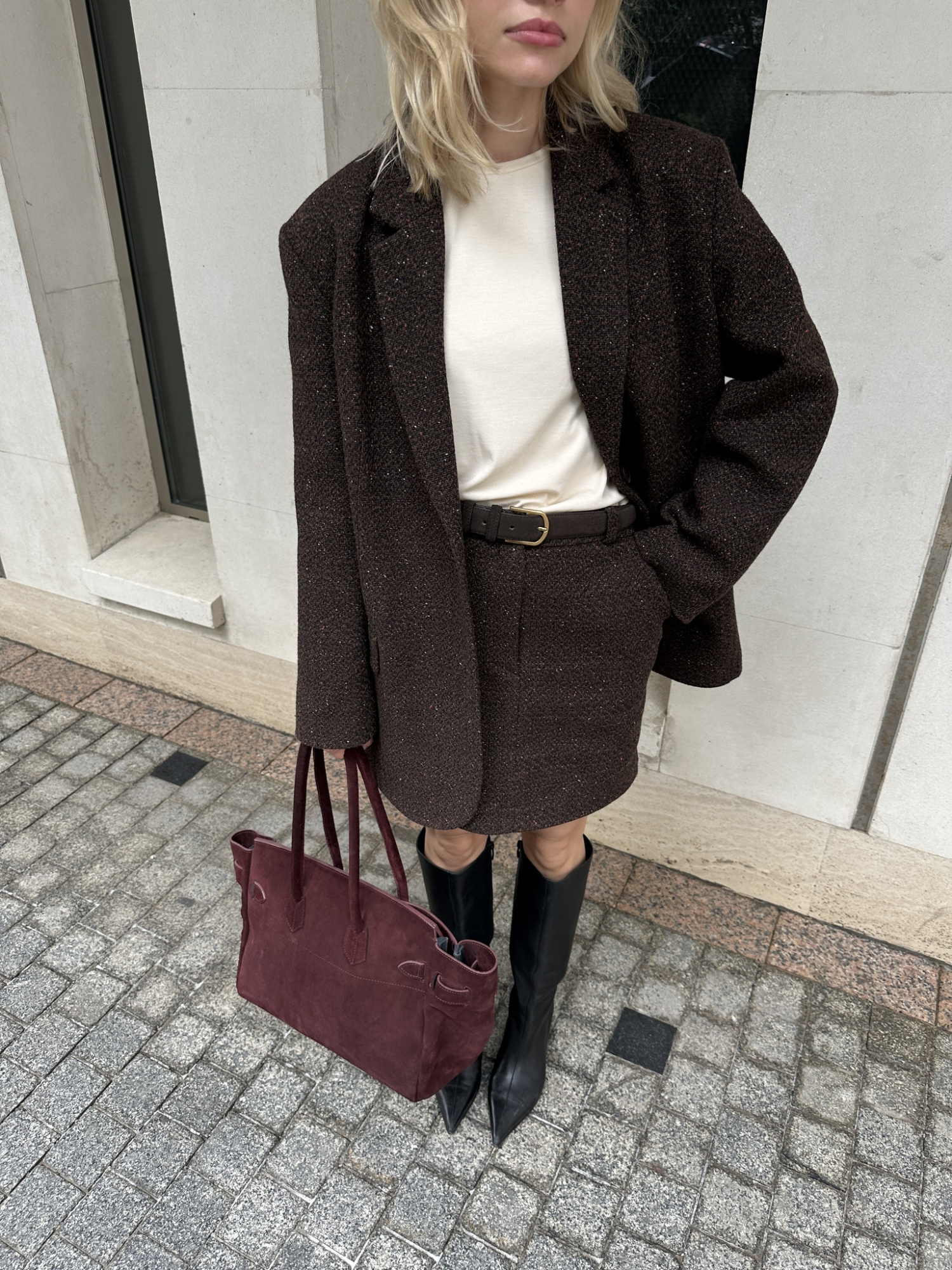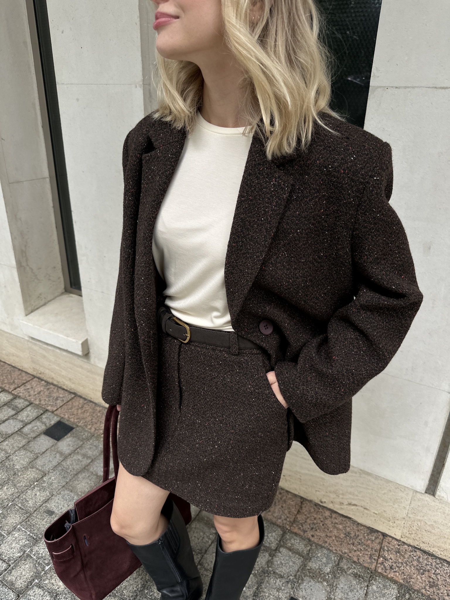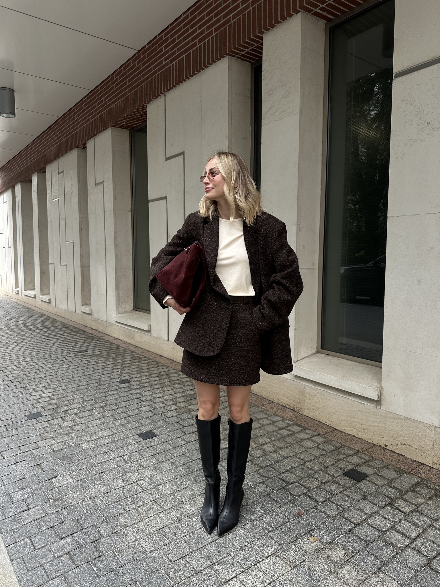 Рекомендуем сочетать с укороченным пальто из нашей коллекции в аналогичной ткани.