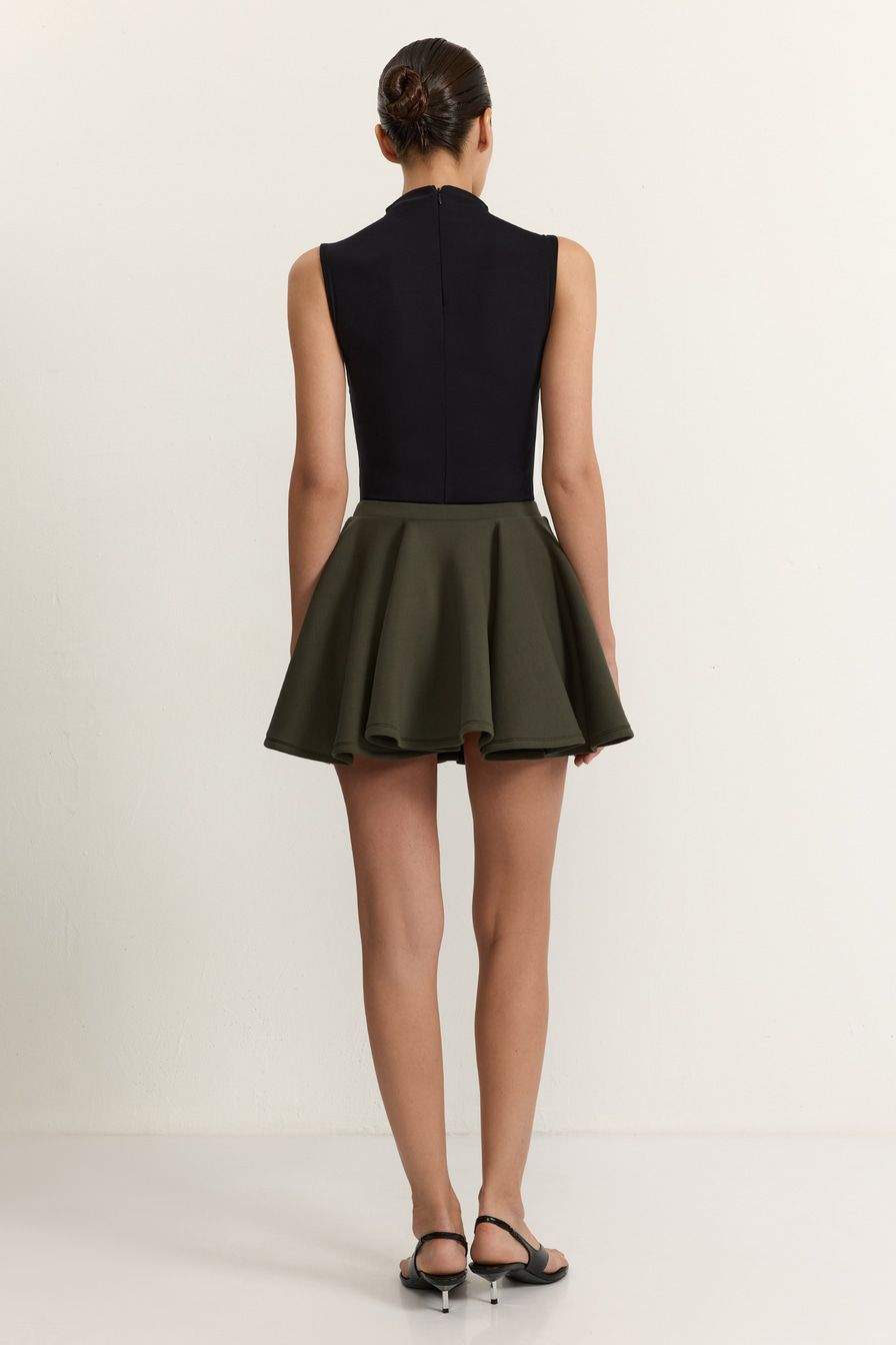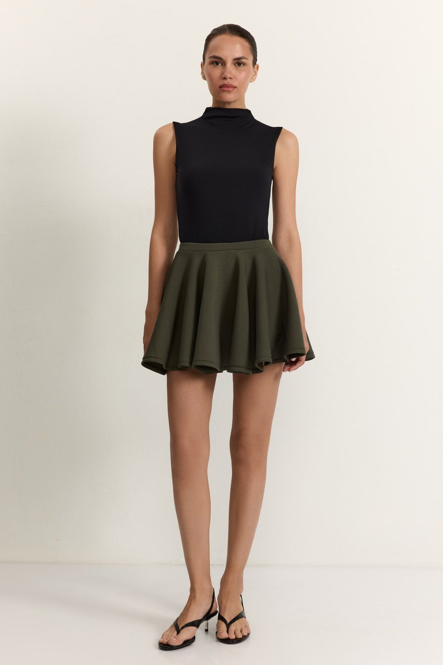 Трикотажная юбка-солнце с крупными складками выполнена из смесовой вискозы и декорирована вышивкой в виде логотипа бренда.