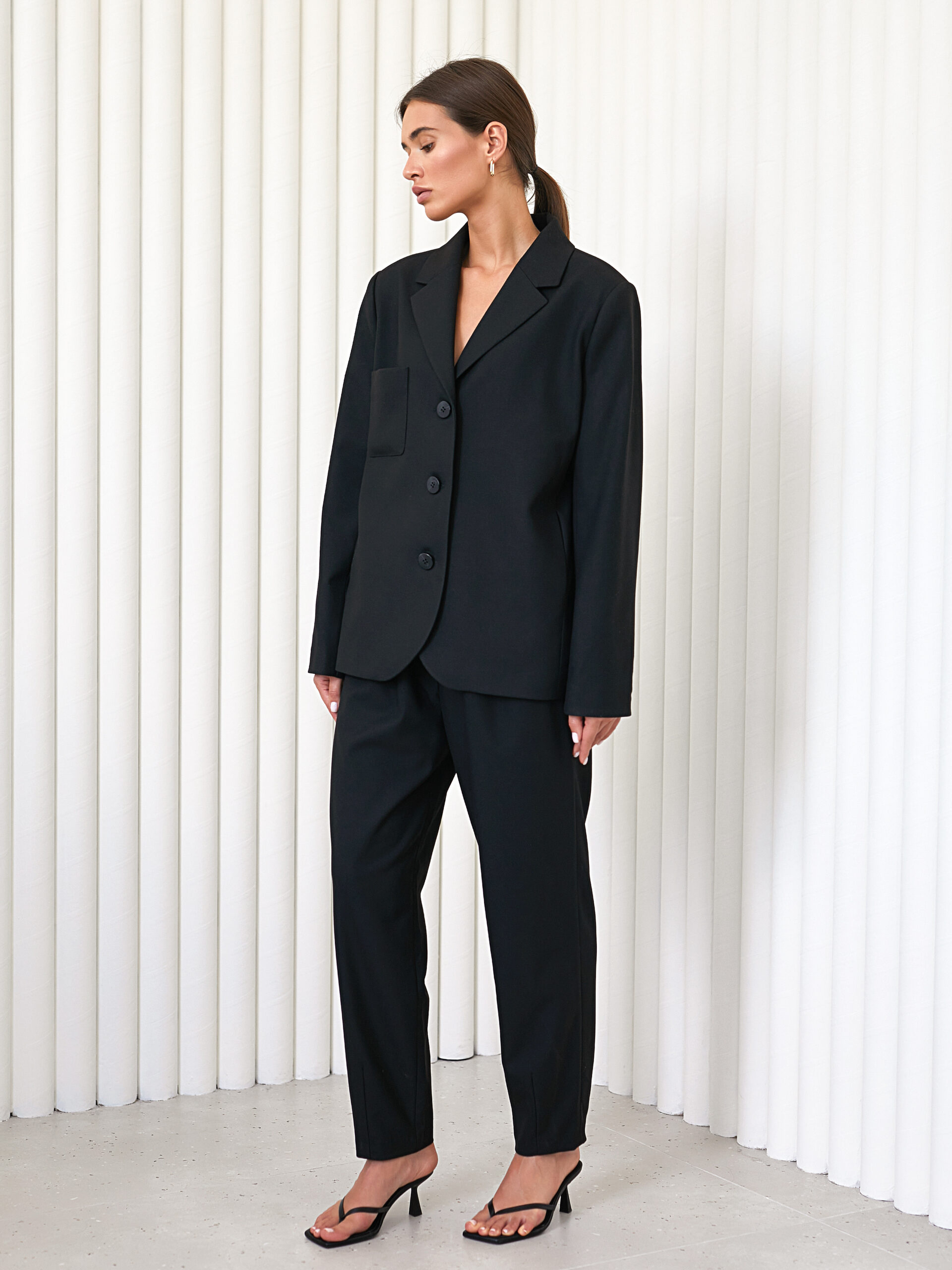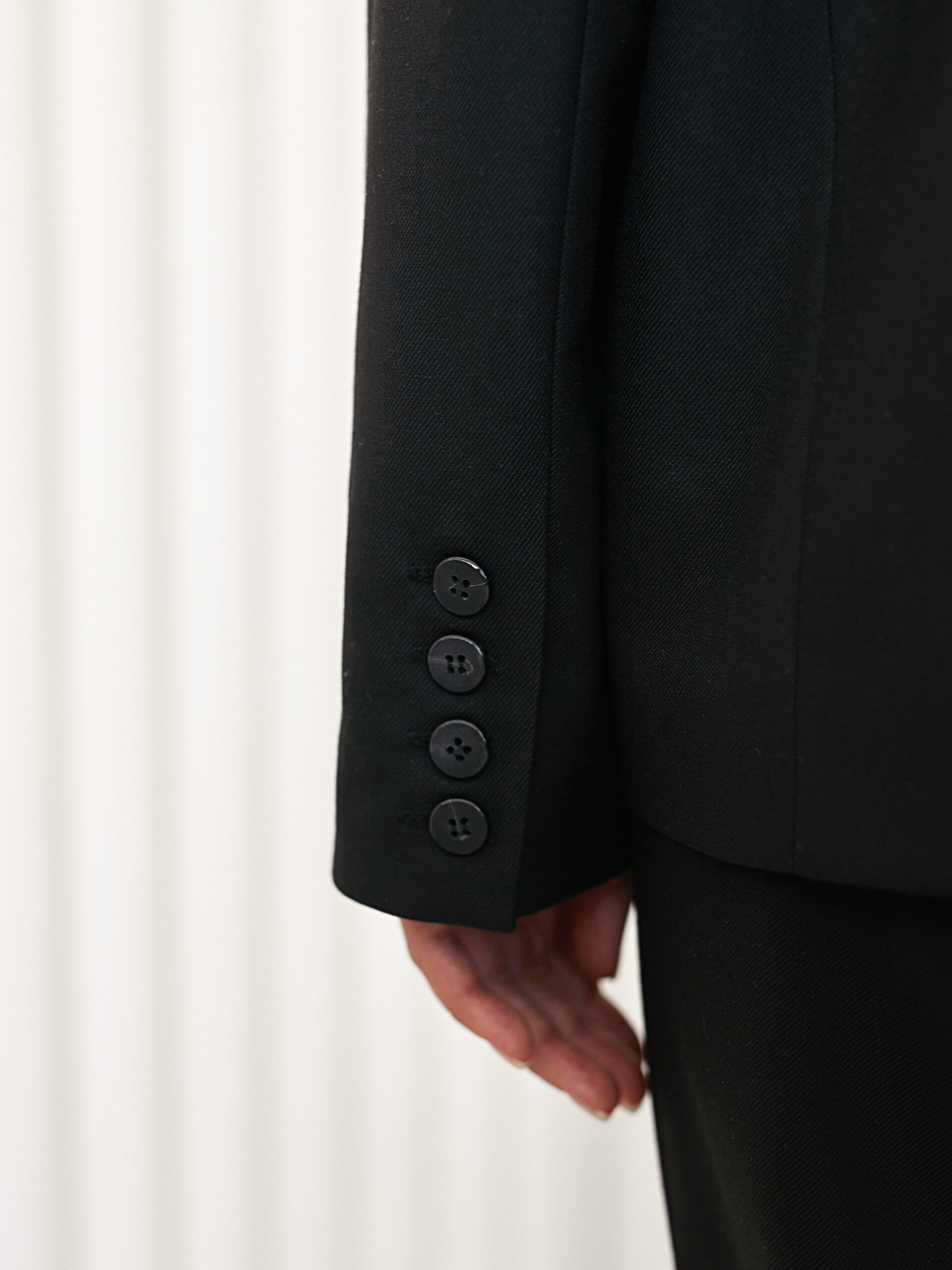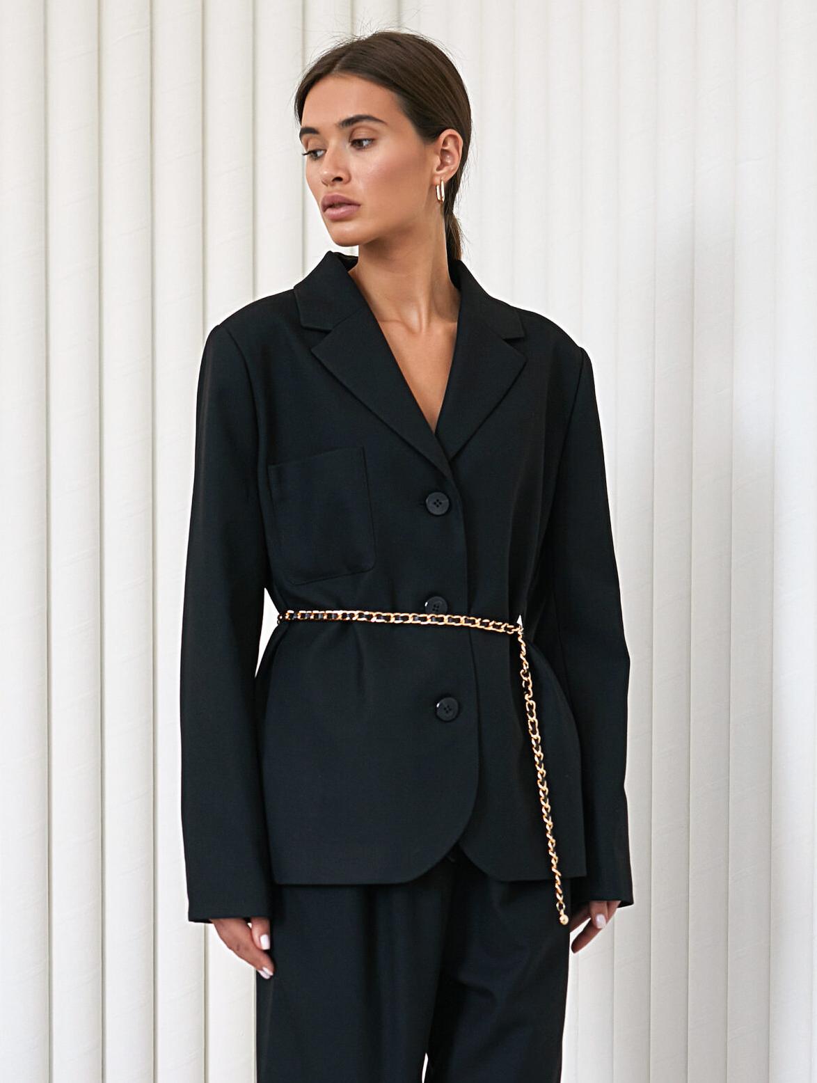 Жакет стилизован ремнём. Прямой объемный силуэт, однобортный на двух пуговицах, на спине и на рукавах шлица, втачной рукав.