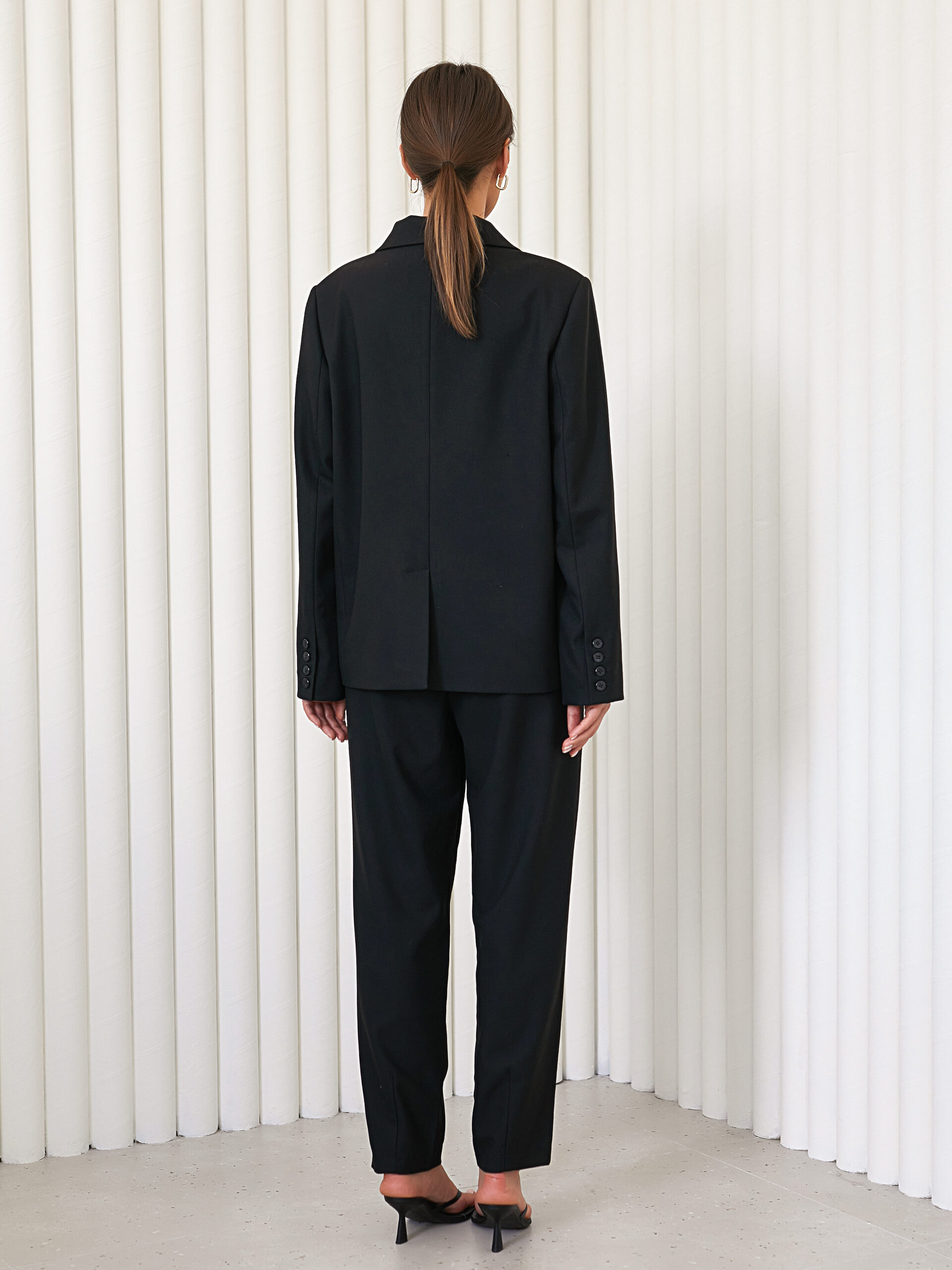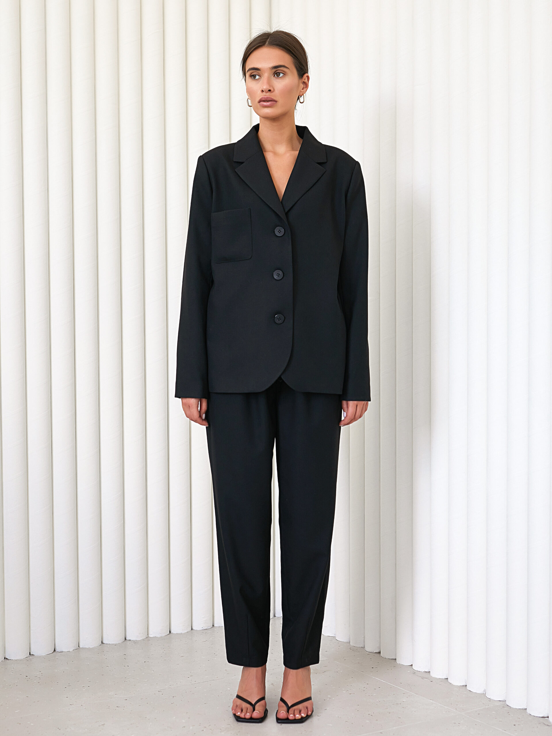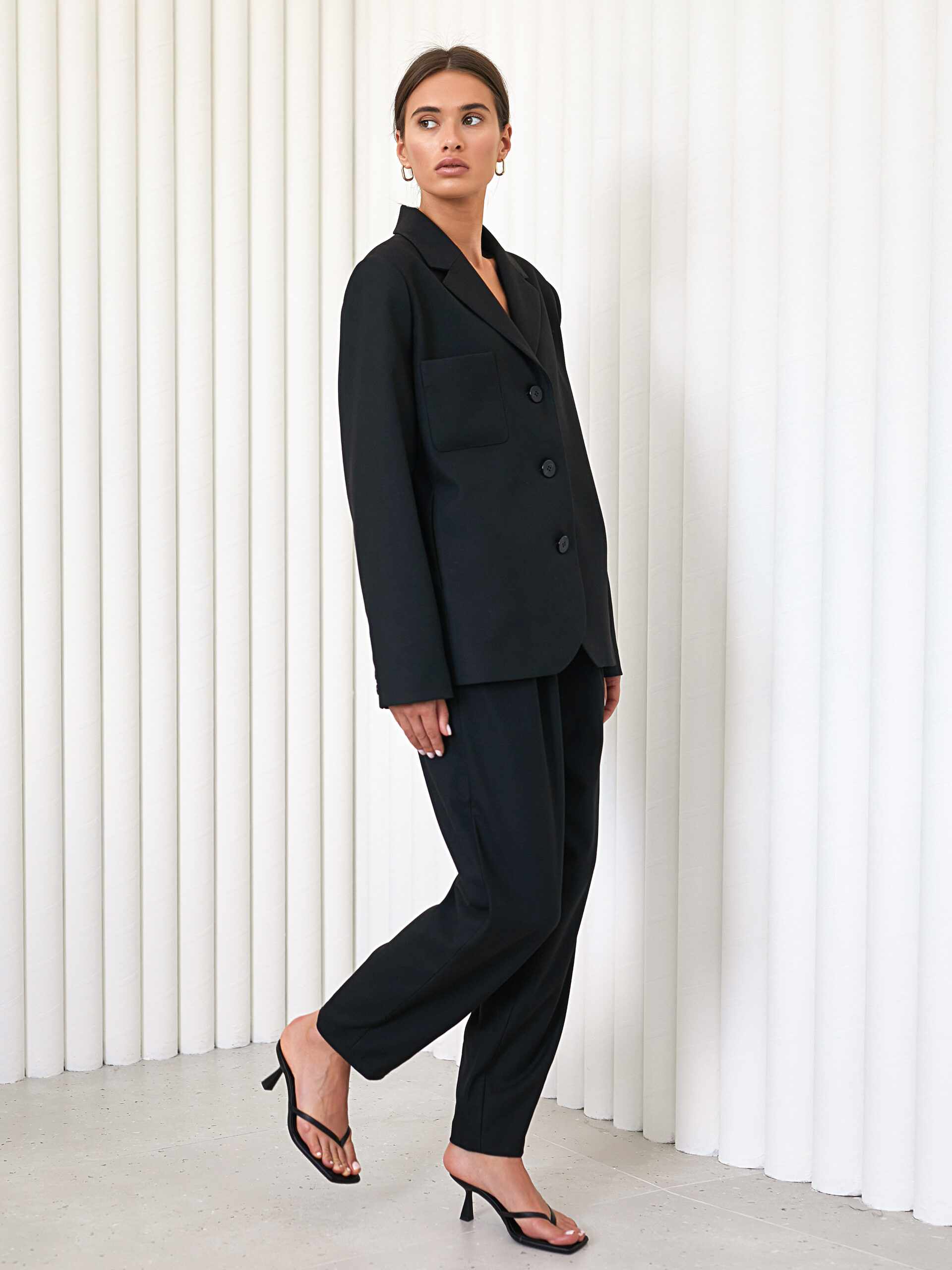 Жакет стилизован ремнём. Прямой объемный силуэт, однобортный на двух пуговицах, на спине и на рукавах шлица, втачной рукав.