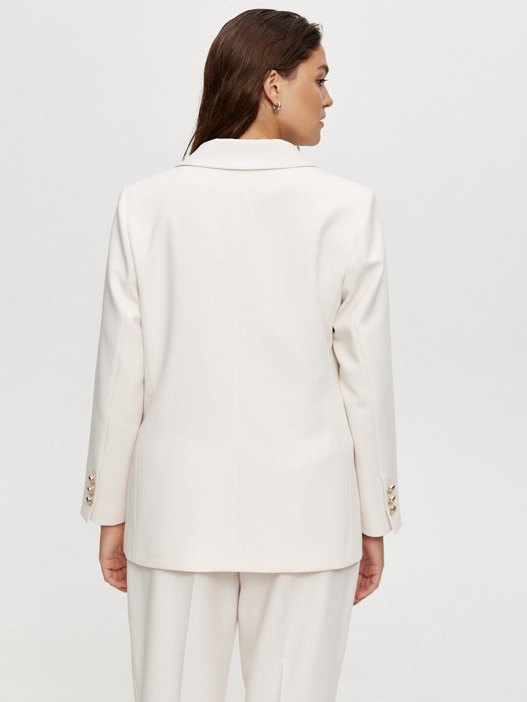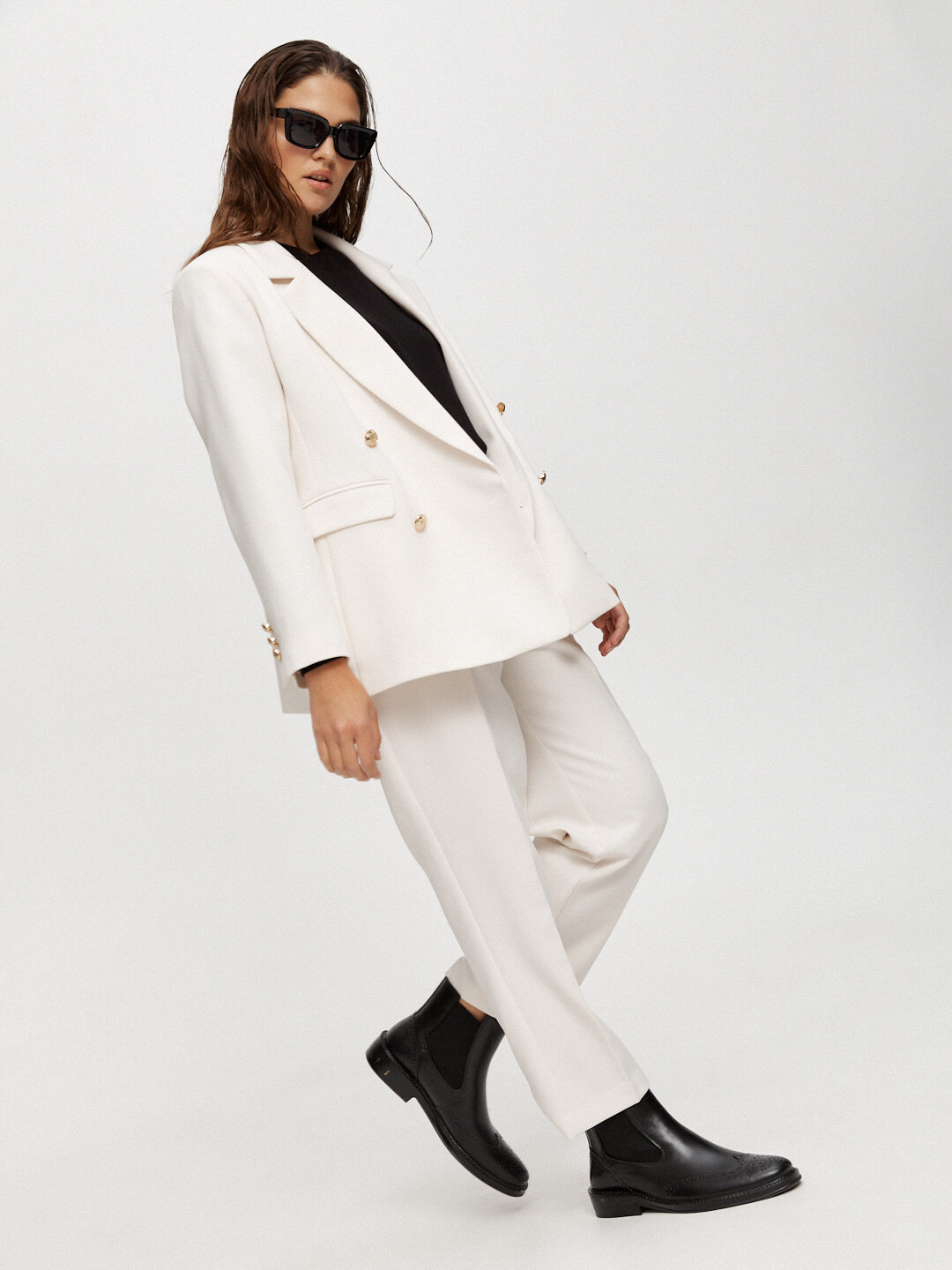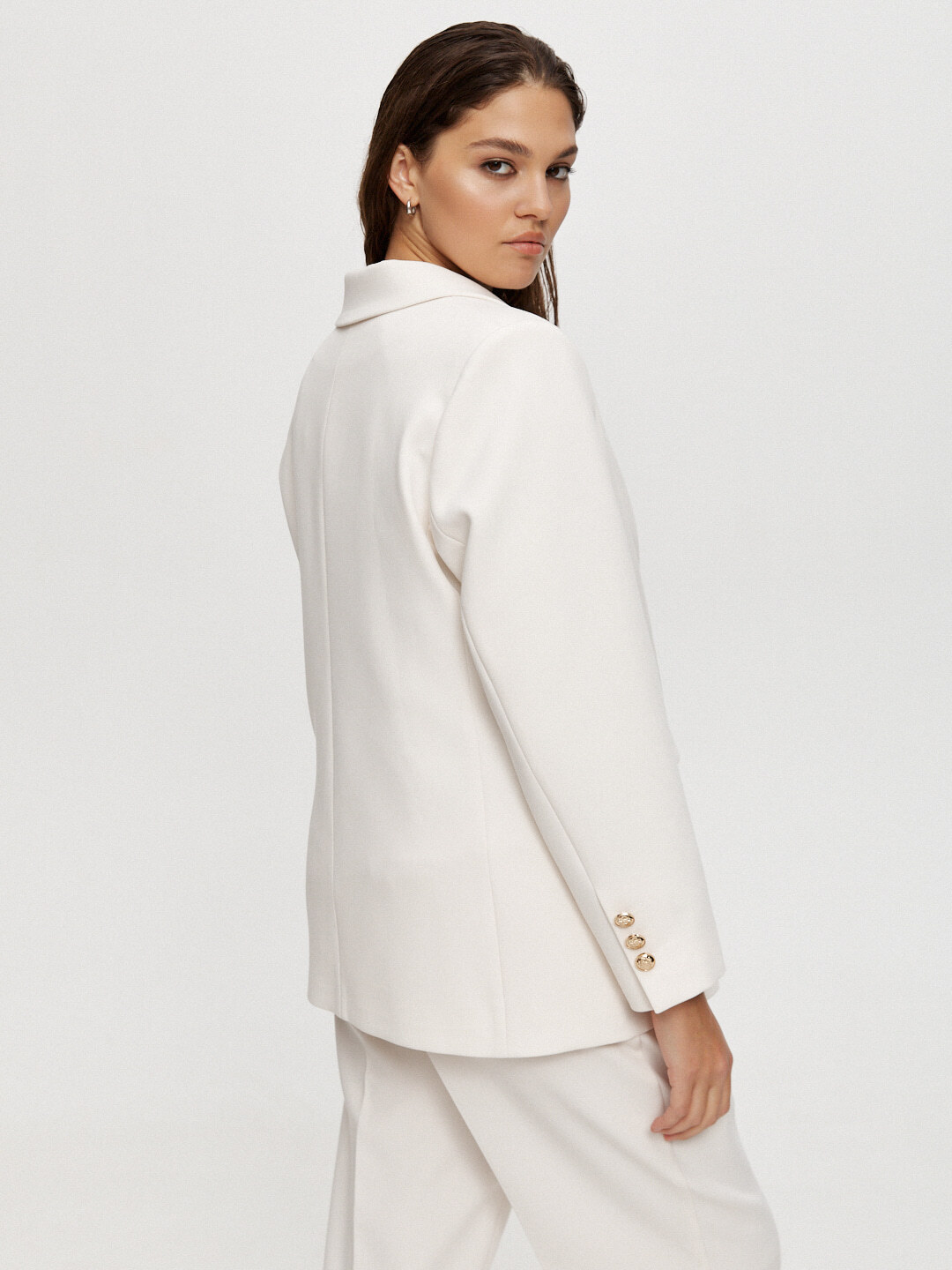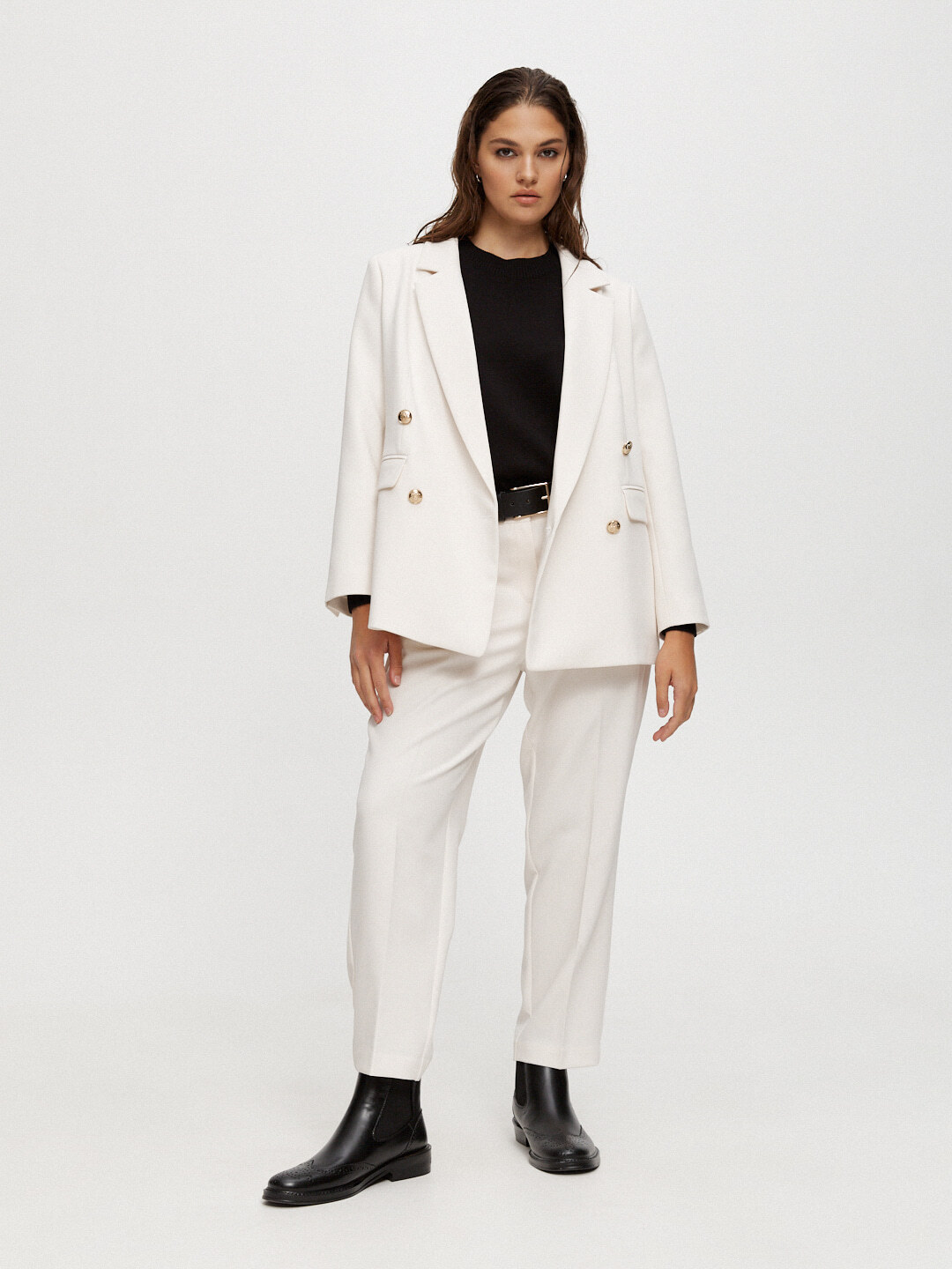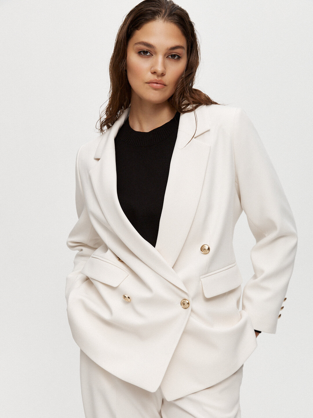 Прямой укороченный двубортный жакет — нестареющая классика, одна из самых универсальных моделей. Правильной длины и конструктива, держит форму. Жакет дополнен аккуратными подплечниками, чтобы он отлично садился на любые типы фигур.