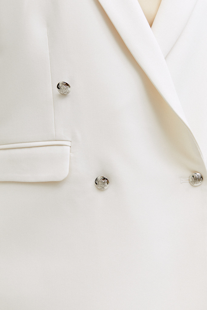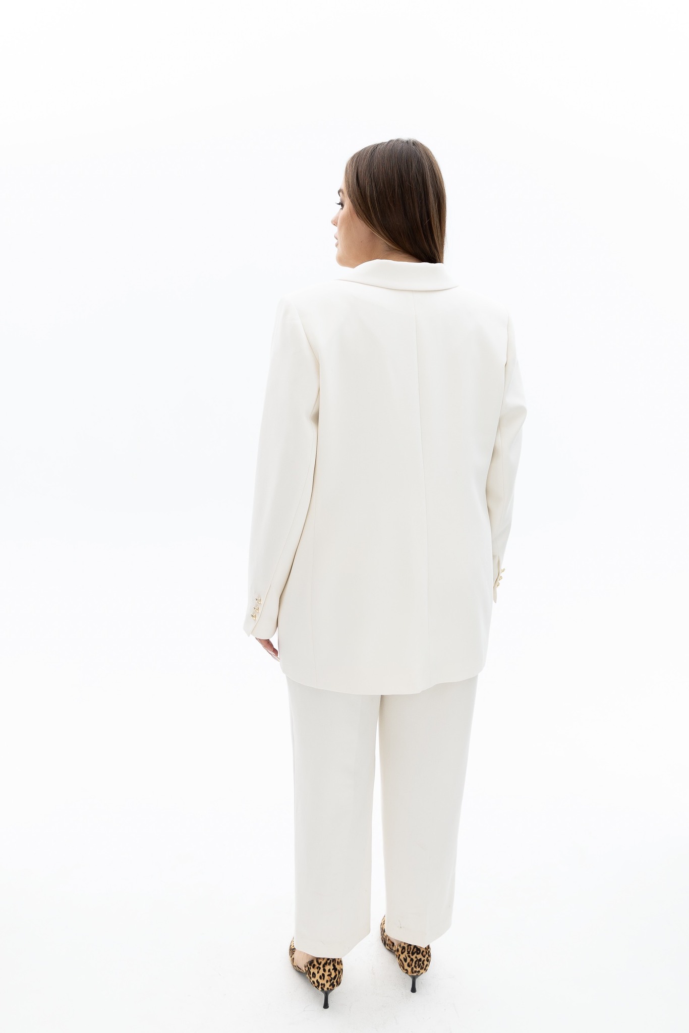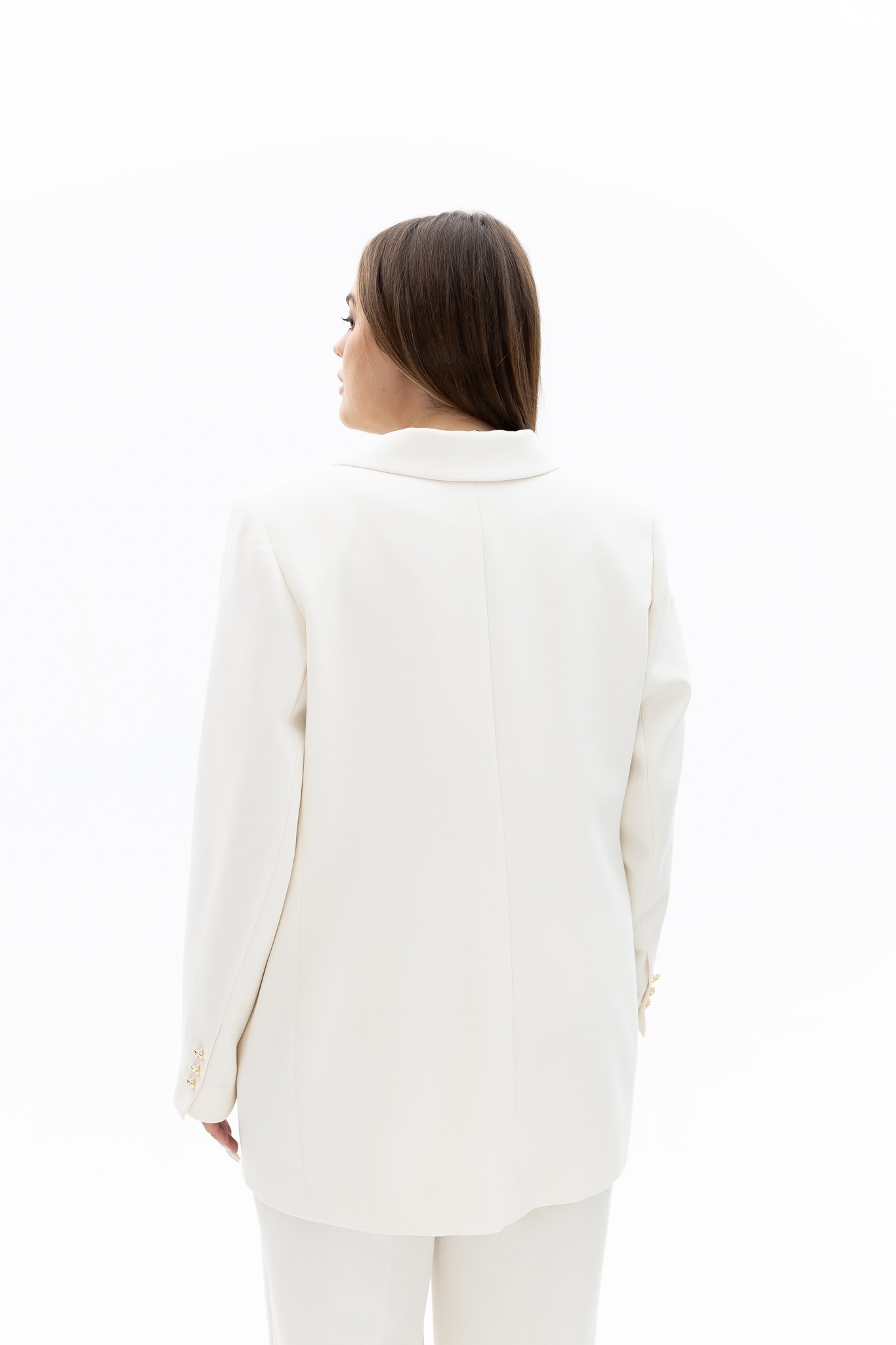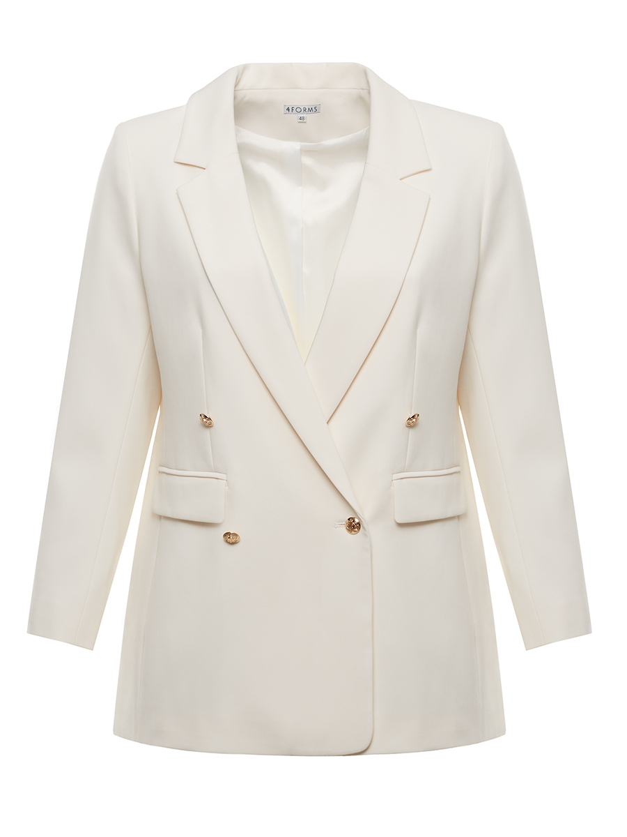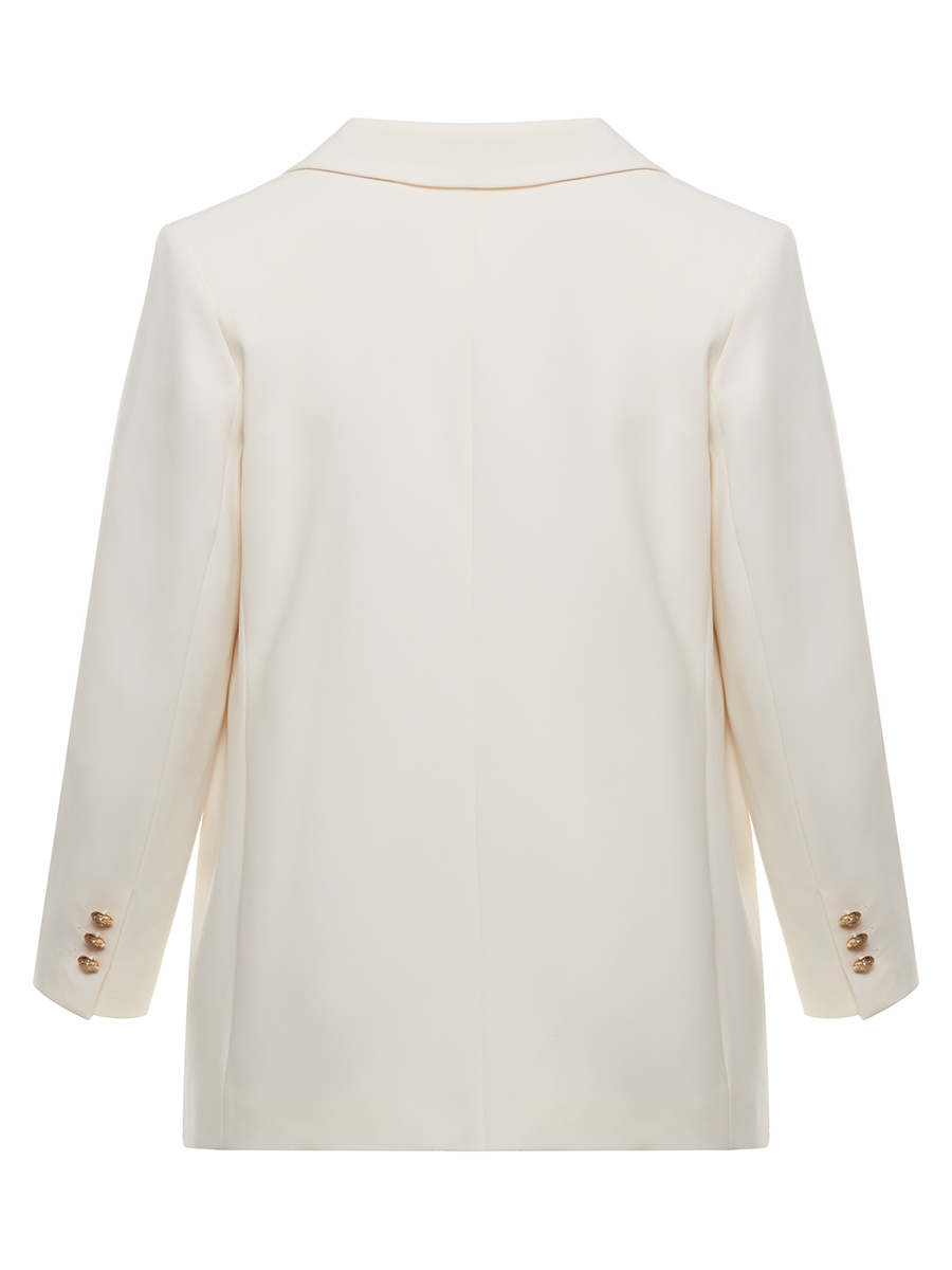 Жакет двубортный молочного цвета. Универсальный фасон подходит всем типам фигур и отлично сочетается с брюками, платьями, джинсами и юбками. Жакет правильной длины и конструктива, держит форму.