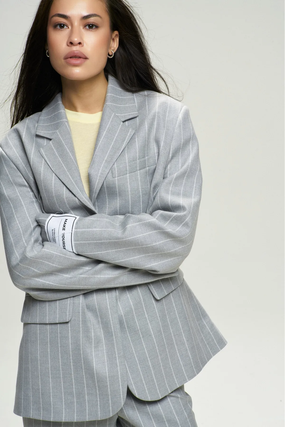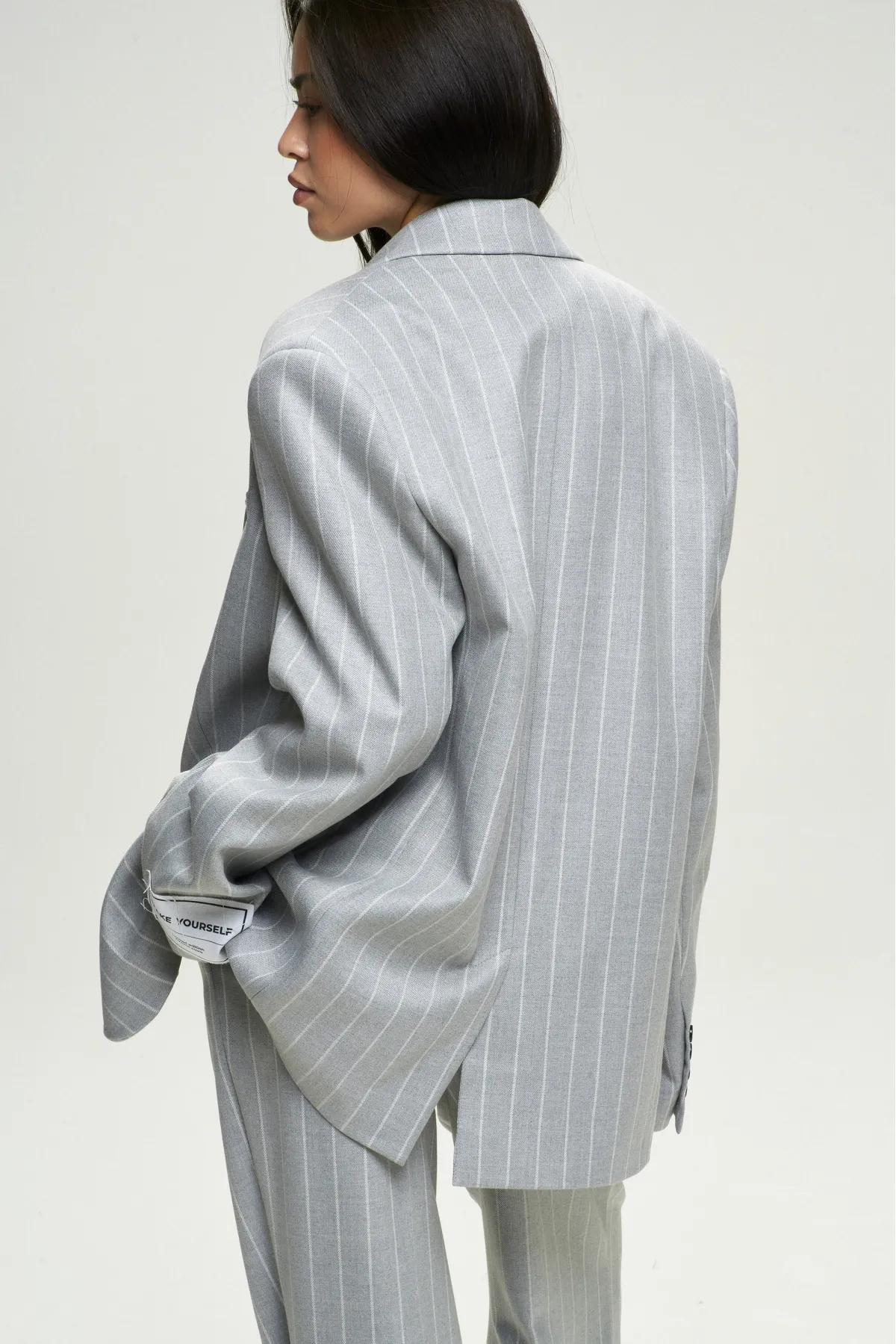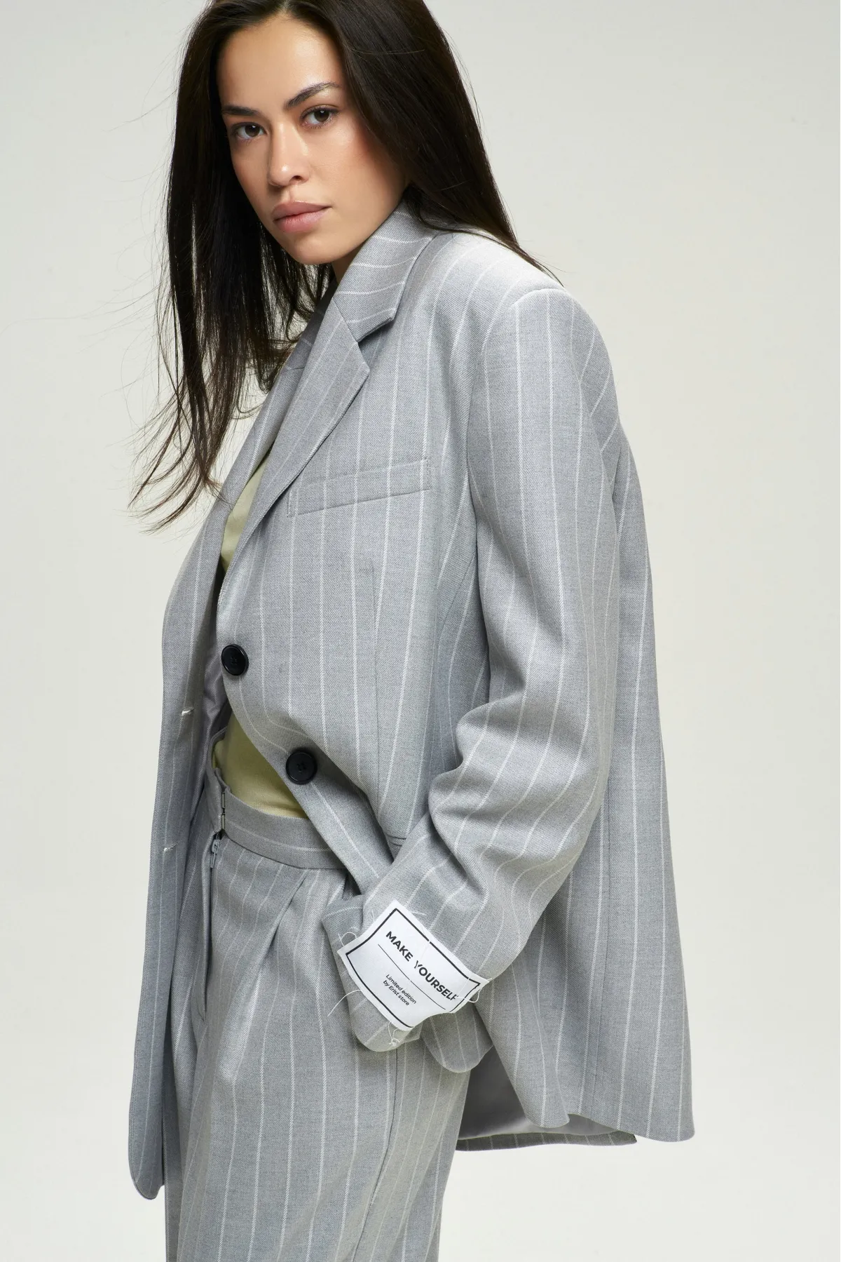 Жакет Basic в полоску создан для тех, кто ценит свободу движений и лаконичный стиль: свободный оверсайз-силуэт с отложным воротником и чёткой линией плеч выглядит современно и при этом сохраняет классические пропорции.