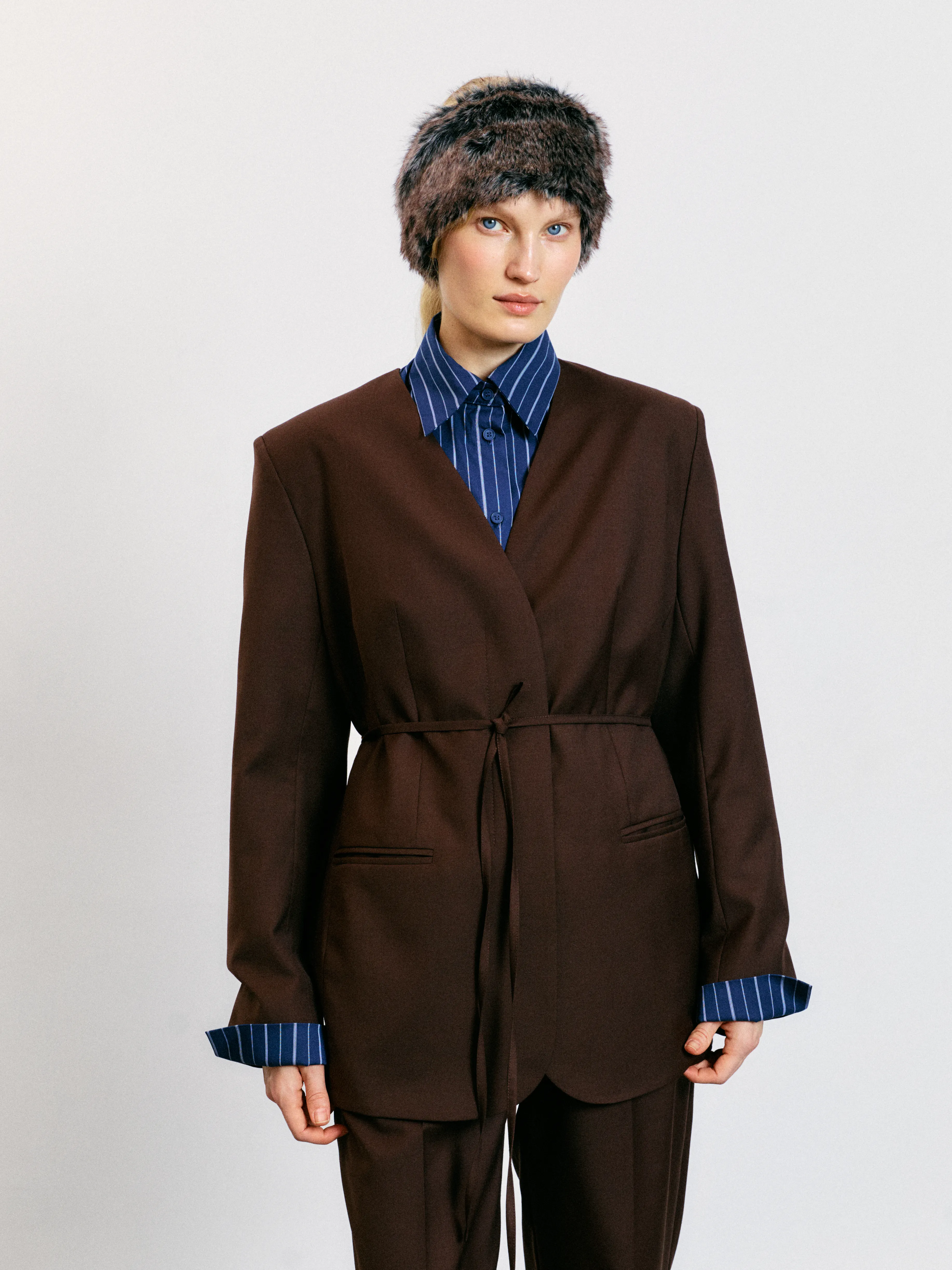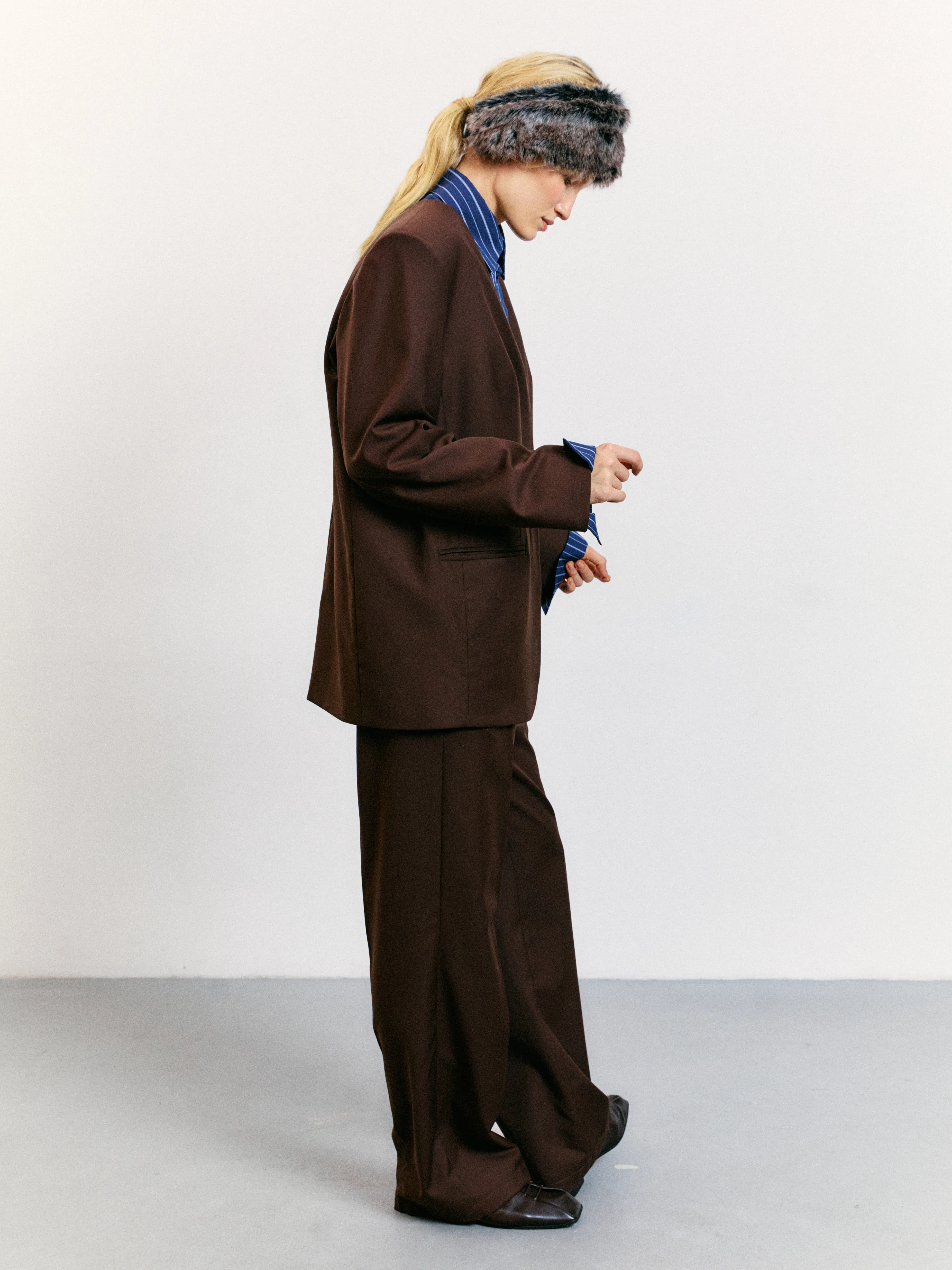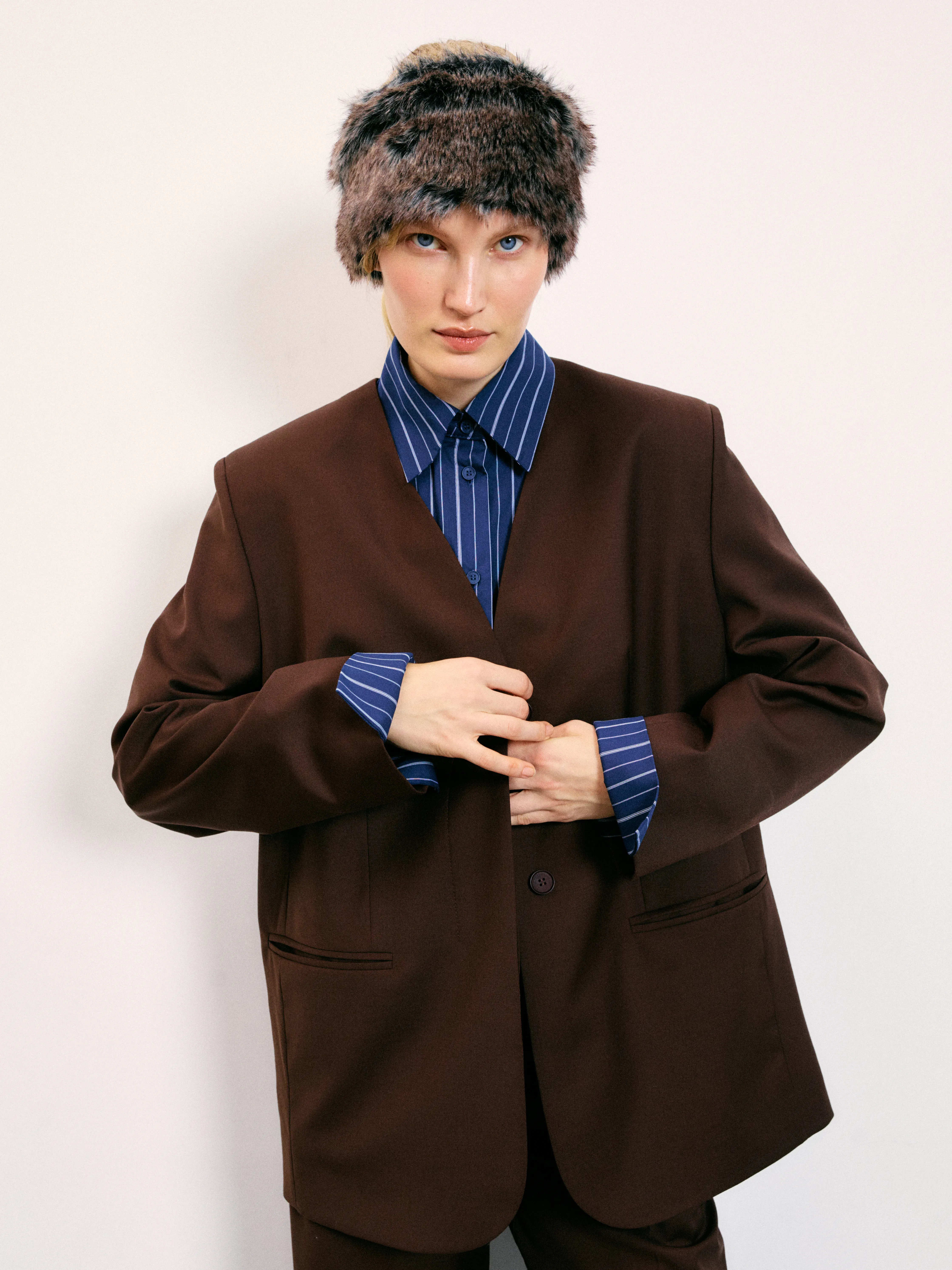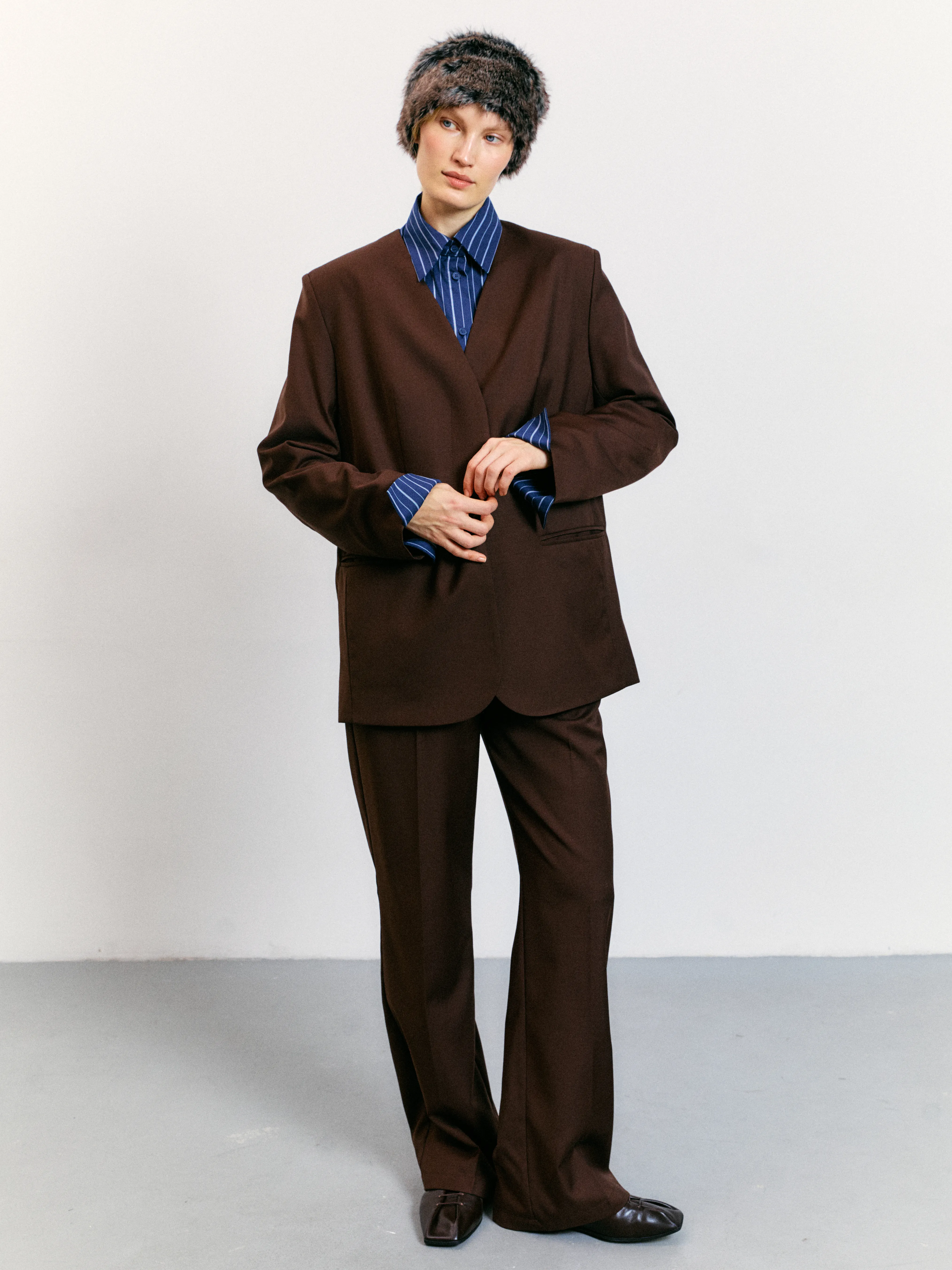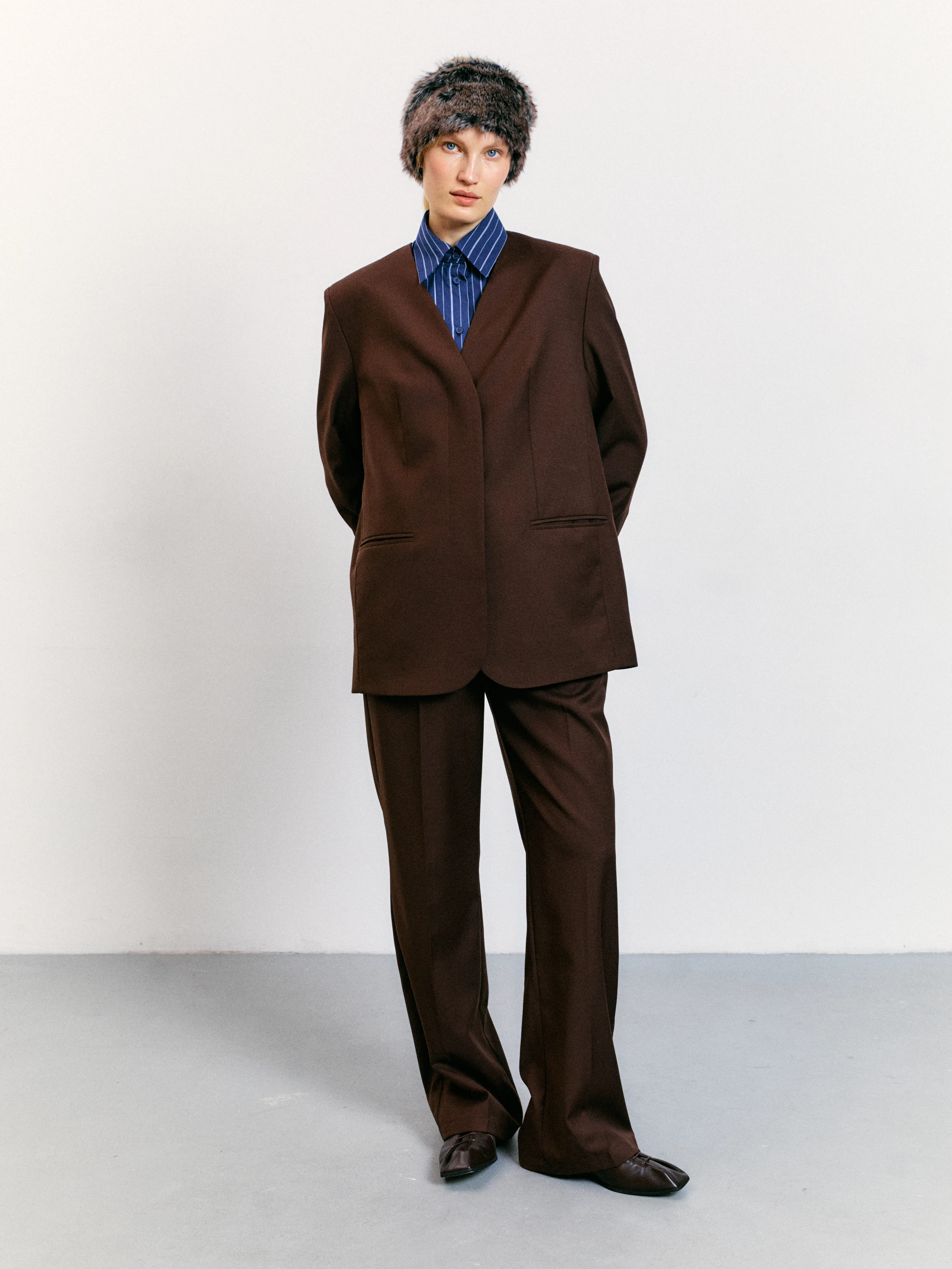 Объемный жакет без лацканов. В комплекте с брюками создаем классический костюм.