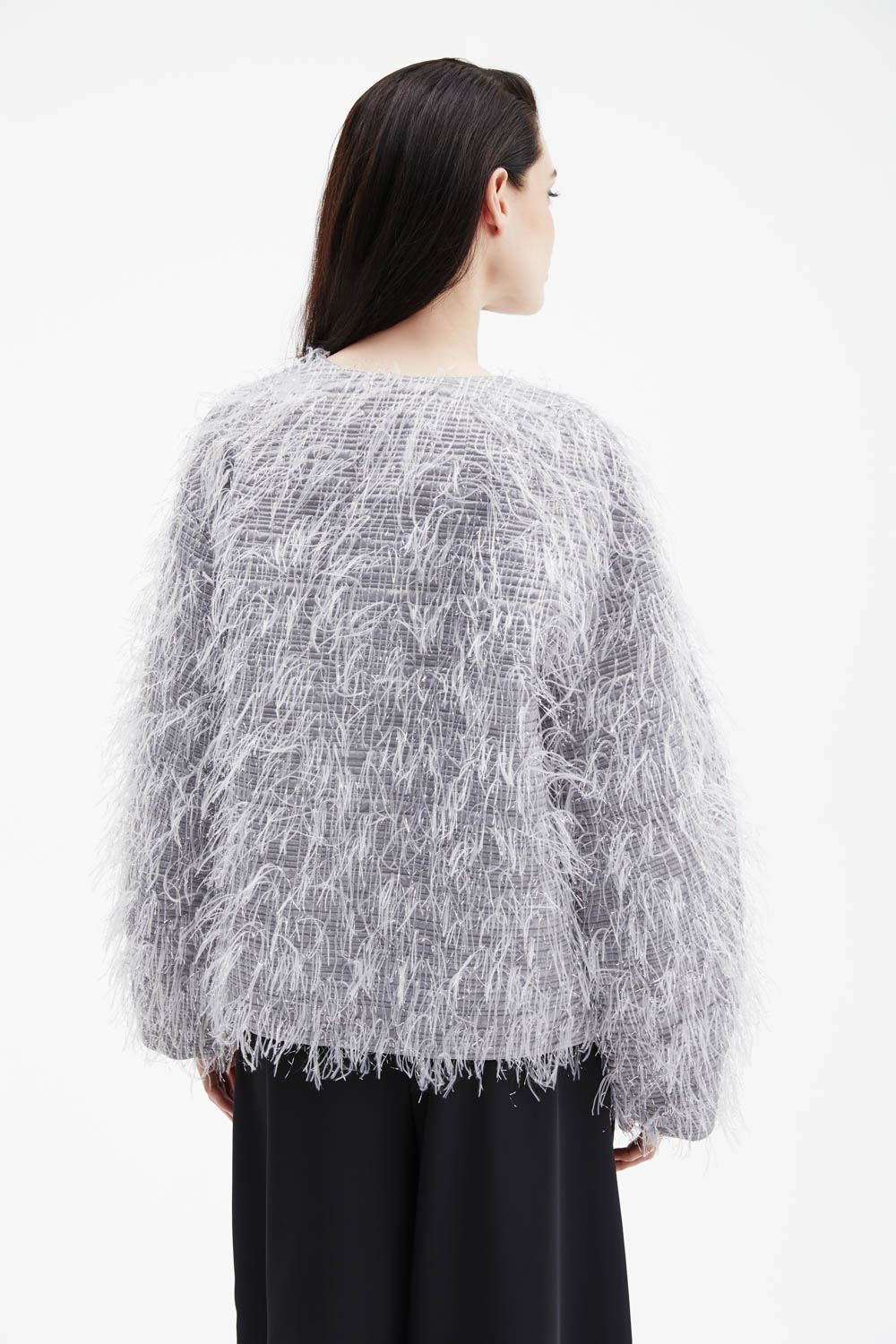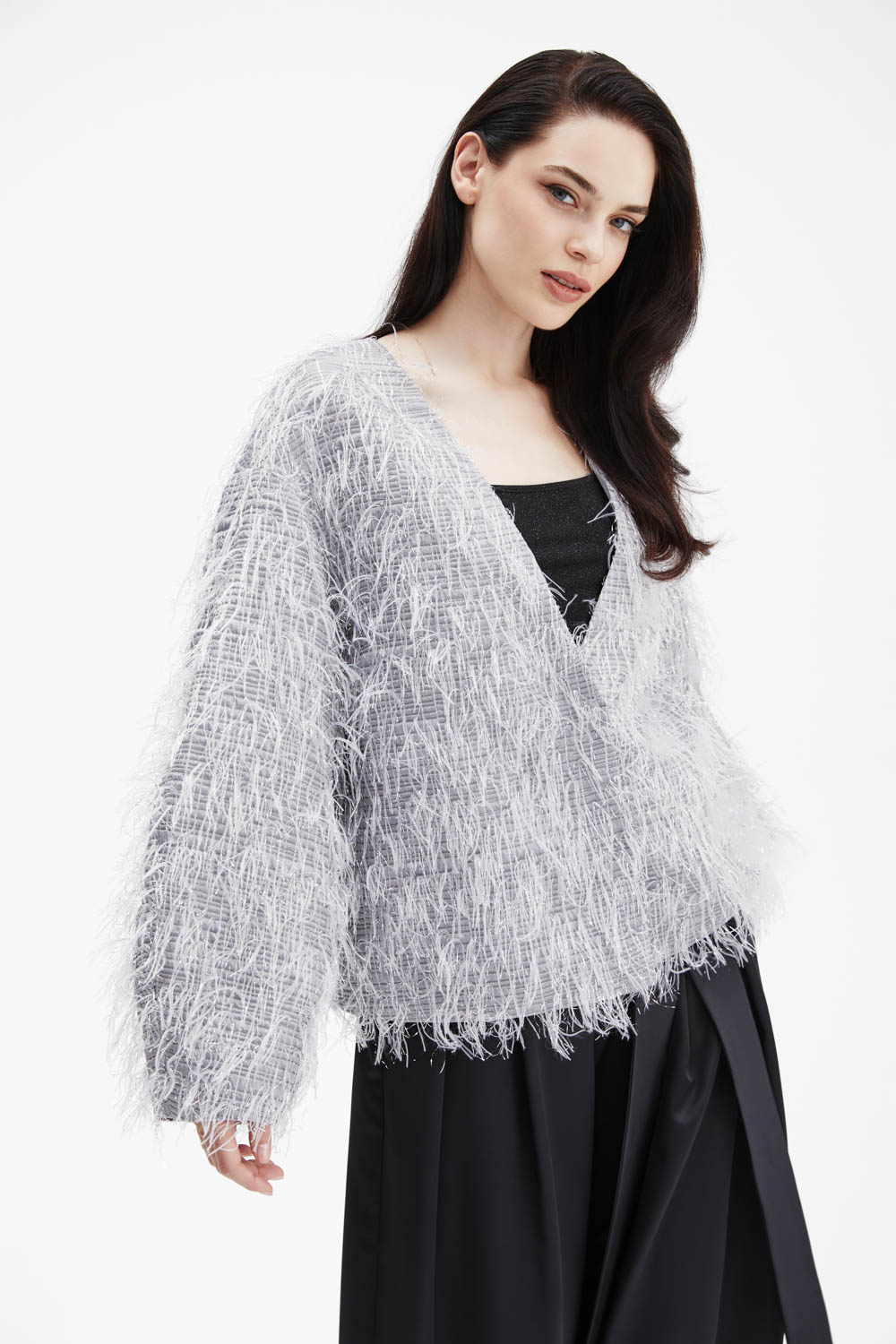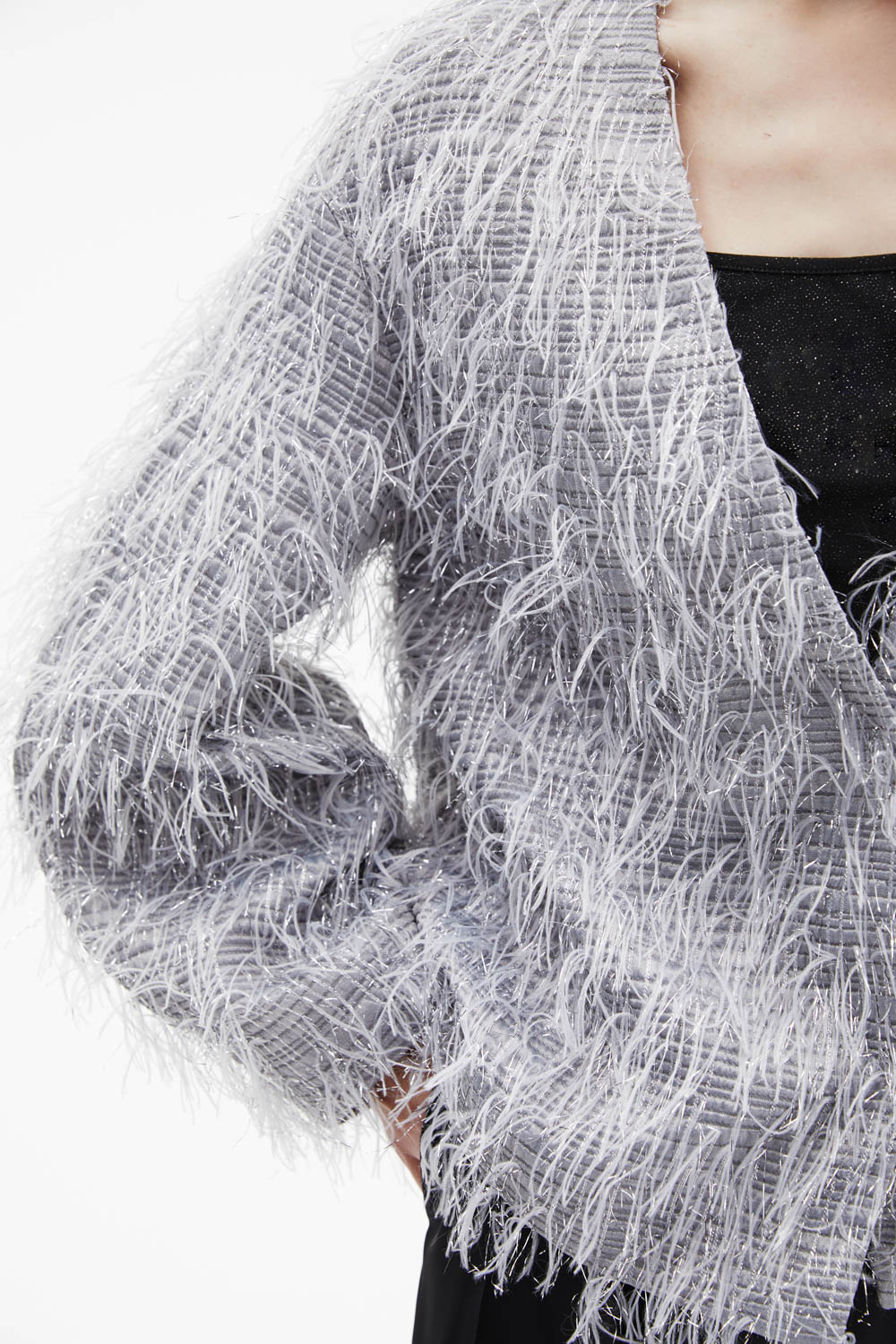 Пушистый жакет серого оттенка с эффектом перьев — нежный, объёмный и невероятно уютный. Лёгкая текстура и свободный крой создают атмосферу роскошного комфорта, а V-образный вырез идеально сочетается с базовыми топами. Идеально подходит для вечерних выходов или романтичных образов — придаёт образу мягкость и шик.