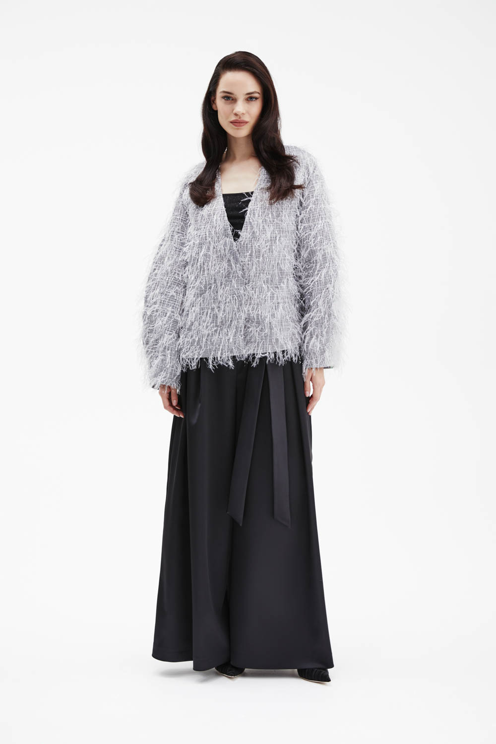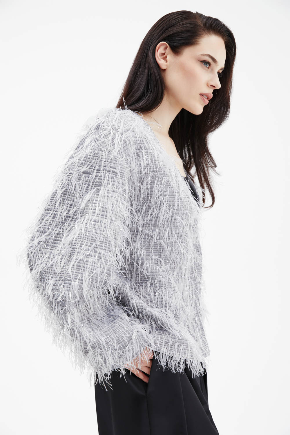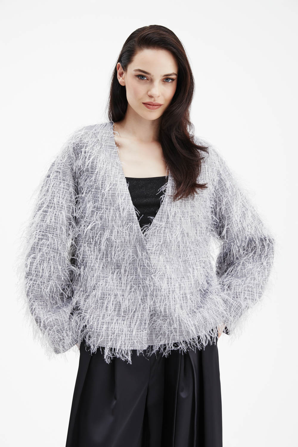 Пушистый жакет серого оттенка с эффектом перьев — нежный, объёмный и невероятно уютный. Лёгкая текстура и свободный крой создают атмосферу роскошного комфорта, а V-образный вырез идеально сочетается с базовыми топами. Идеально подходит для вечерних выходов или романтичных образов — придаёт образу мягкость и шик.