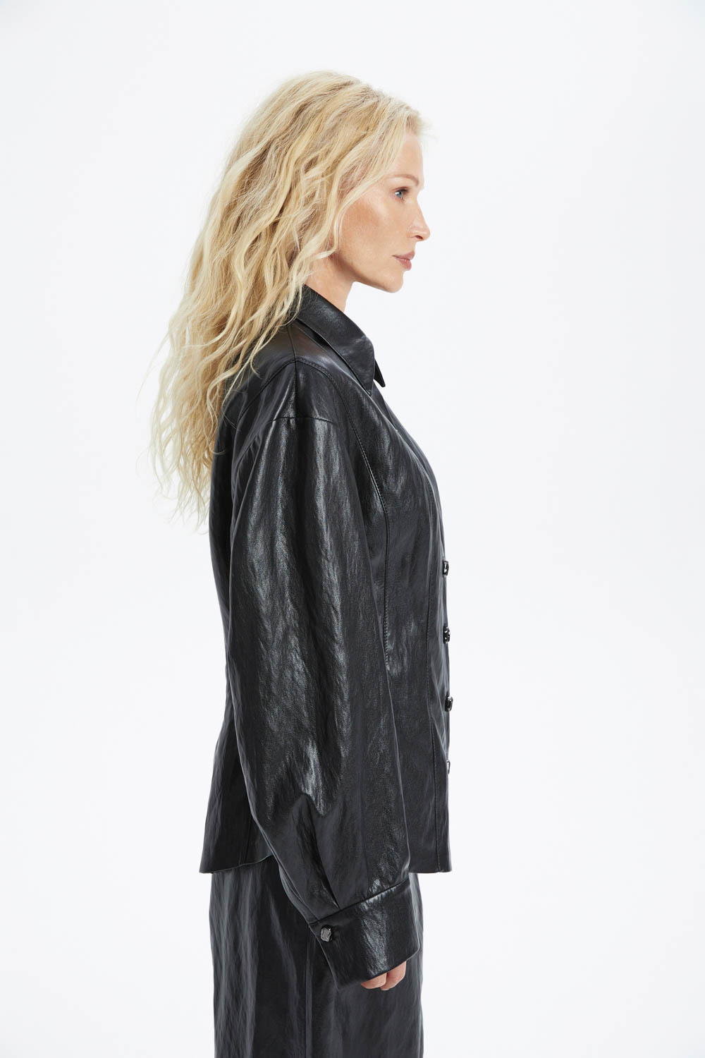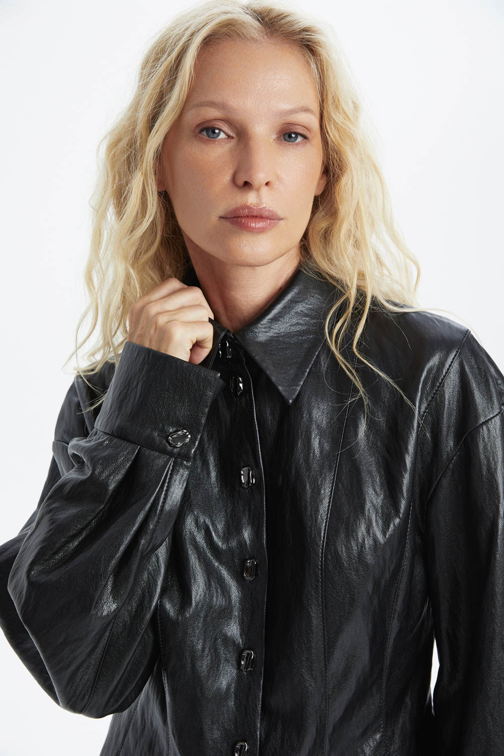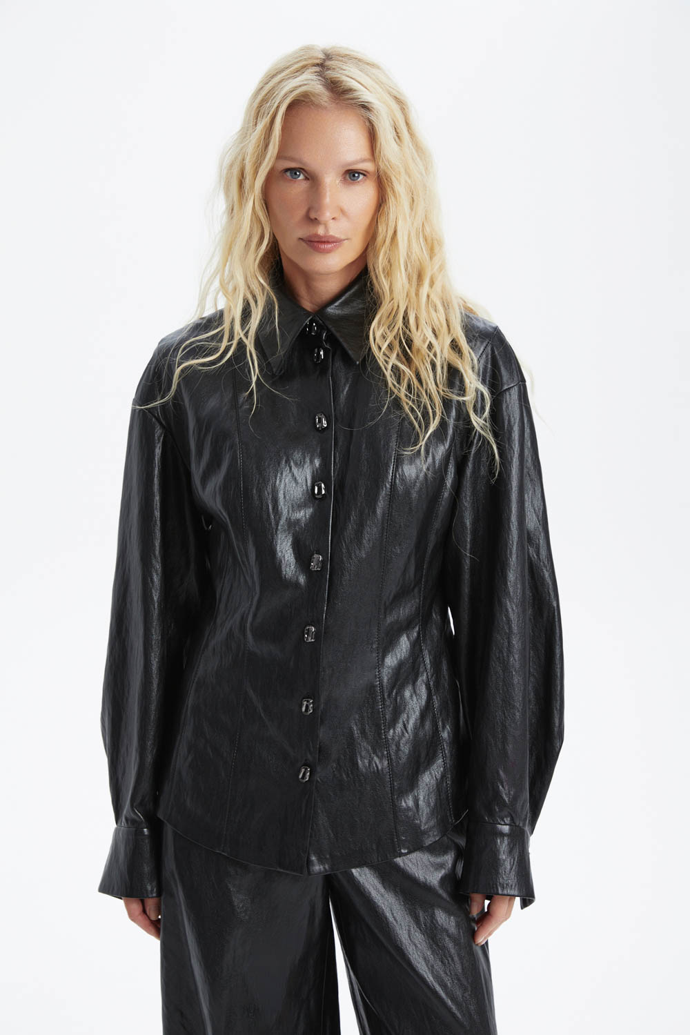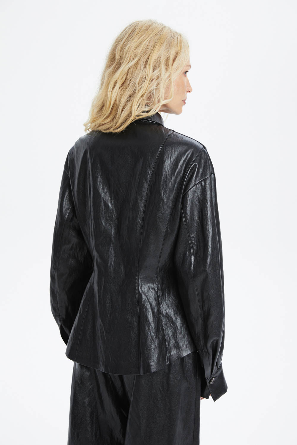 Чёрный кожаный жакет — стильный элемент гардероба, который станет основой для создания множества модных образов. Прекрасно сочетается с кожаными брюками, добавляя образу дерзости и элегантности.