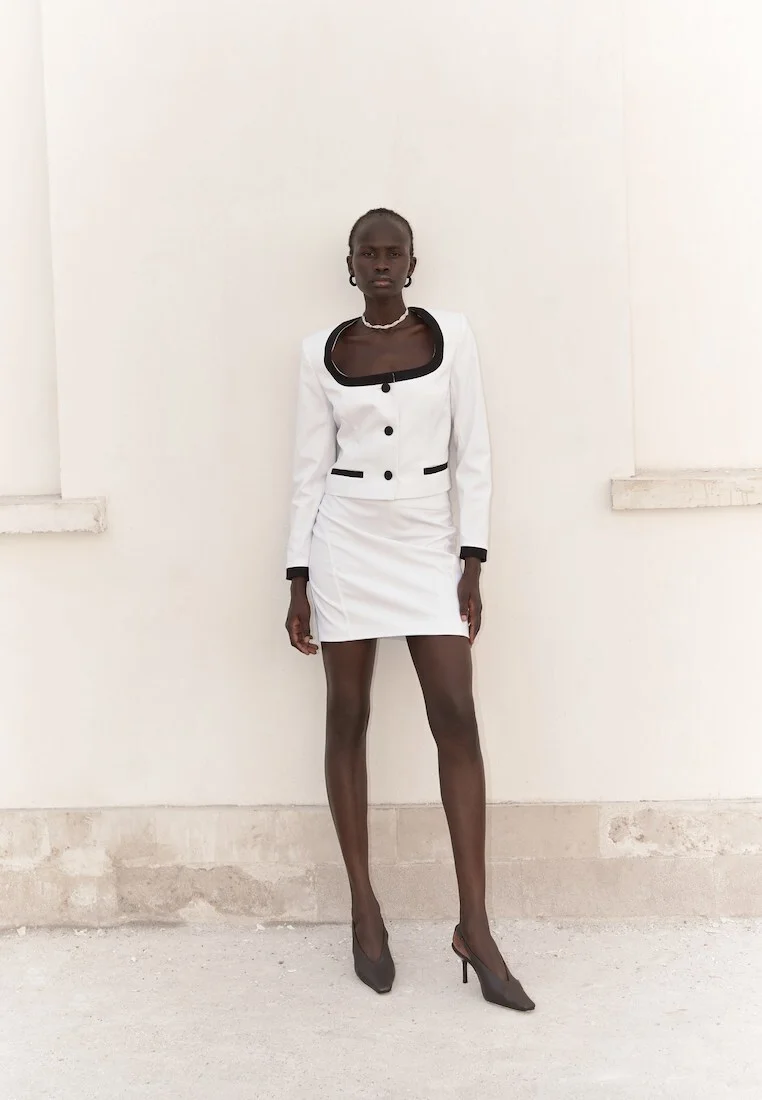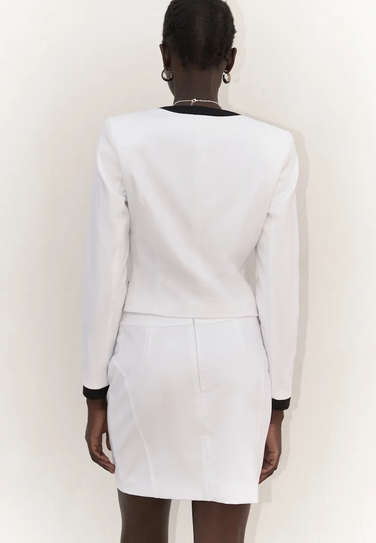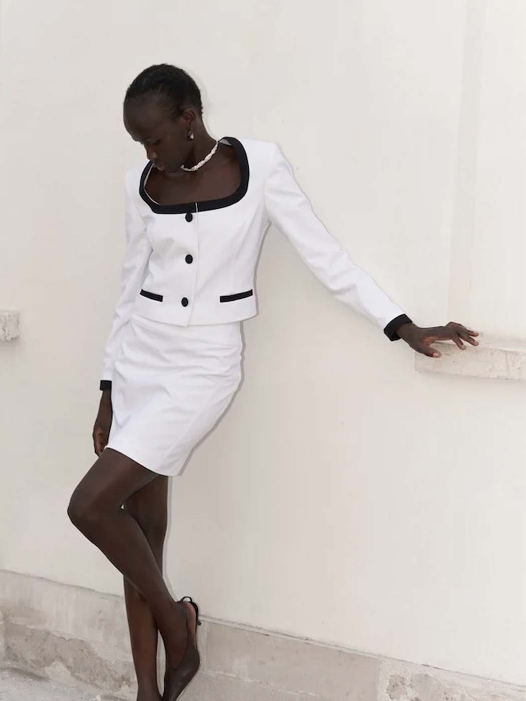 Жакет в черно-белой гамме, с контрастной отделкой и фирменным вырезом, украшенный рядами пуговиц, узнаваем и полон парижского шарма. Его лаконичный силуэт подчеркивает талию, создавая утонченный образ.