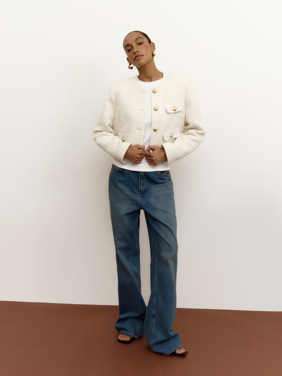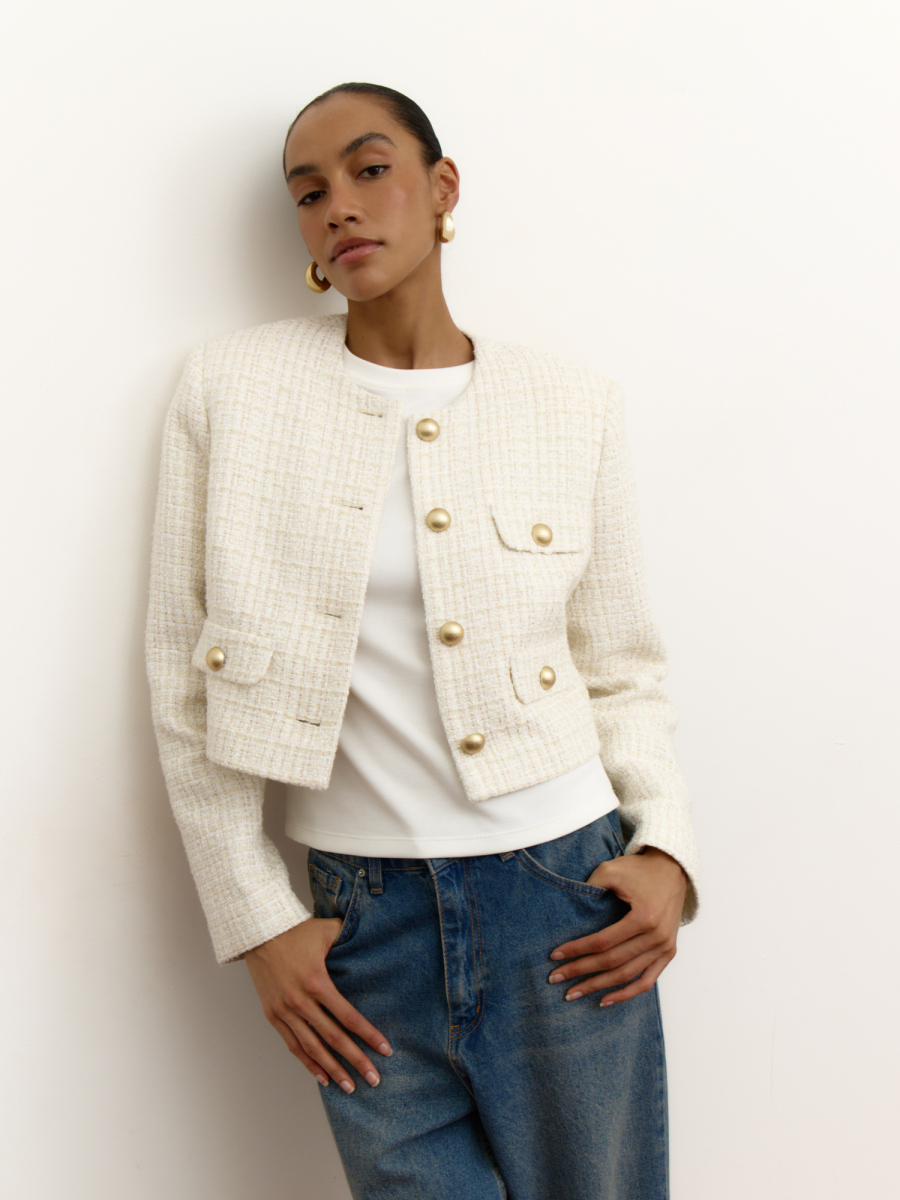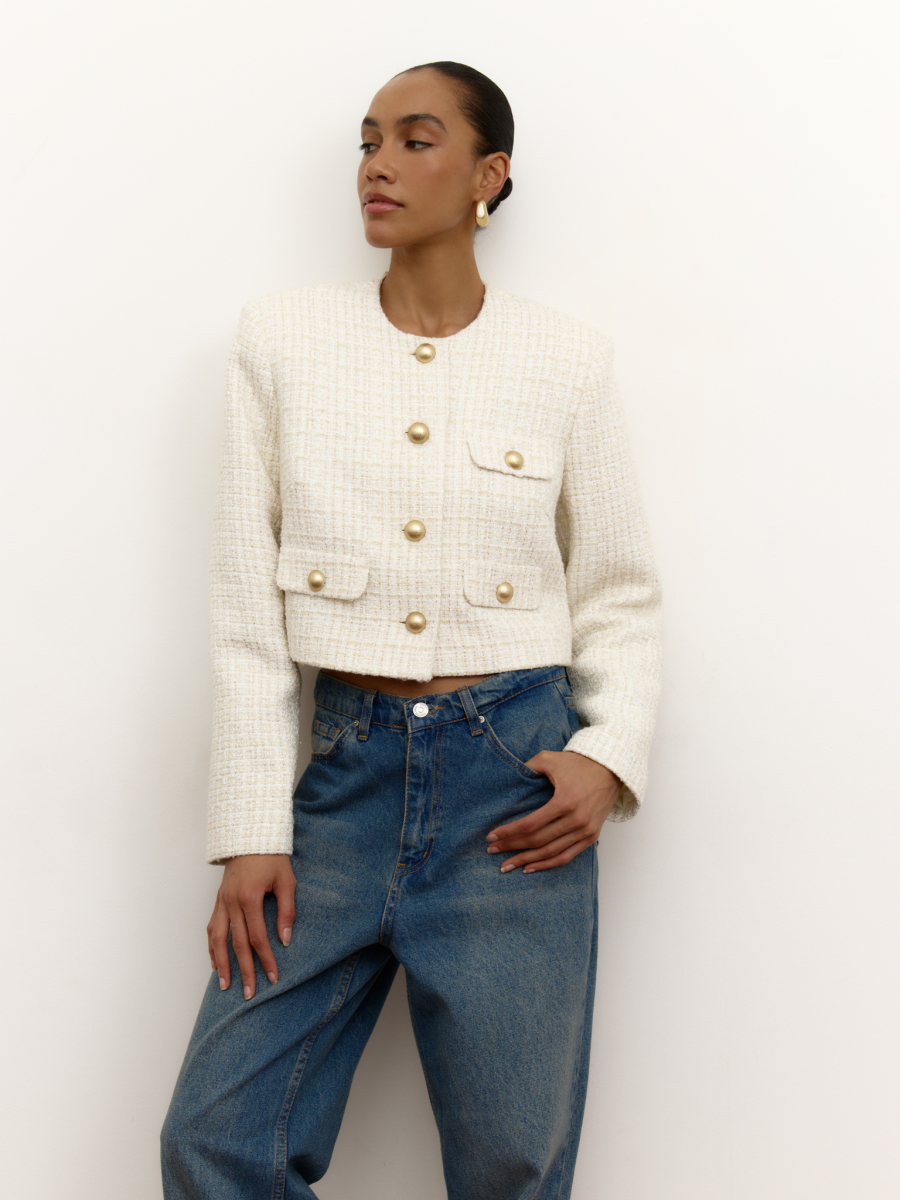 Этот стильный жакет станет вашим лучшим другом! Укороченная модель выполнена из мягкого твида, который идеально держит форму и придает элегантность любому образу. Спереди имеются удобные клапаны, которые добавляют нотку классического стиля. Цвет молочный подойдет как к джинсам, так и к юбке, создавая модный контраст. Подкладка из приятной на ощупь вискозы обеспечит комфорт при носке.