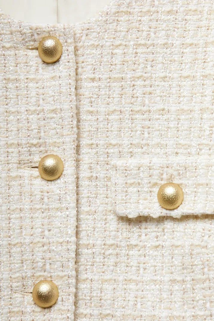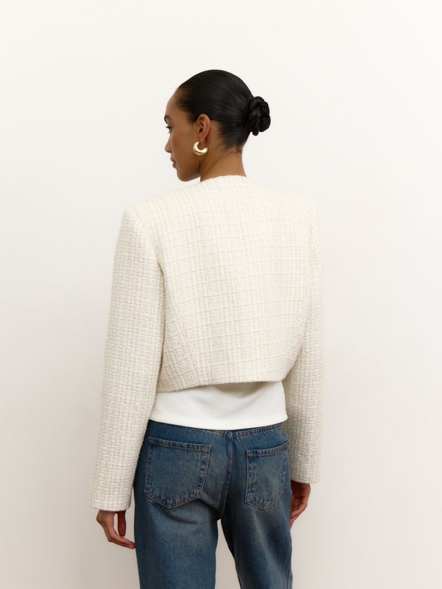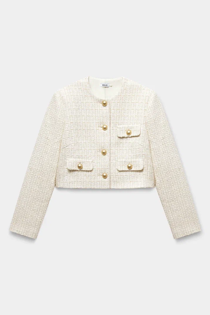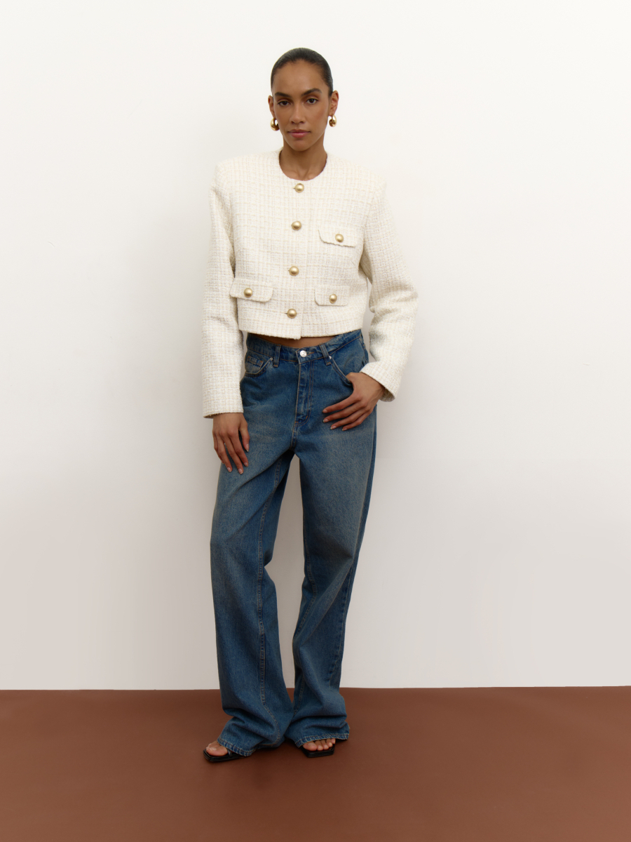 Этот стильный жакет станет вашим лучшим другом! Укороченная модель выполнена из мягкого твида, который идеально держит форму и придает элегантность любому образу. Спереди имеются удобные клапаны, которые добавляют нотку классического стиля. Цвет молочный подойдет как к джинсам, так и к юбке, создавая модный контраст. Подкладка из приятной на ощупь вискозы обеспечит комфорт при носке.