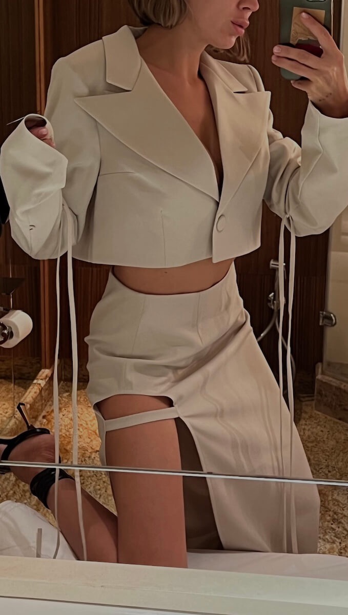 Укороченный бежевый пиджак — это стильный и универсальный элемент гардероба, который легко сочетается с различными предметами одежды. Он станет отличным дополнением к вашему образу и добавит нотку элегантности. Например, вы можете надеть его с юбкой с разрезом, чтобы создать модный и женственный ансамбль.