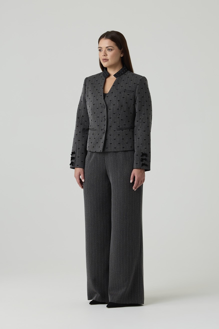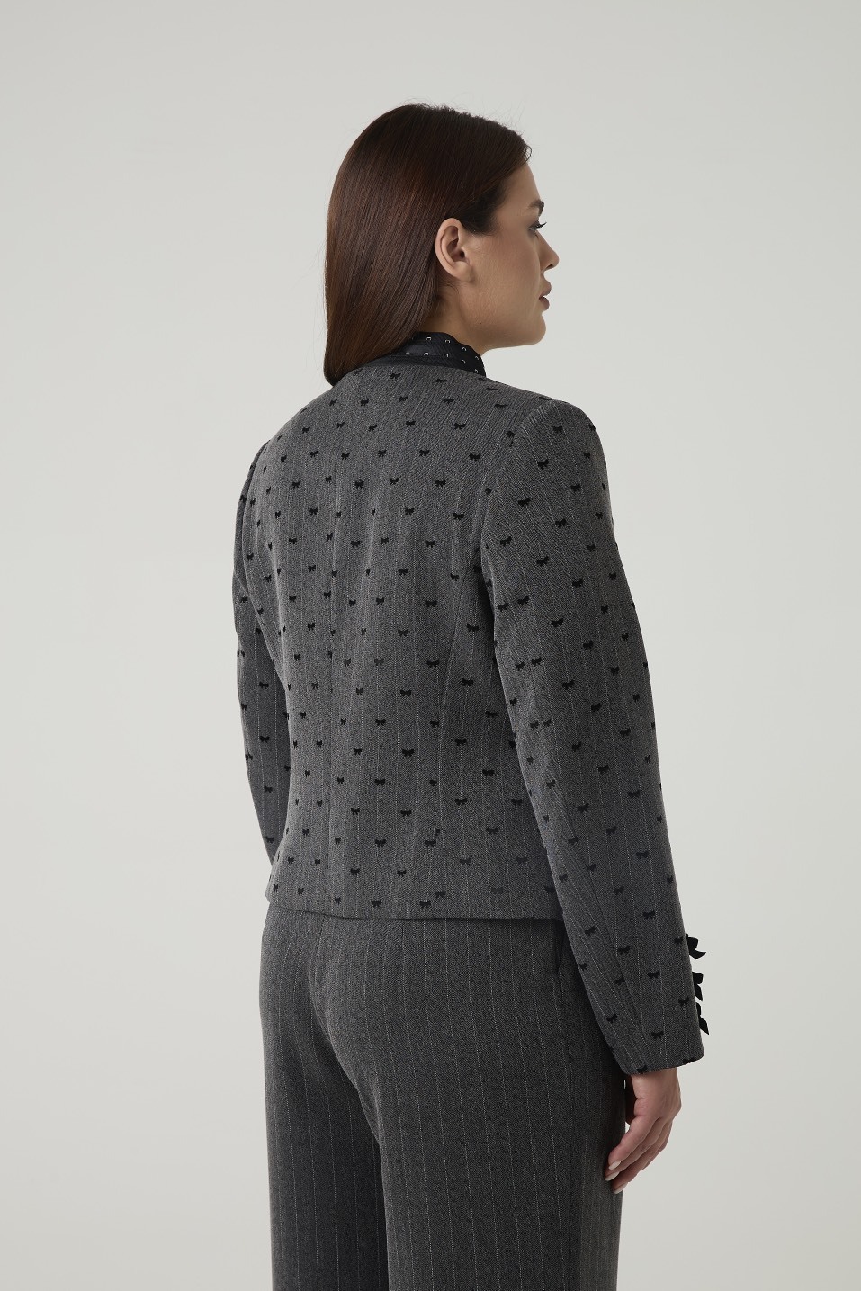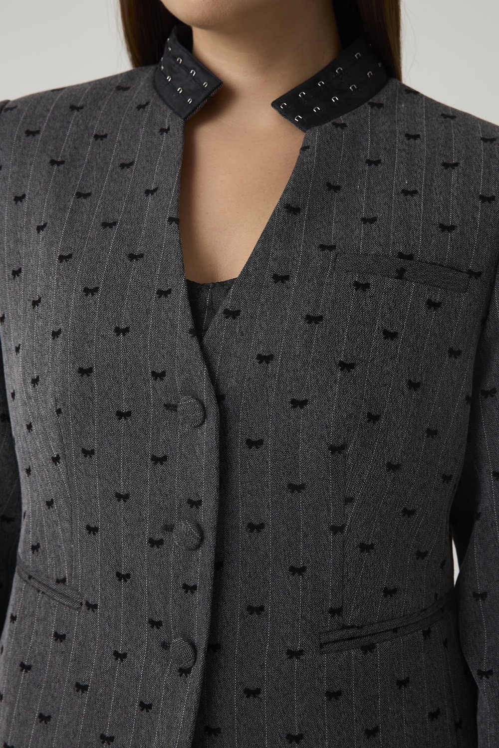 Женский пиджак прямого силуэта из серой ткани с тонкой полоской и мелким черным узором в виде бантиков. Застежка — однобортная на четыре пуговицы, обтянутые тканью в тон жакета. Спинка гладкая, без швов и декоративных элементов.