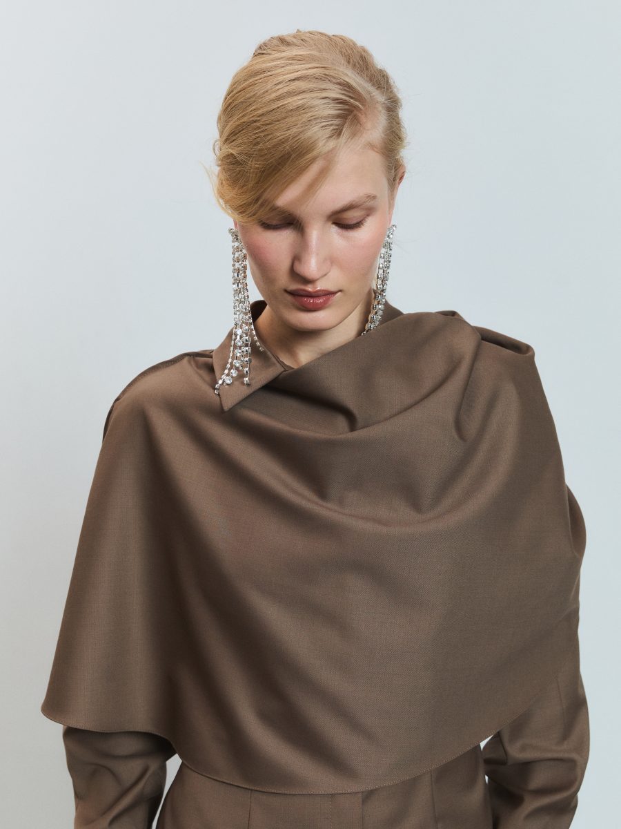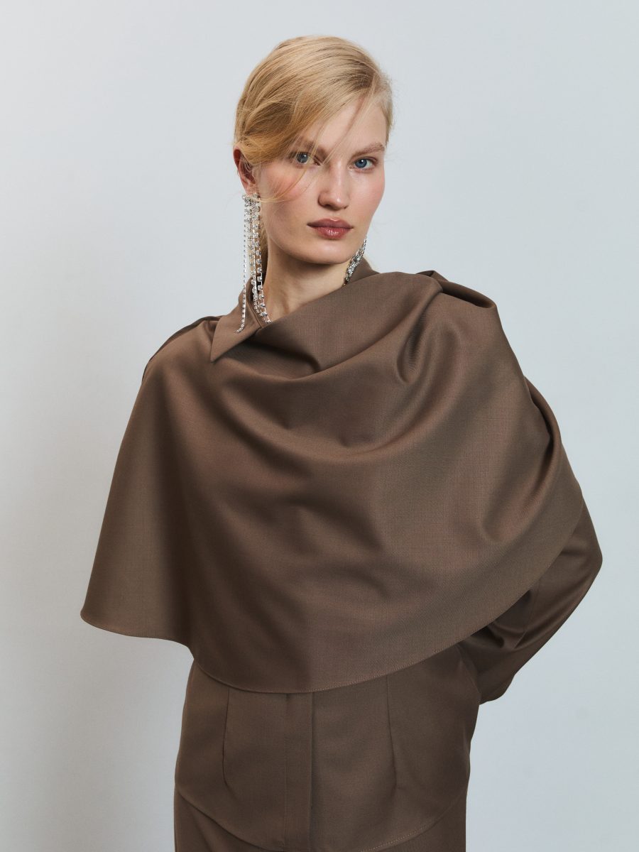 Кейп Wind выполнен из тонкой гладкой шерсти в оттенке тауп. Имеет застежку на две пуговицы. Рекомендуем стилизовать с рубашкой и юбкой Wind.